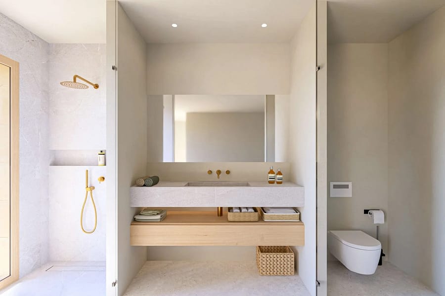 The interior layout reflects both style and function. The three en-suite bedrooms offer peaceful sanctuaries filled with natural light, enhanced by stone and wood textures. That reflect local craftsmanship. The master suite includes a south-facing private terrace and a spa-style bathroom with a freestanding tub and elegant neutral tones.