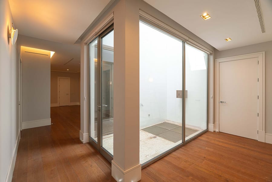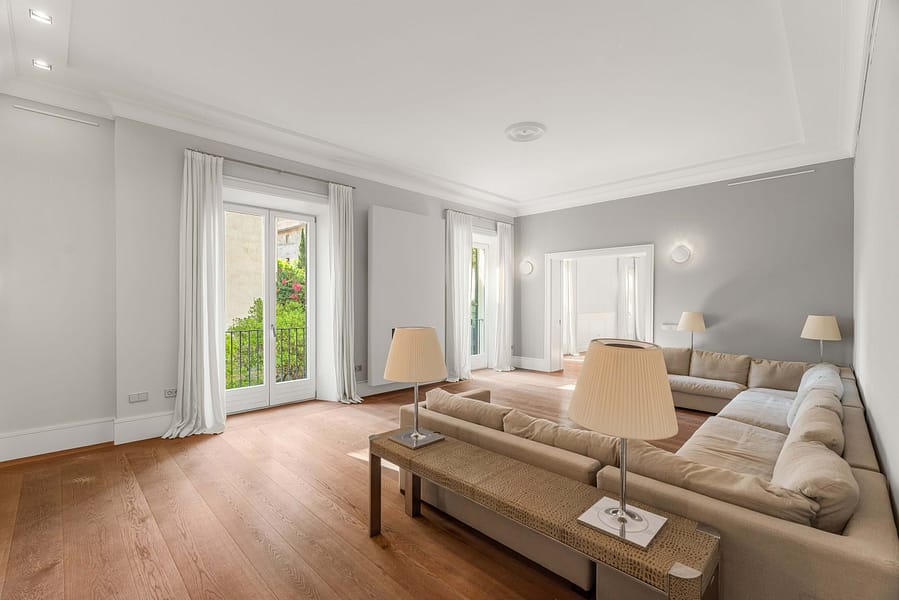 The journey begins through a stately entrance hall leading into a suite of grand reception rooms. Where soaring ceilings and minimalist architectural lighting define the aesthetic. The primary living area, centered around a sleek modern fireplace, flows effortlessly through tall. White-curtained French doors that open to tranquil views over lush private greenery.
