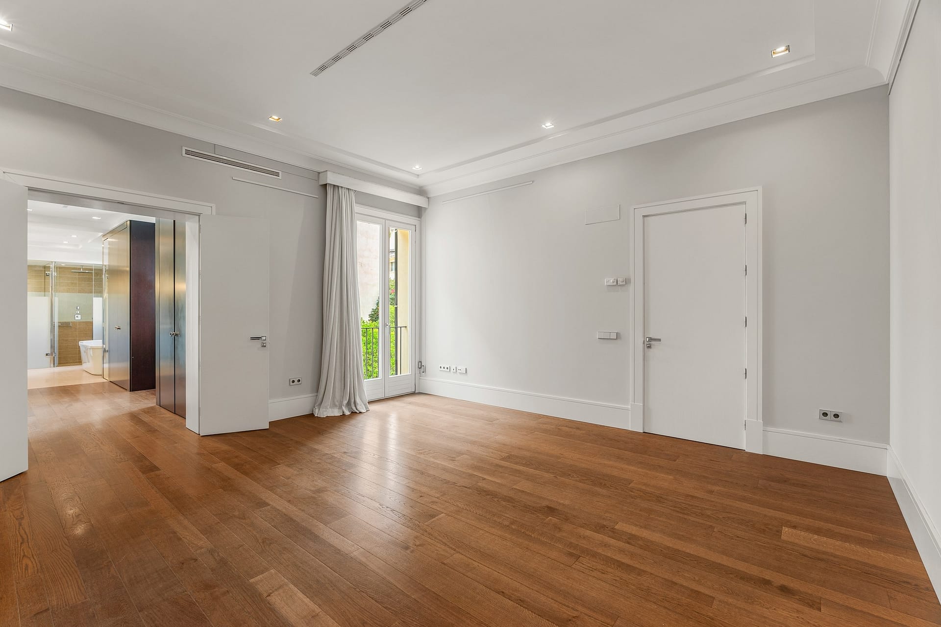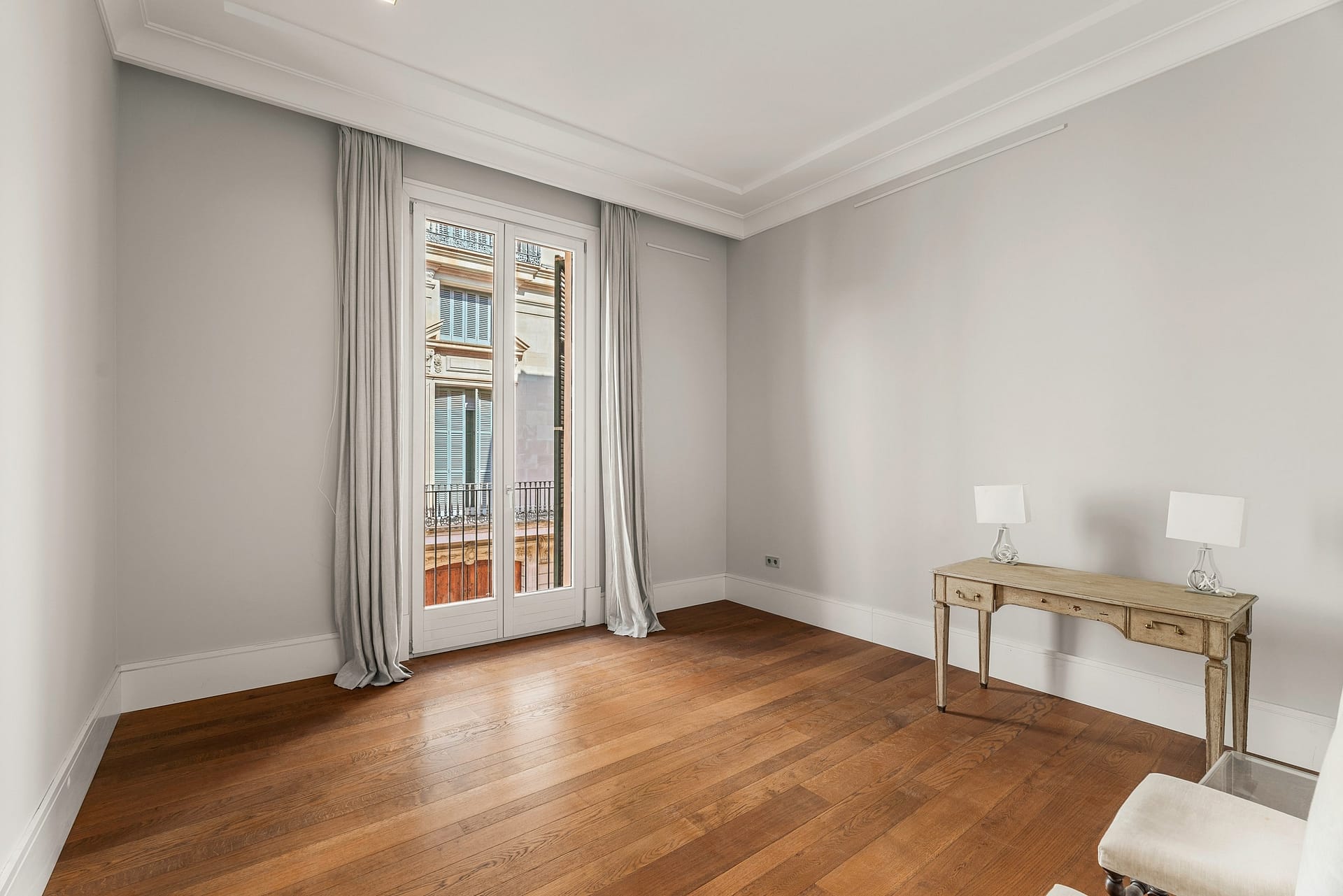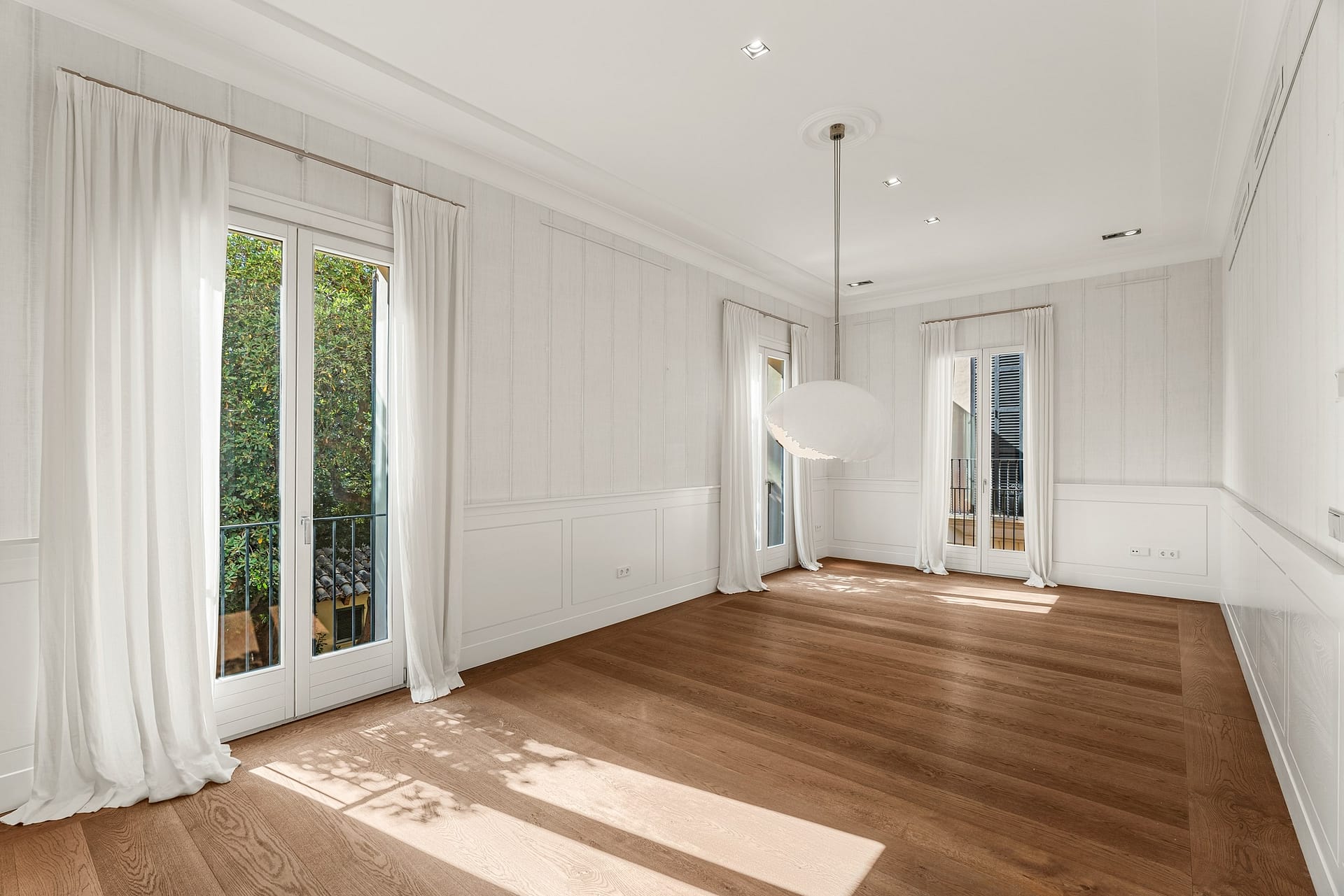 Experience the pinnacle of Mediterranean elegance in this magnificent 406sqm noble floor residence, situated within a prestigious 150-year-old estate in the sought-after San Jaime quarter of the Old Town. This imposing property seamlessly blends its storied heritage with a meticulous renovation, resulting in a home characterized by majestic proportions and a clean, sophisticated design. The journey begins through a stately entrance hall leading into a suite of grand reception rooms, where soaring ceilings and minimalist architectural lighting define the aesthetic. The primary living area, centered around a sleek modern fireplace, flows effortlessly through tall, white-curtained French doors that open to tranquil views over lush private greenery.