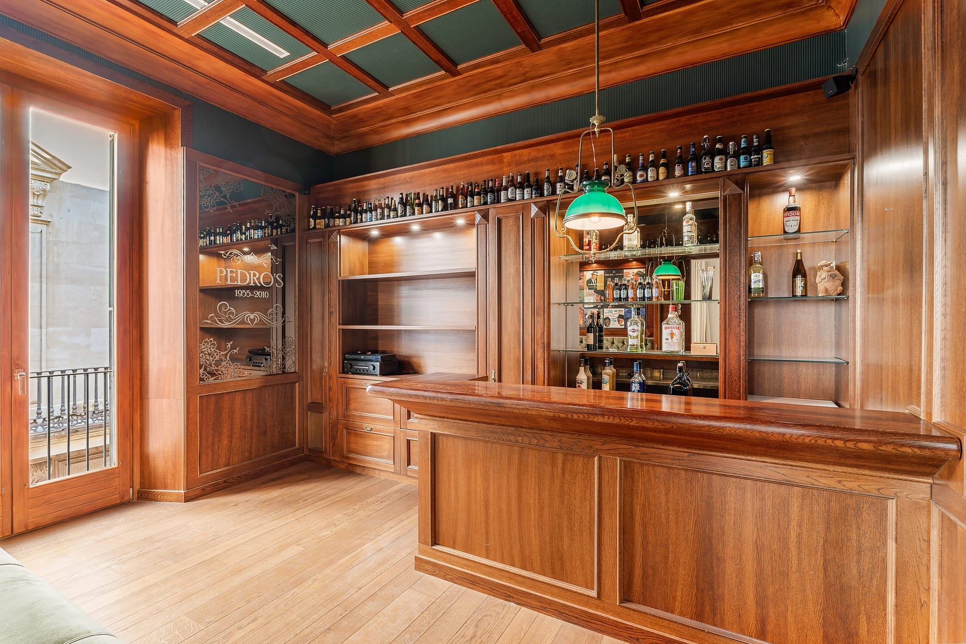 The living quarters are equally impressive, featuring an expansive master sanctuary with a luxurious en-suite bathroom that boasts a deep soaking tub and separate rain shower set against elegant sage-green plasterwork. Two additional well-appointed bedrooms offer the privacy of en-suite facilities, while a professional-grade kitchencomplete with a massive white waterfall island and high-end stainless steel ventilationstands ready for the most discerning chef. For social gatherings, a secondary lounge reveals a breathtaking original full bar, richly paneled in warm wood with an intricate coffered ceiling and vintage-style lighting, providing a nostalgic, dedicated environment for entertaining guests. Bathed in natural light through towering floor-to-ceiling windows and featuring a unique glass-walled internal patio, the residence is finished with a refined combination of wide-plank solid wooden floors and high-quality stone tiling. This rare architectural treasure offers the added convenience of elevator access and an included parking space nearby, representing a premier opportunity for luxury living in a truly prime location.