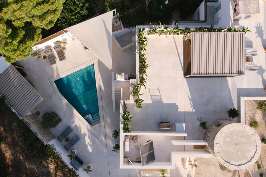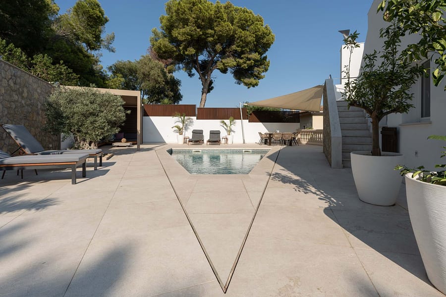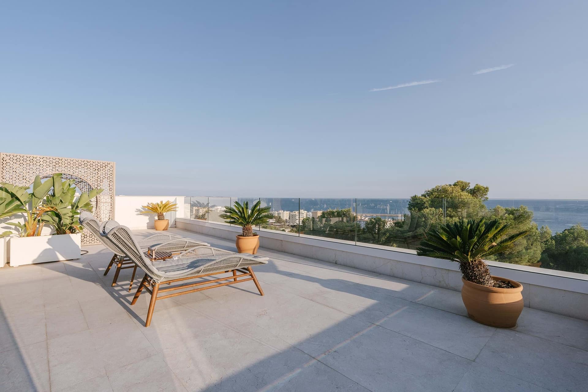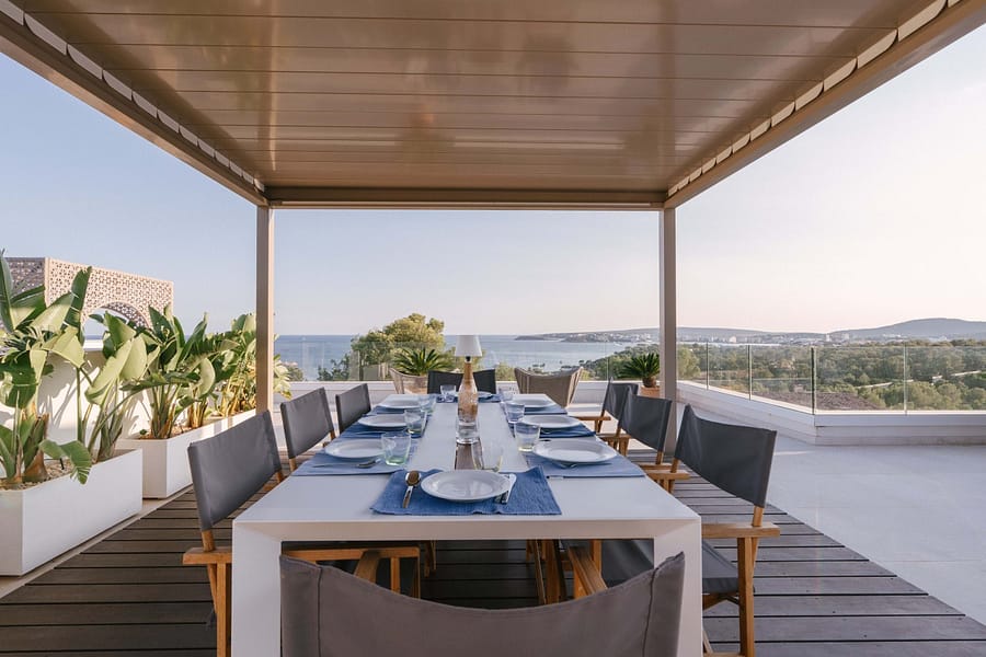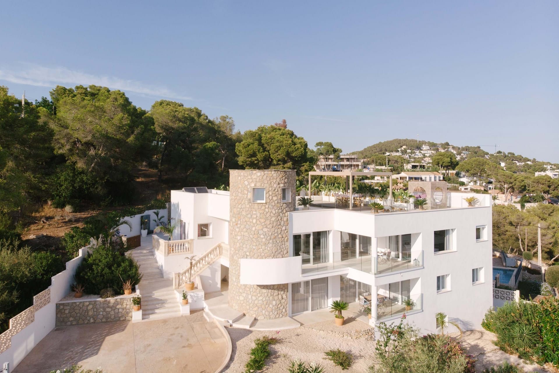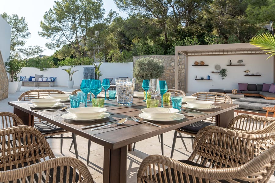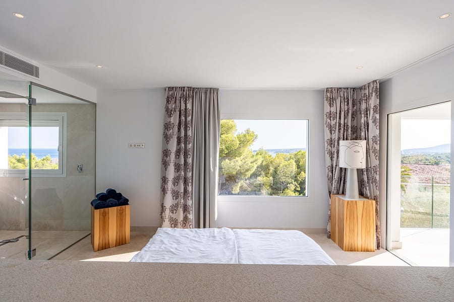 This spectacular, fully renovated villa in the exclusive Costa den Blanes offers a sophisticated mid-term retreat with breathtaking sea views. Spanning 501 sqm, the residence is designed for both connection and privacy, featuring a versatile layout split across two floors and a unique rooftop tower. The main level serves as the heart of the home, boasting a light-filled living area that flows seamlessly onto a terrace with a private swimming pool, built-in barbecue, and a covered chill-out space. Ascending to the rooftop, guests are greeted by a Balinese daybed and an additional kitchen within a charming round tower, providing the perfect vantage point for Mallorcas famous sunsets.