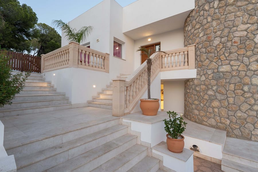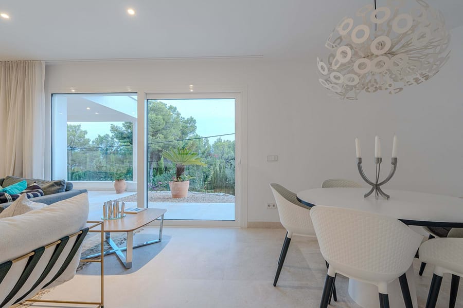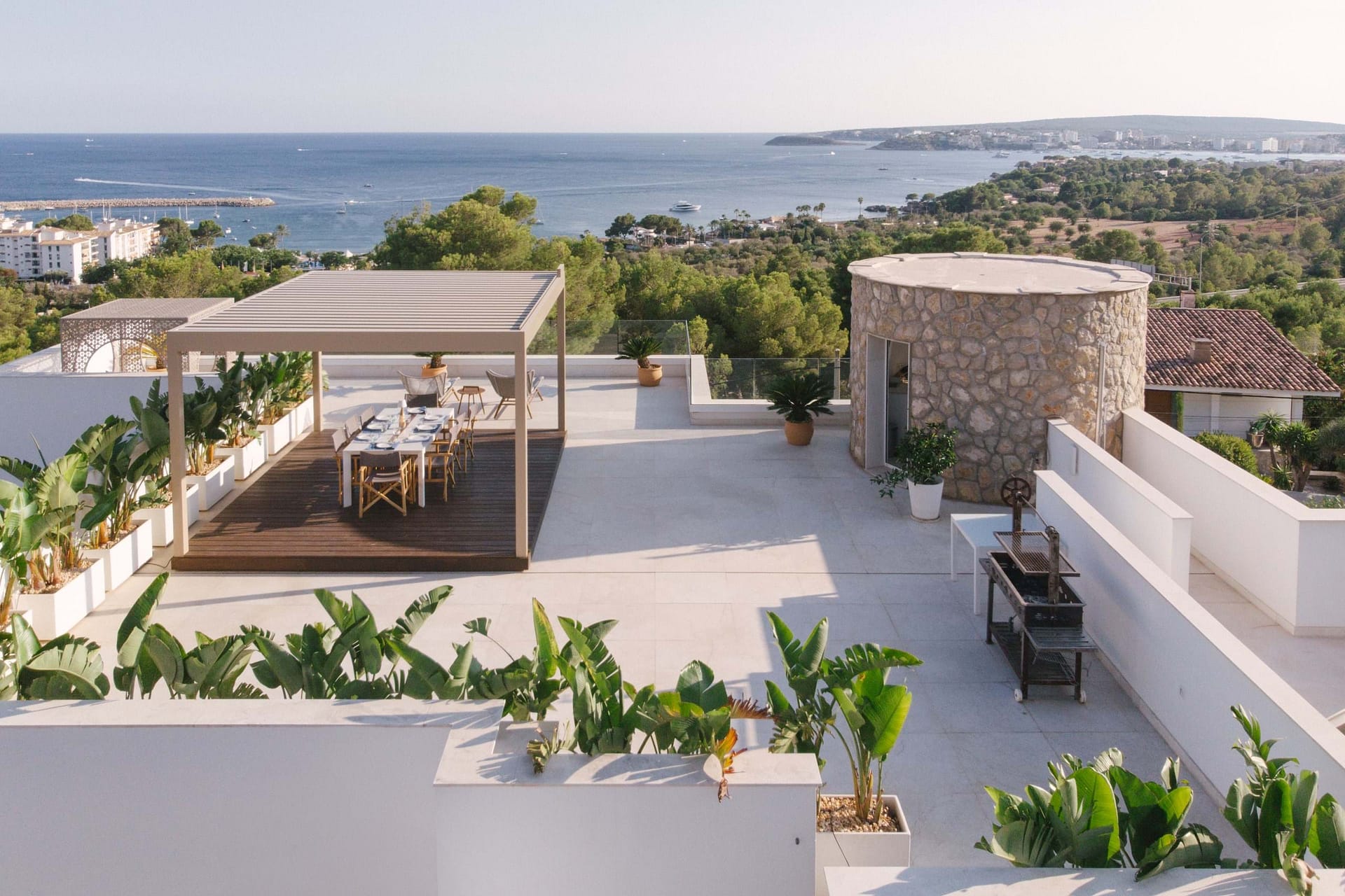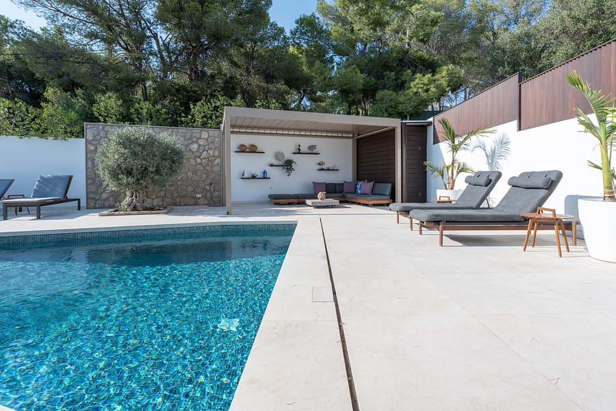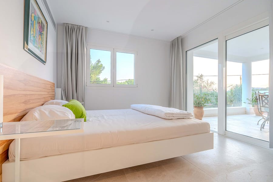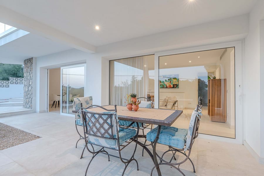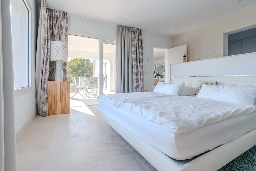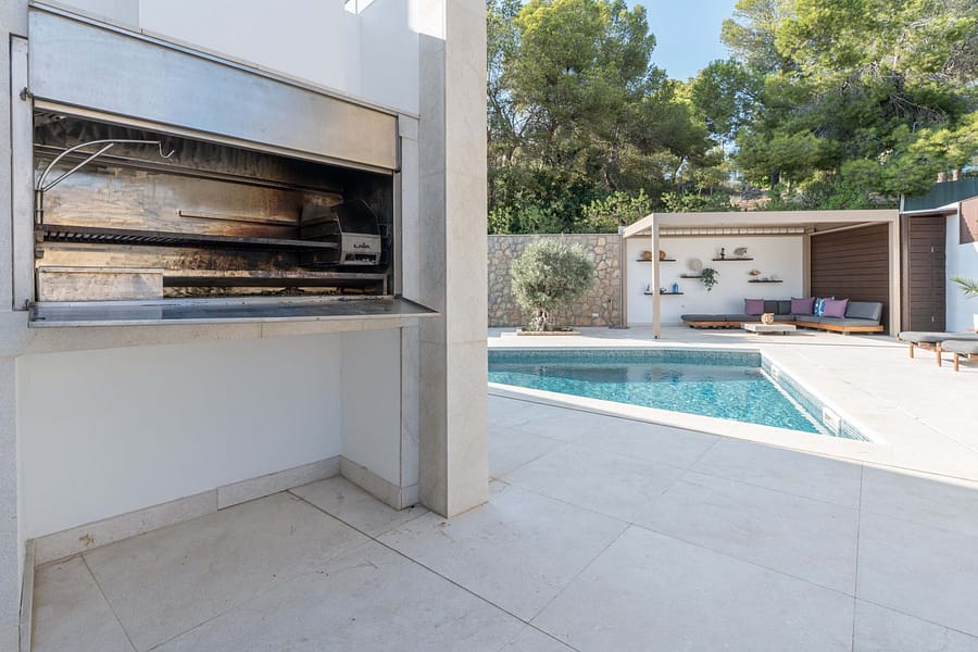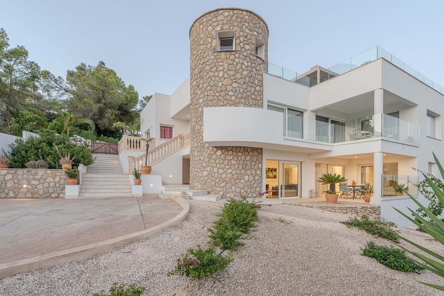 This spectacular, fully renovated villa in the exclusive Costa den Blanes offers a sophisticated mid-term retreat with breathtaking sea views. Spanning 501 sqm, the residence is designed for both connection and privacy, featuring a versatile layout split across two floors and a unique rooftop tower. The main level serves as the heart of the home, boasting a light-filled living area that flows seamlessly onto a terrace with a private swimming pool, built-in barbecue, and a covered chill-out space. Ascending to the rooftop, guests are greeted by a Balinese daybed and an additional kitchen within a charming round tower, providing the perfect vantage point for Mallorcas famous sunsets.