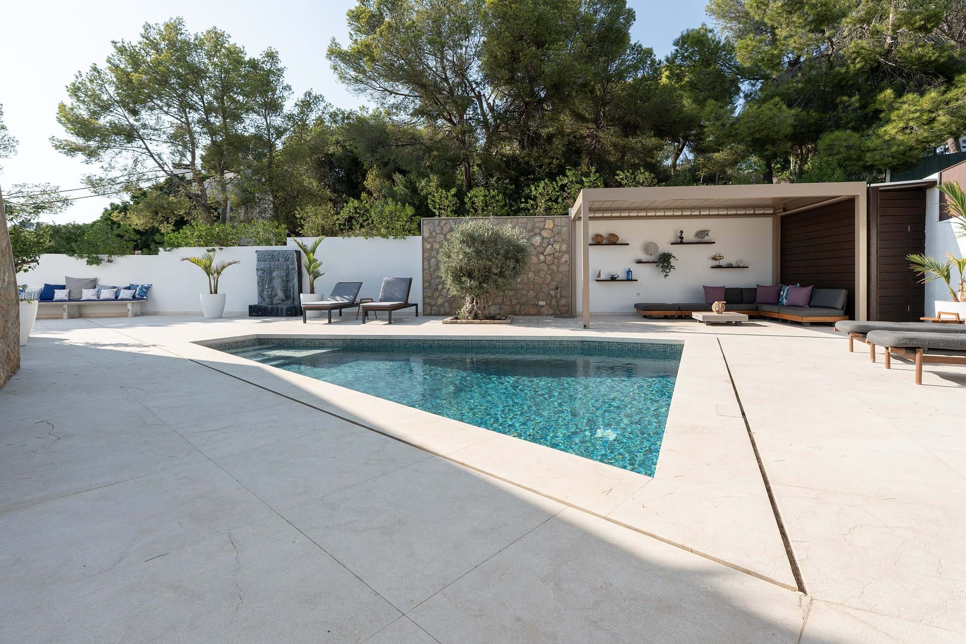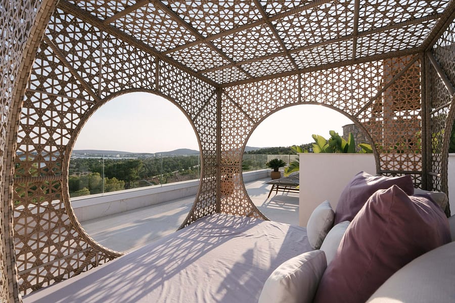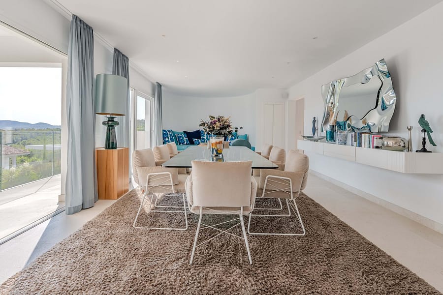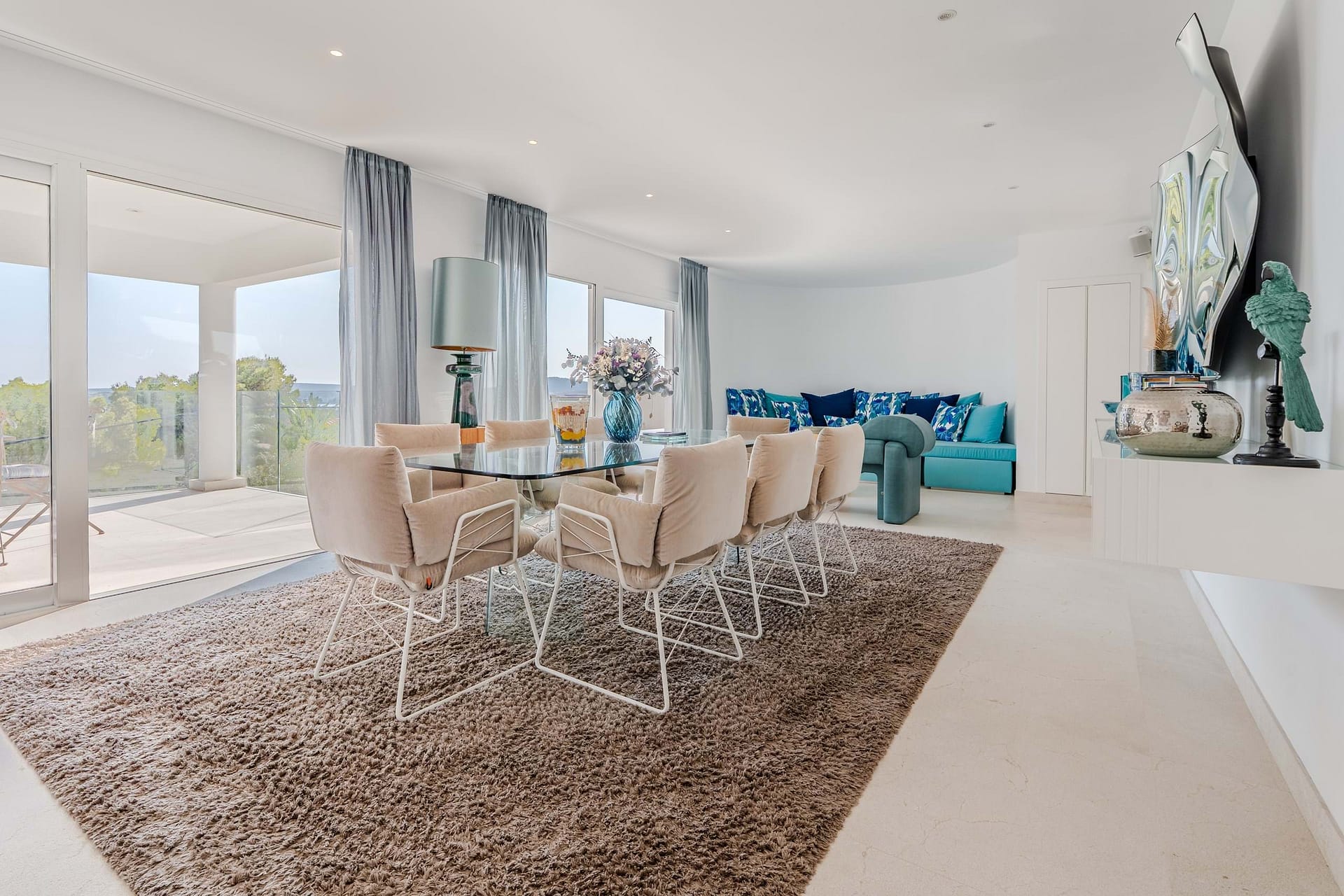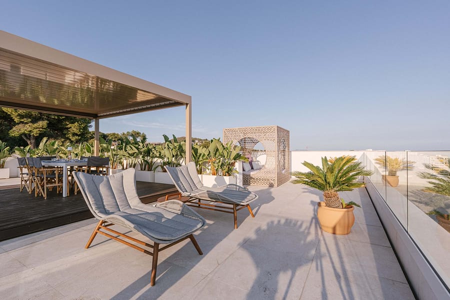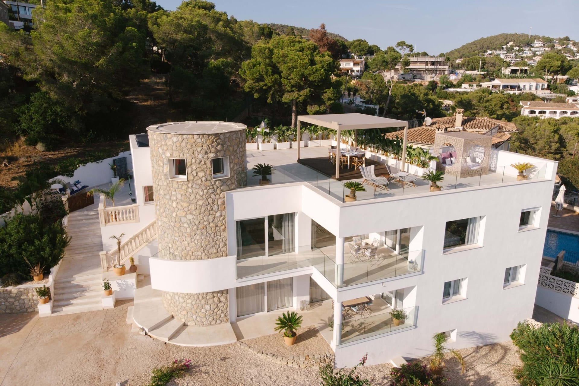 This spectacular, fully renovated villa in the exclusive Costa den Blanes offers a sophisticated mid-term retreat with breathtaking sea views. Spanning 501 sqm, the residence is designed for both connection and privacy, featuring a versatile layout split across two floors and a unique rooftop tower. The main level serves as the heart of the home, boasting a light-filled living area that flows seamlessly onto a terrace with a private swimming pool, built-in barbecue, and a covered chill-out space. Ascending to the rooftop, guests are greeted by a Balinese daybed and an additional kitchen within a charming round tower, providing the perfect vantage point for Mallorcas famous sunsets.