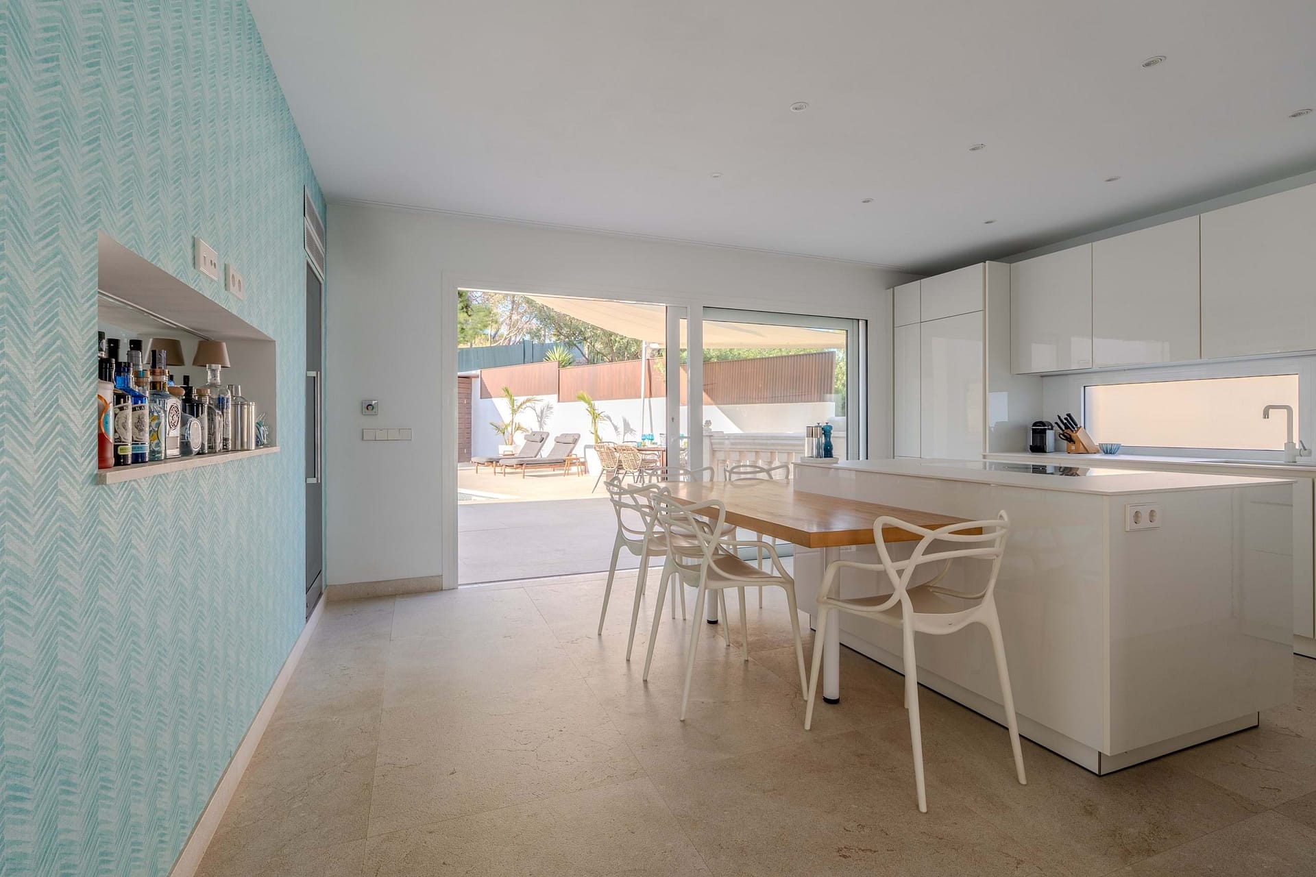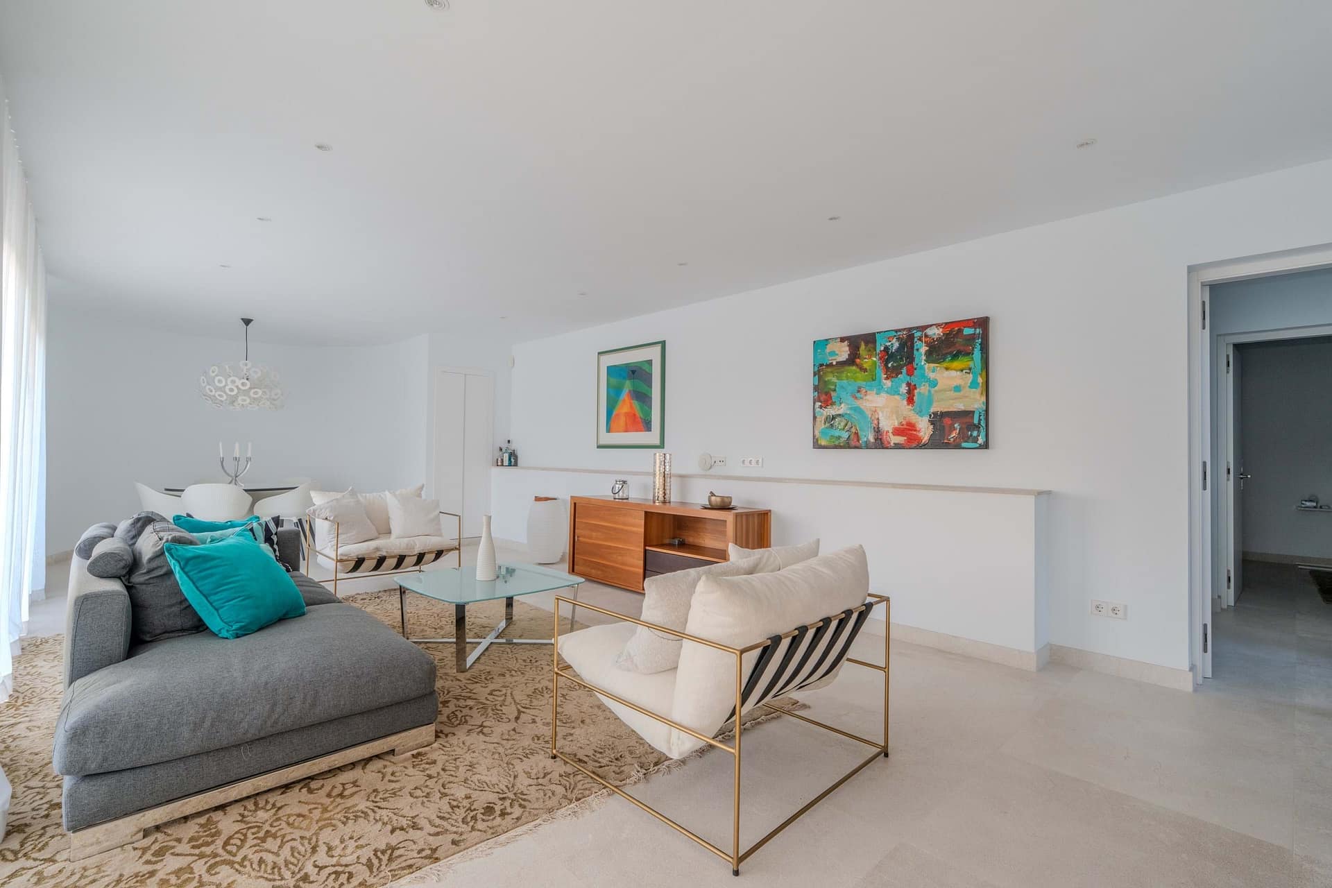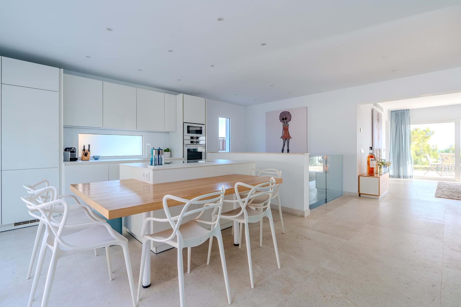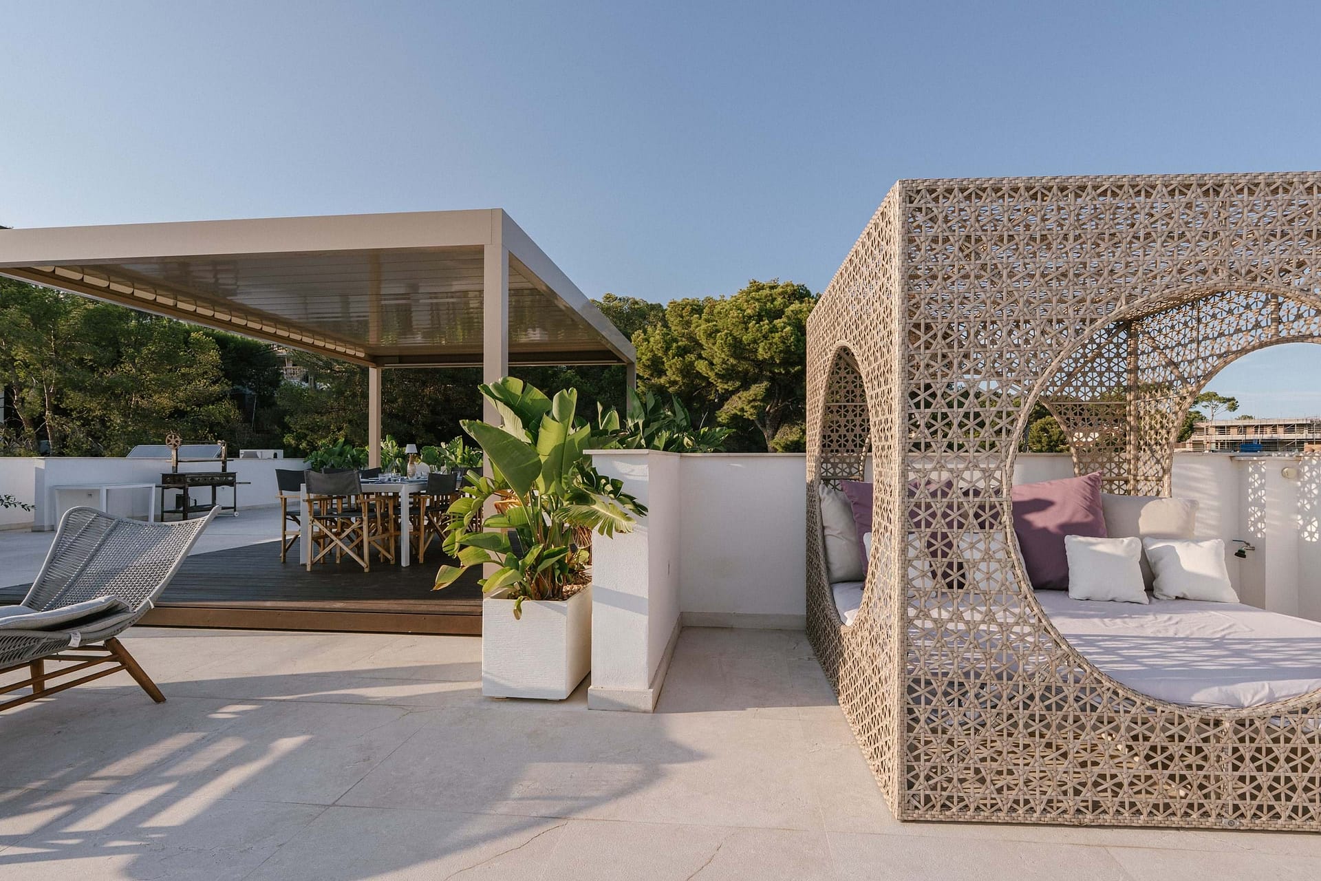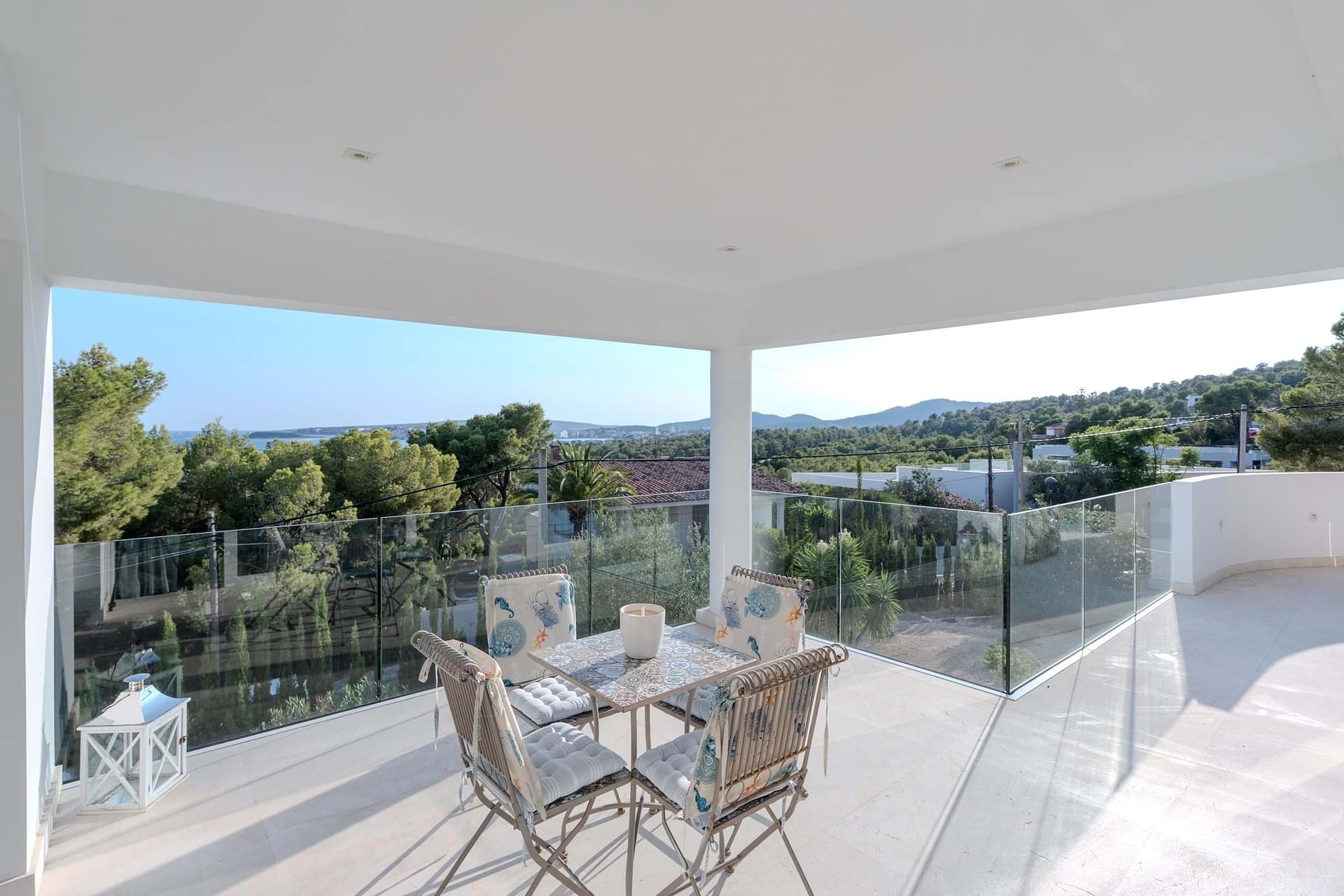 This spectacular, fully renovated villa in the exclusive Costa den Blanes offers a sophisticated mid-term retreat with breathtaking sea views. Spanning 501 sqm, the residence is designed for both connection and privacy, featuring a versatile layout split across two floors and a unique rooftop tower. The main level serves as the heart of the home, boasting a light-filled living area that flows seamlessly onto a terrace with a private swimming pool, built-in barbecue, and a covered chill-out space. Ascending to the rooftop, guests are greeted by a Balinese daybed and an additional kitchen within a charming round tower, providing the perfect vantage point for Mallorcas famous sunsets.