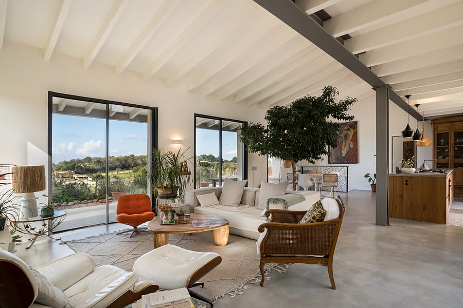 Set among rolling hills, this exceptional property, built in 2019, combines traditional Mediterranean character with refined modern design. The 311 m² main residence features floor-to-ceiling sliding pocket doors that open fully to the surrounding landscape, flooding the interiors with natural light. The open-plan kitchen, dining, and lounge area forms the heart of the home, alongside a cozy fireplace, while underfloor heating ensures year-round comfort throughout. A garage and 70 m² basement provide practical parking and storage.