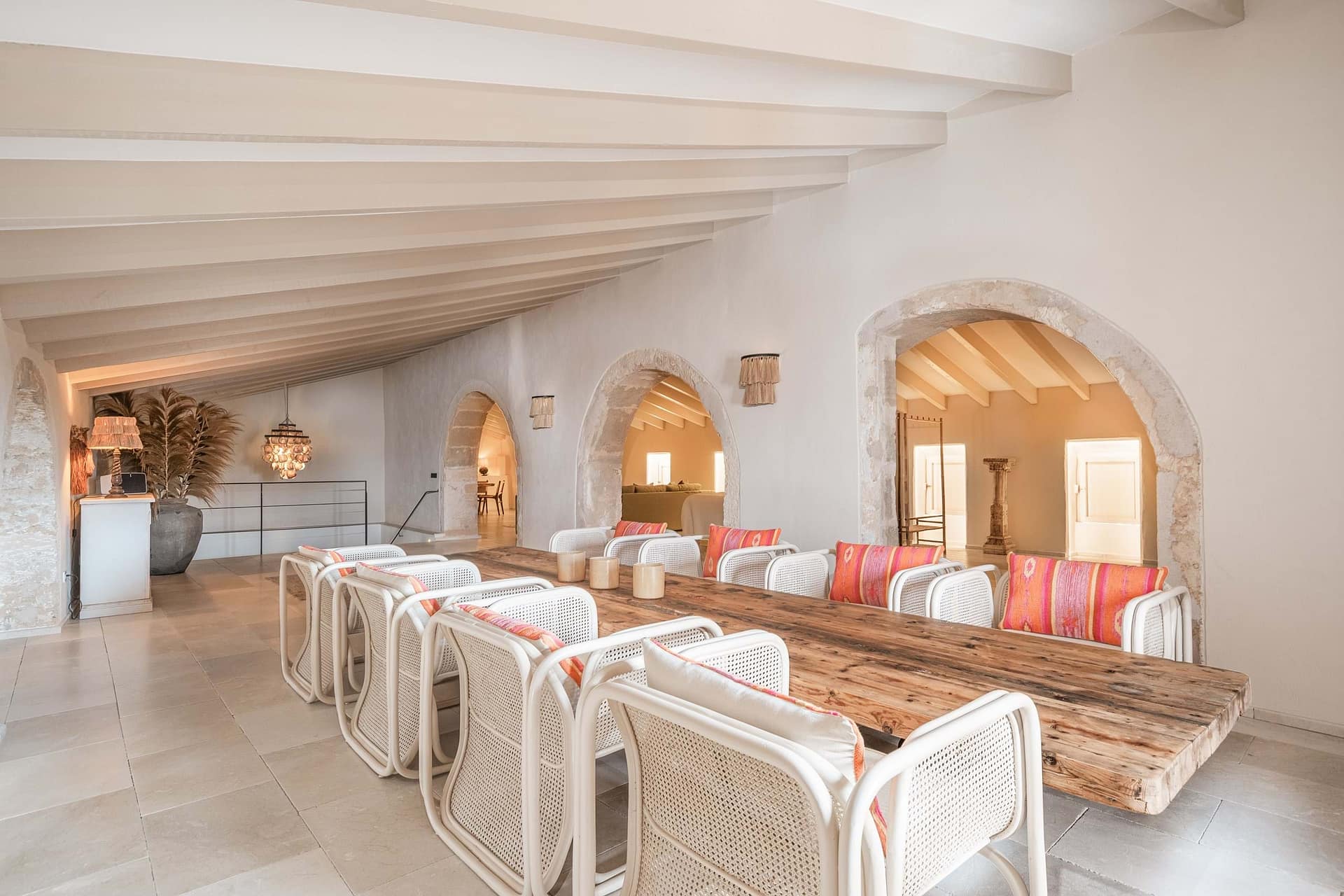 The estate is centered around a beautifully landscaped courtyard that features a large outdoor swimming pool, a summer kitchen, and multiple terraces, creating an idyllic setting to enjoy Mallorcas Mediterranean lifestyle. Thoughtfully restored in 2022, the property preserves its historic character with traditional details such as hydraulic floors, exposed wooden beams, and heavy wooden doors, all complemented by soaring ceilings that evoke a sense of grandeur.