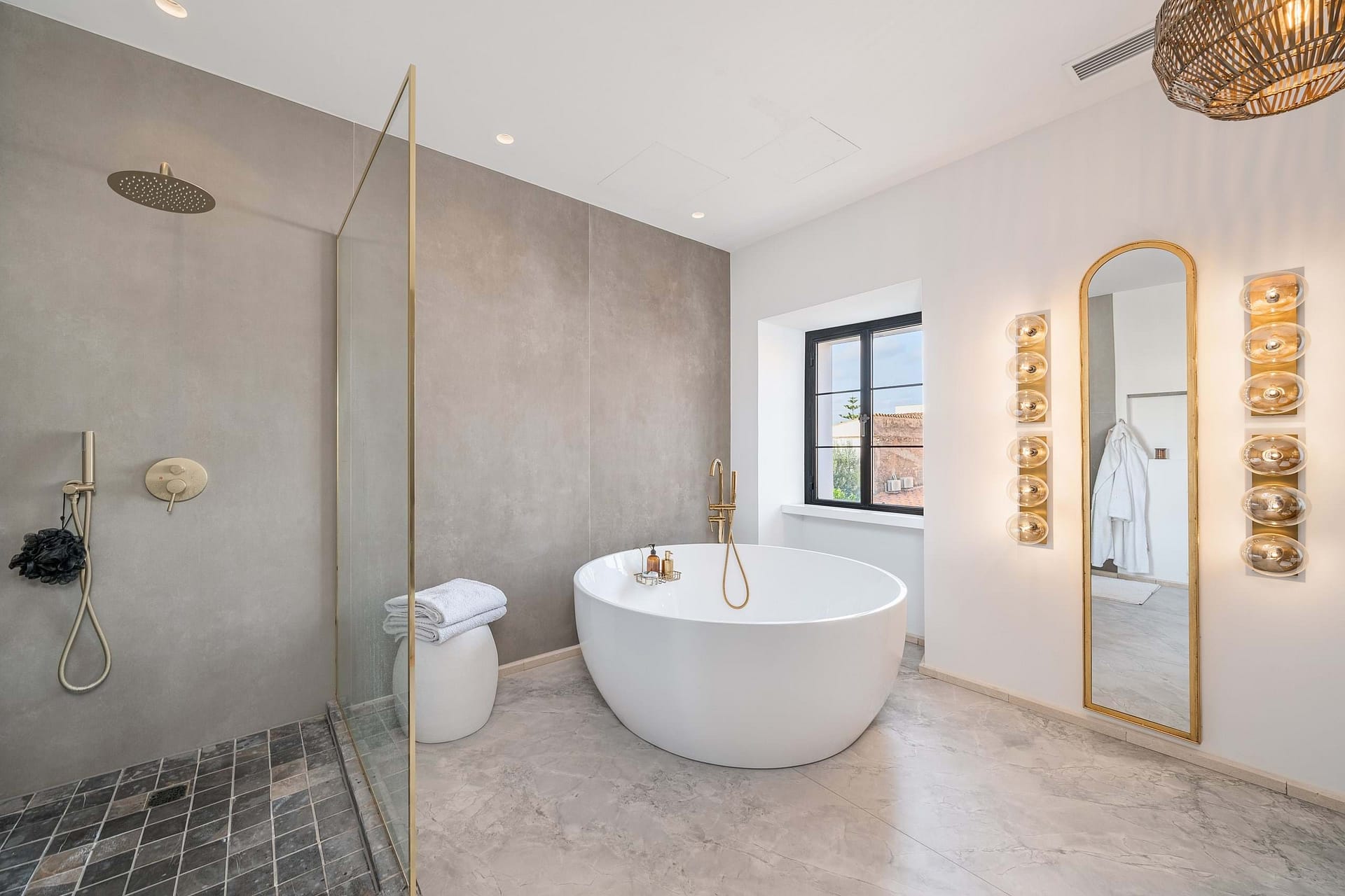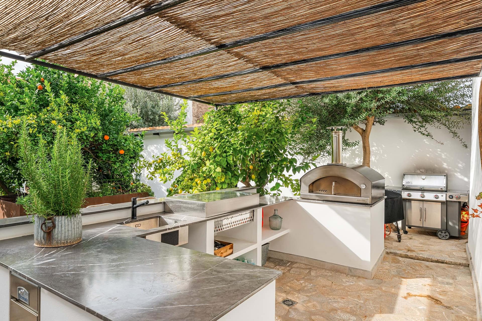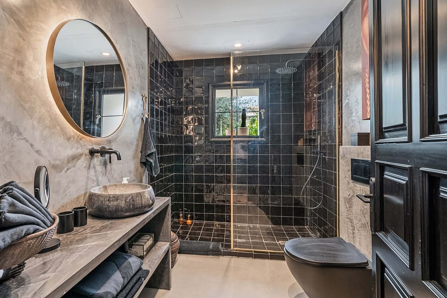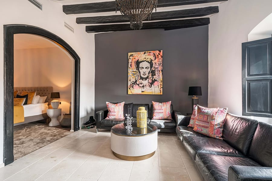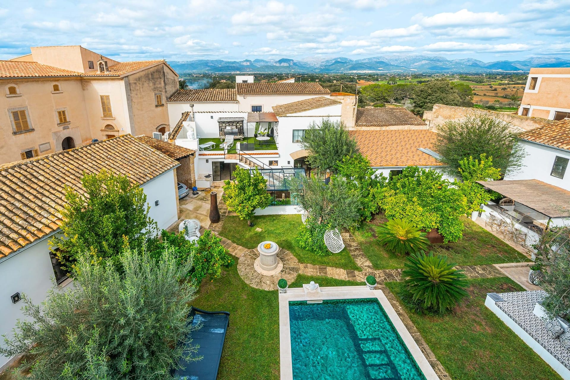 The main house spans three floors and includes six bedrooms and six bathrooms, along with a variety of spacious and versatile living areas. Three living rooms, a dance hall, a bar, a TV room, and three dressing rooms offer endless possibilities for relaxation and entertainment. The fully equipped kitchen, complete with a dining area, is perfect for hosting gatherings, while the sprawling attic floor offers limitless potential for creative use, whether as an event space, yoga studio, or additional bedroom. The roof terrace crowns the home, providing breathtaking views of the Tramuntana mountains and the charming village of Sencelles.