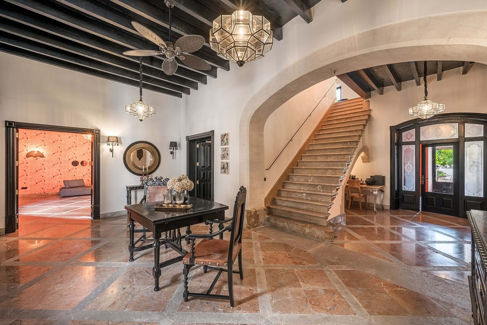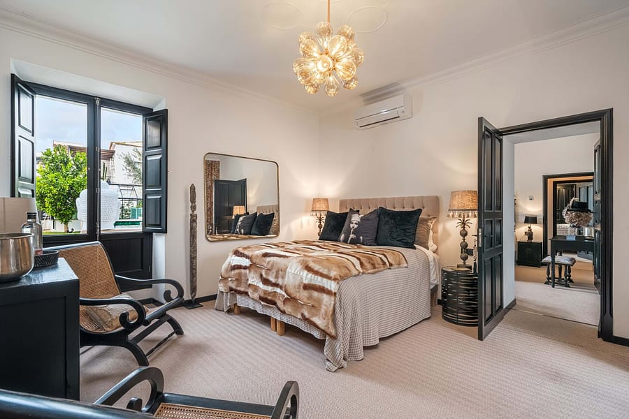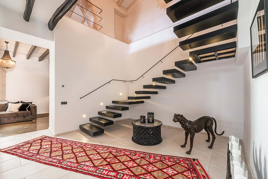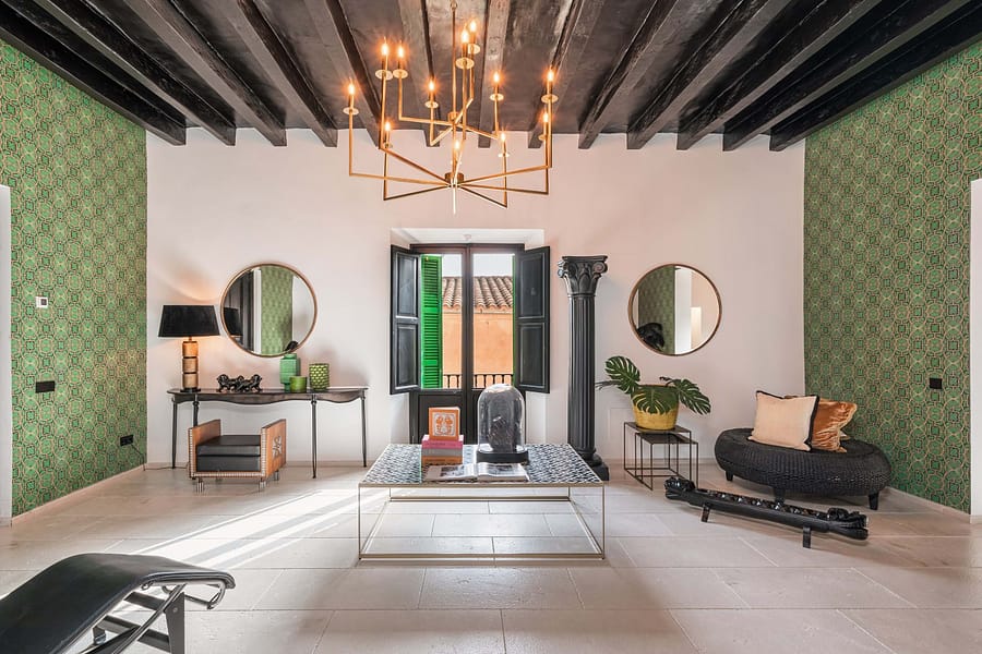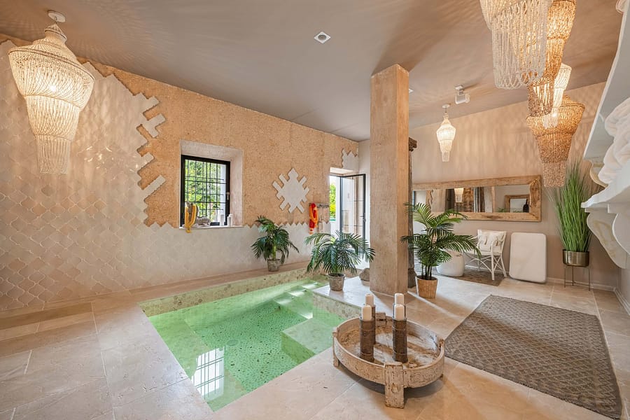 The estate is centered around a beautifully landscaped courtyard that features a large outdoor swimming pool, a summer kitchen, and multiple terraces, creating an idyllic setting to enjoy Mallorcas Mediterranean lifestyle. Thoughtfully restored in 2022, the property preserves its historic character with traditional details such as hydraulic floors, exposed wooden beams, and heavy wooden doors, all complemented by soaring ceilings that evoke a sense of grandeur.