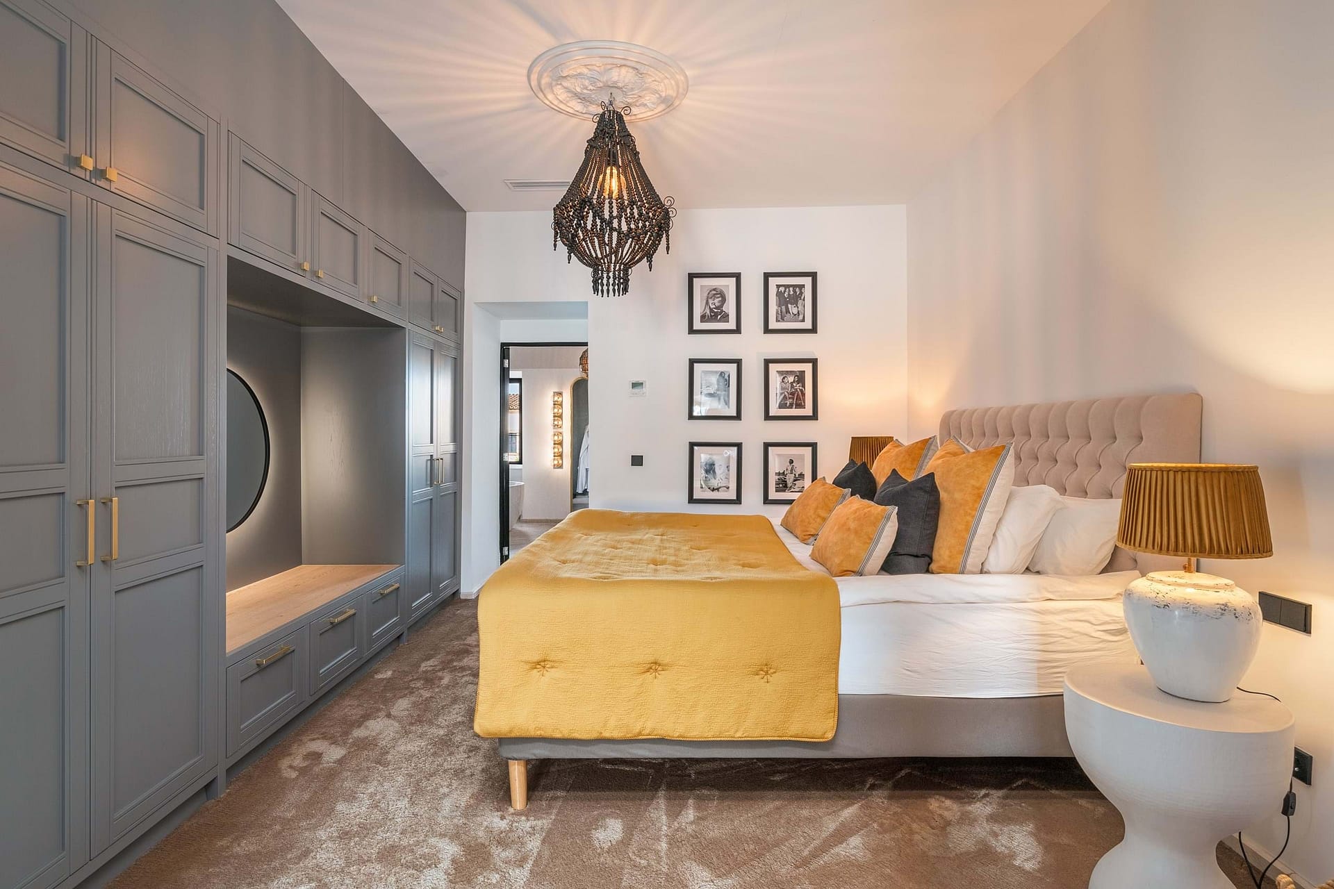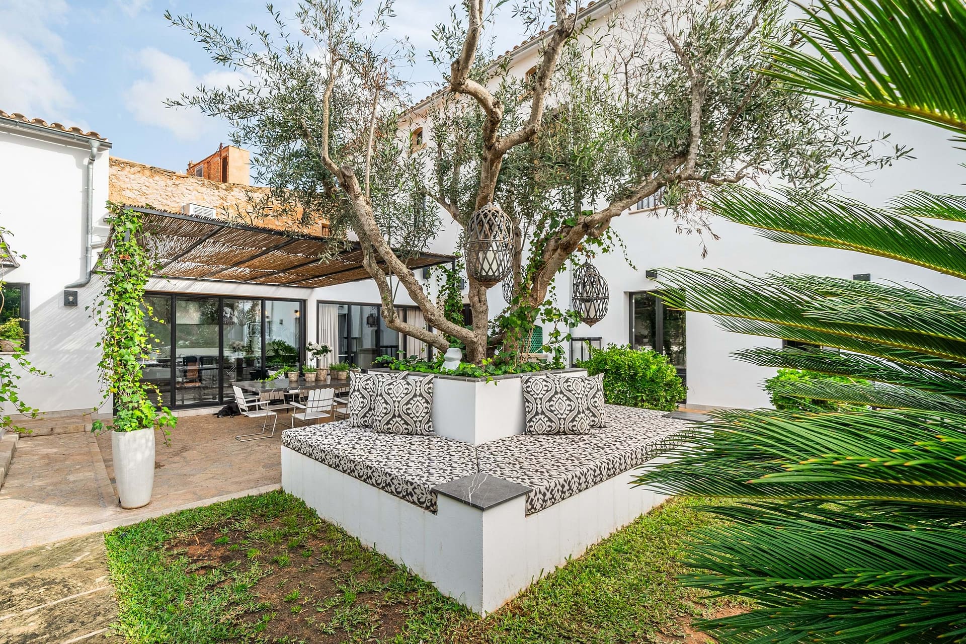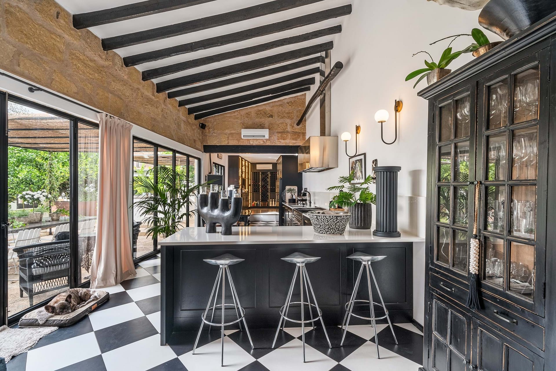 The estate is centered around a beautifully landscaped courtyard that features a large outdoor swimming pool, a summer kitchen, and multiple terraces, creating an idyllic setting to enjoy Mallorcas Mediterranean lifestyle. Thoughtfully restored in 2022, the property preserves its historic character with traditional details such as hydraulic floors, exposed wooden beams, and heavy wooden doors, all complemented by soaring ceilings that evoke a sense of grandeur.