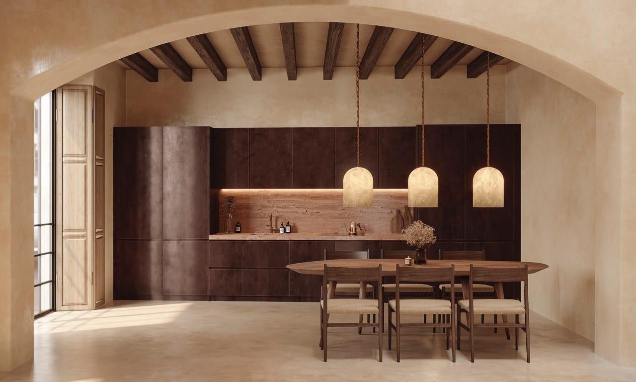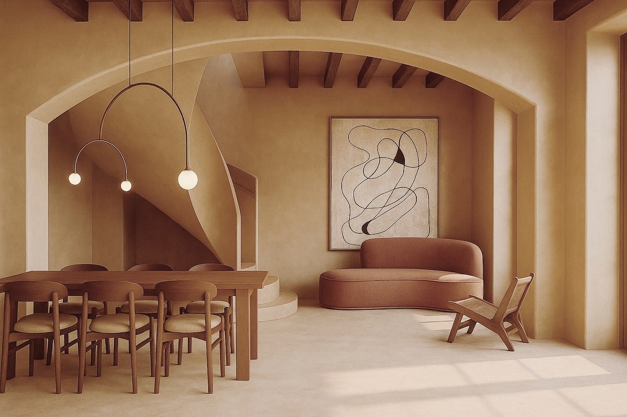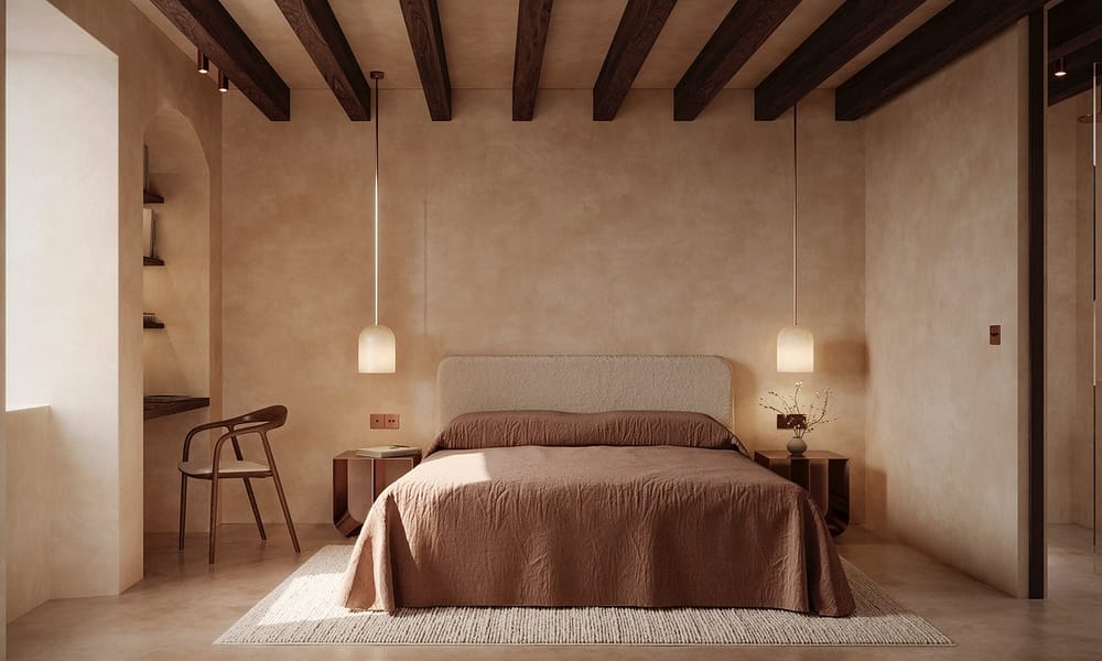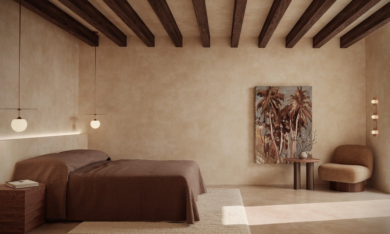 Each of the three bedrooms has been conceived as a restorative retreat. The full-floor master suite is bathed in natural light and finished in warm, tactile materials that foster rest and privacy. All bedrooms are furnished with 100 percent organic natural latex mattresses by Kipli, offering chemical-free sleep comfort and ergonomic support. Artisan pieces sourced from Mallorca, France, and Poland complement bespoke carpentry, natural stone details, and organic textiles, creating interiors that feel both contemporary and deeply rooted.