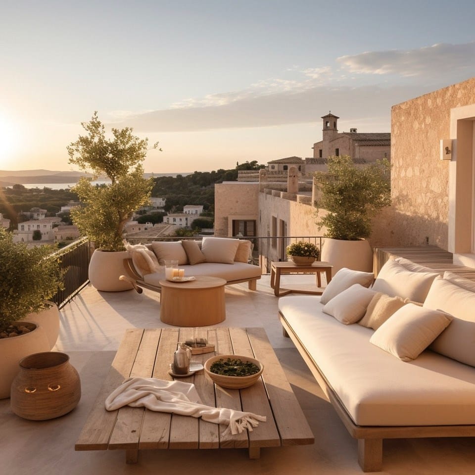 Above, a rooftop terrace opens to panoramic views over the main square and surrounding rooftops, offering a private setting for sunrise rituals, evening gatherings, or quiet reflection. Located within walking distance of cafés, local shops, and daily amenities, this home combines village intimacy with refined design and a clear commitment to health, sustainability, and enduring quality.