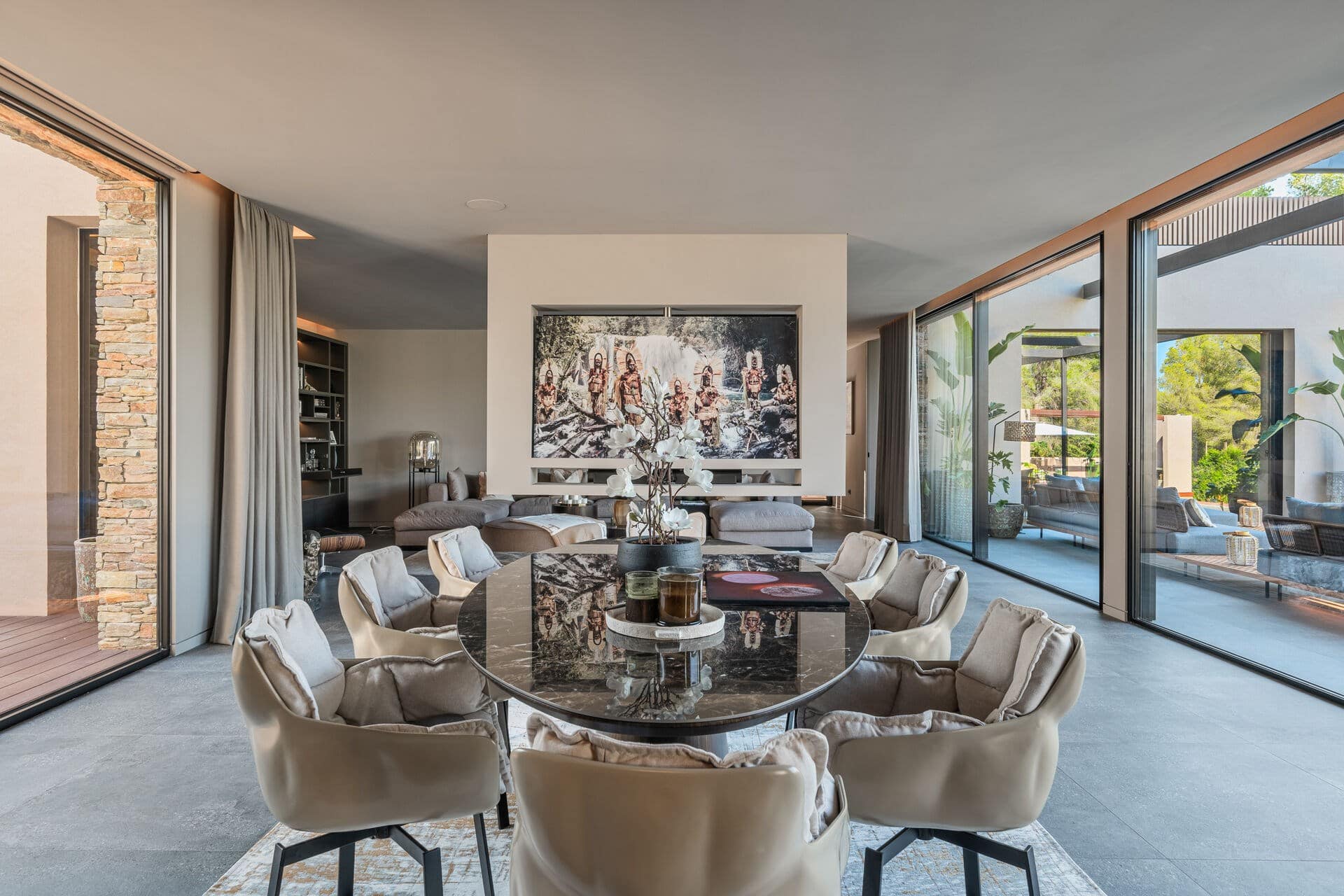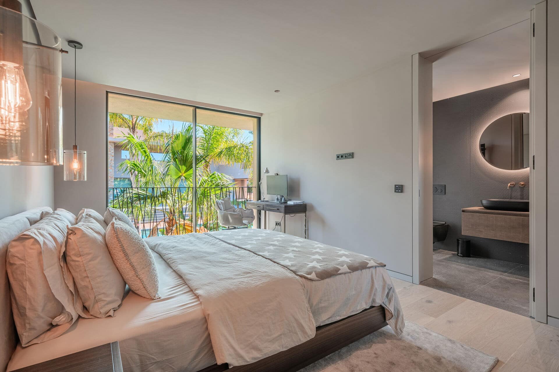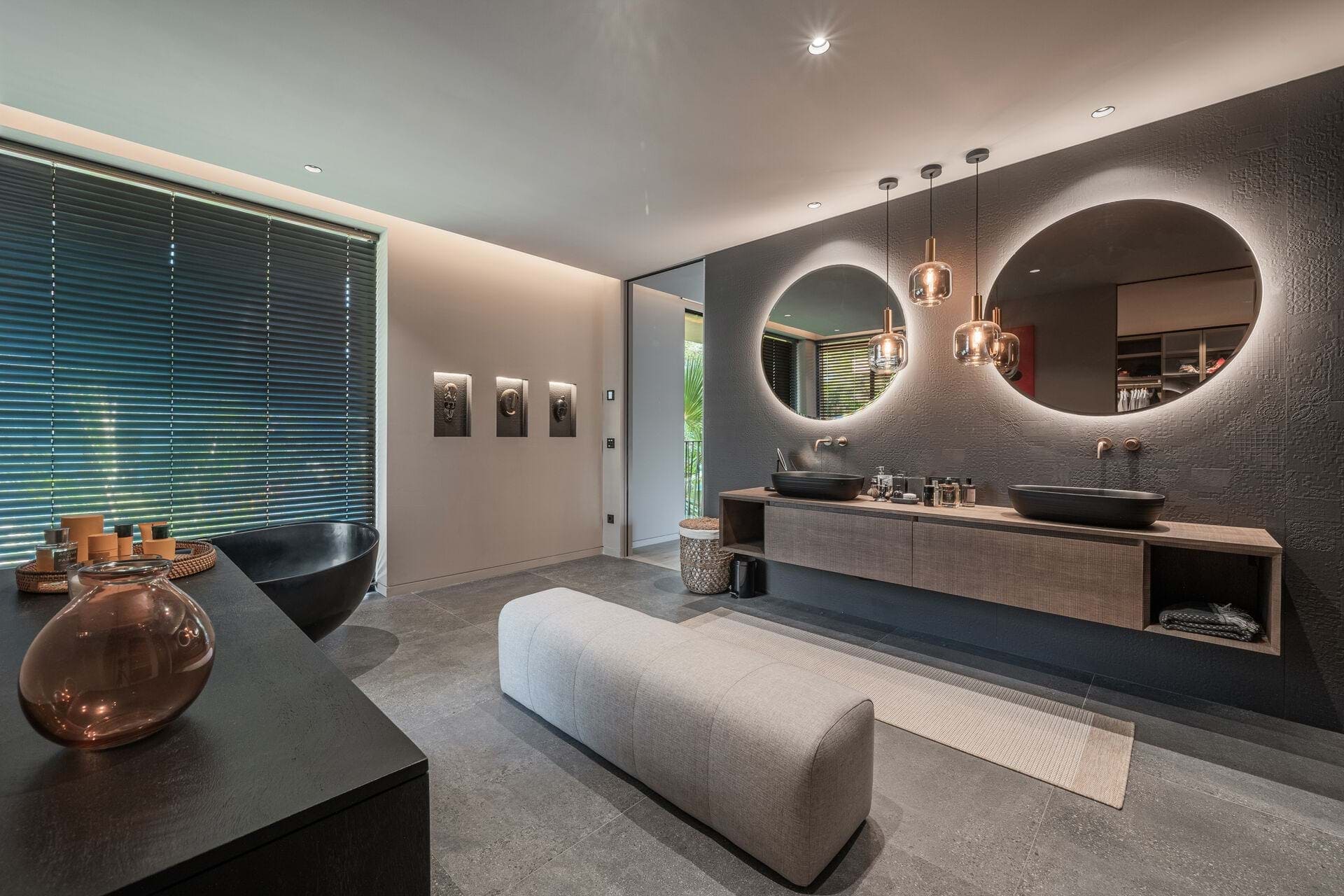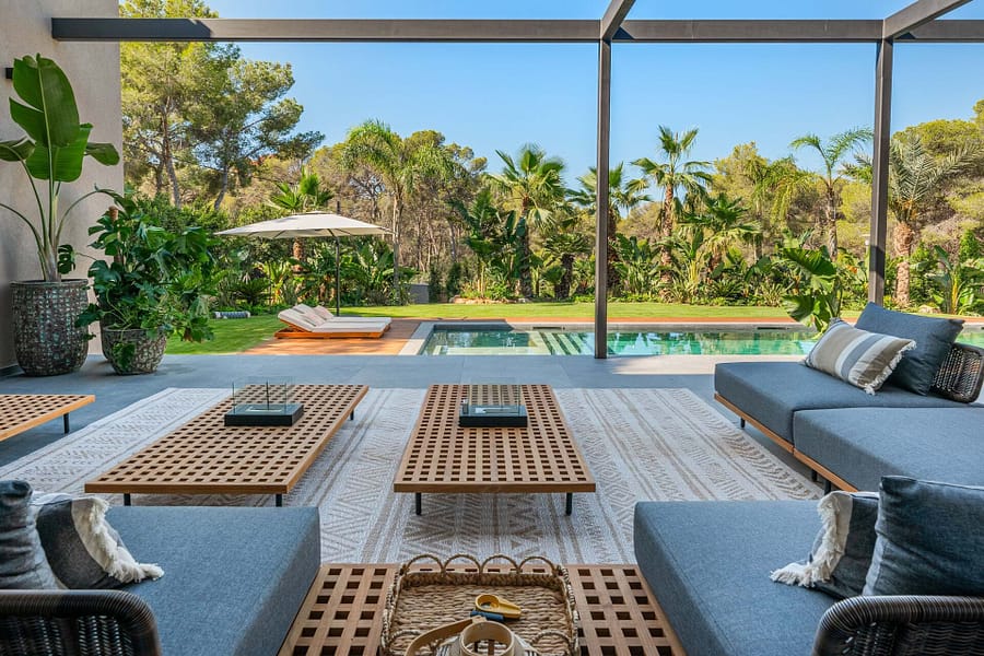 Welcome to this luxurious contemporary estate, offering an exquisite blend of modern elegance and tranquil living. Set on a beautifully landscaped 1,460m² plot, this exceptional property boasts a total living area of 510m². Designed to the highest standards, the estate features 5 spacious bedrooms, each with an en-suite bathroom, ensuring privacy and comfort for family and guests. The thoughtful layout includes a utility room, a double garage, several terraces, and an outdoor BBQ area with a fireplace, TV, and bar, perfect for entertaining. A dedicated sauna and jacuzzi area complete the picture of ultimate relaxation. Equipped with state-of-the-art heating and cooling, the home includes air conditioning and underfloor heating throughout, powered by a highly efficient heat pump system connected to advanced smart home automation. The Poliform® designer kitchen, featuring a marble worktop, stainless steel undermount sink, and premium Gaggenau Series 400 appliances, also incorporates an osmosis drinking water treatment system. The living area and master bedroom are complemented by bioethanol fireplaces from Planika, creating a cozy ambiance, while a 23 kW photovoltaic system with 16 kW battery storage ensures sustainable energy efficiency. Embracing the latest smart home technology, the estate is equipped with a GIRA® KNX control unit, offering full control over air conditioning, lighting, shading, and security via tablet or smartphone. Security is paramount, with a Paradox alarm system, HIKVISION camera monitoring, and a keyless access system using GIRA fingerprint technology for peace of mind and convenience. The interior of the home features premium CORVISION® COR windows from CORTIZO, with CLIMALIT solar control glazing and Bandalux® interior shading with blackout capabilities. The cutting-edge electrics and lighting systems include GIRA® and MDT technologies® glass push-buttons and sockets, programmable LED lighting, and Delta light spots, providing the perfect ambiance throughout. High-speed fiber optic internet, Samsung Q-LED TVs in every room, a Synology® data storage system, and Sonos® speakers offer an unparalleled multimedia experience. Further luxurious details include Inbani bathroom furniture, natural stone surfaces, Iconico fittings, freestanding bathtubs, and Geberit wall-mounted WCs, enhancing the homes refined aesthetic. High-quality ceramic tiles flow throughout the indoor and outdoor areas, complemented by MAFI real wood floors in the bedrooms. Custom doors with Buster & Punch handles, Poliform Senzafine wardrobes, and a fully illuminated dressing room add a touch of refined craftsmanship. Outside, the estate offers a saltwater pool with automatic pH/chlorine control and LED lighting, a stylish Tarimatec pool terrace, and a lush Mediterranean/tropical garden with an automatic irrigation system and ambient LED lighting. The double garage provides ample storage space, enhancing the propertys practicality.