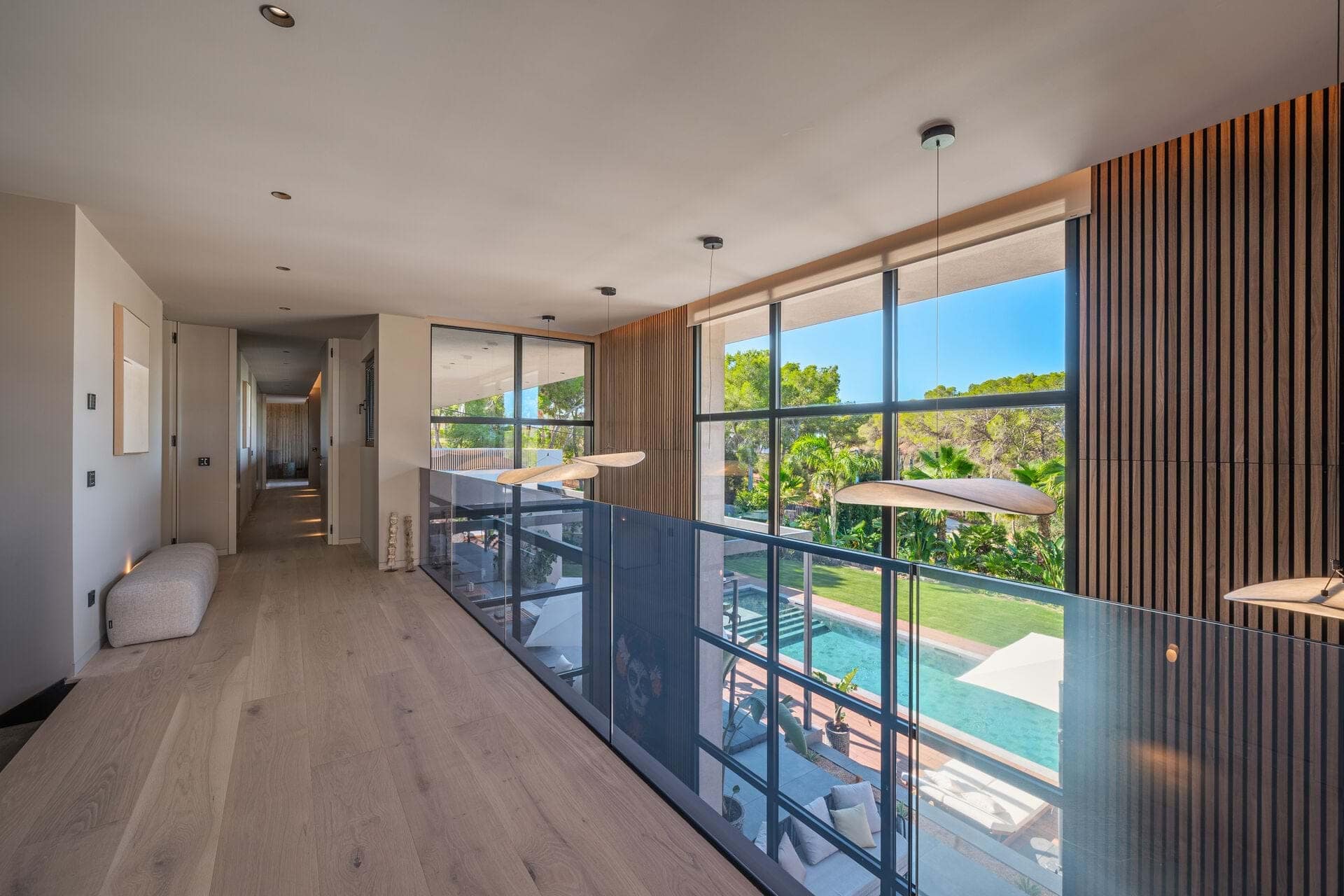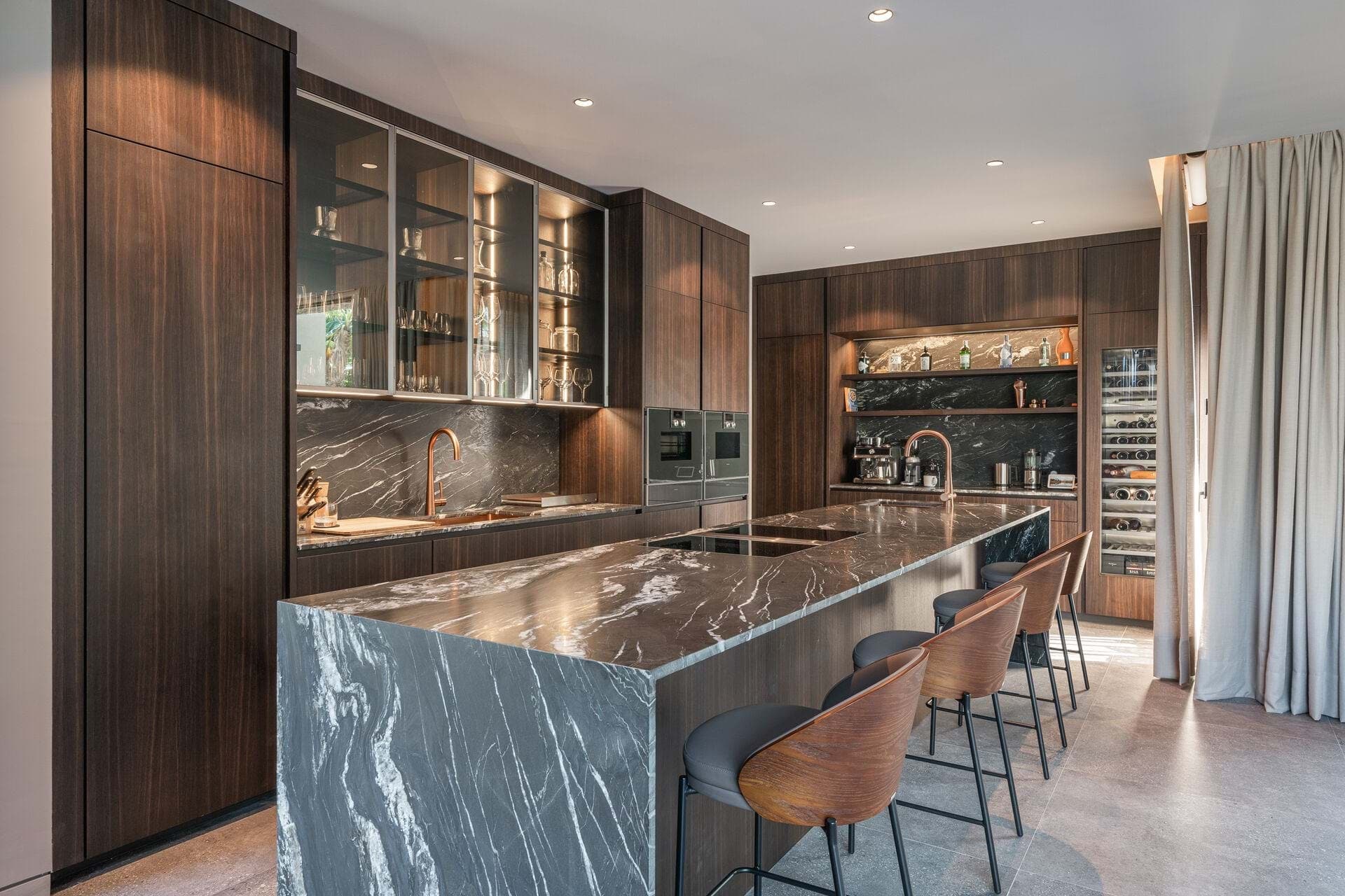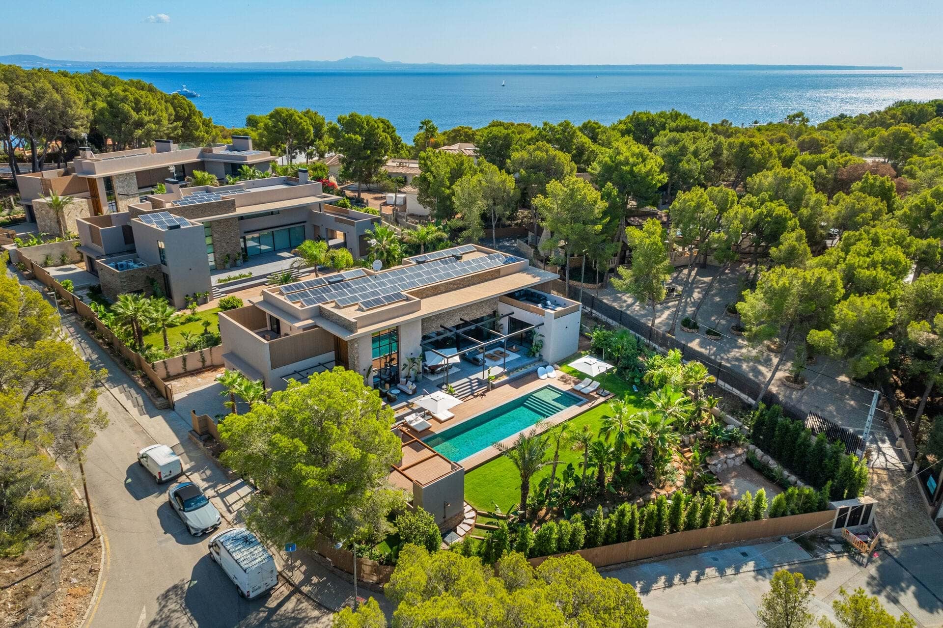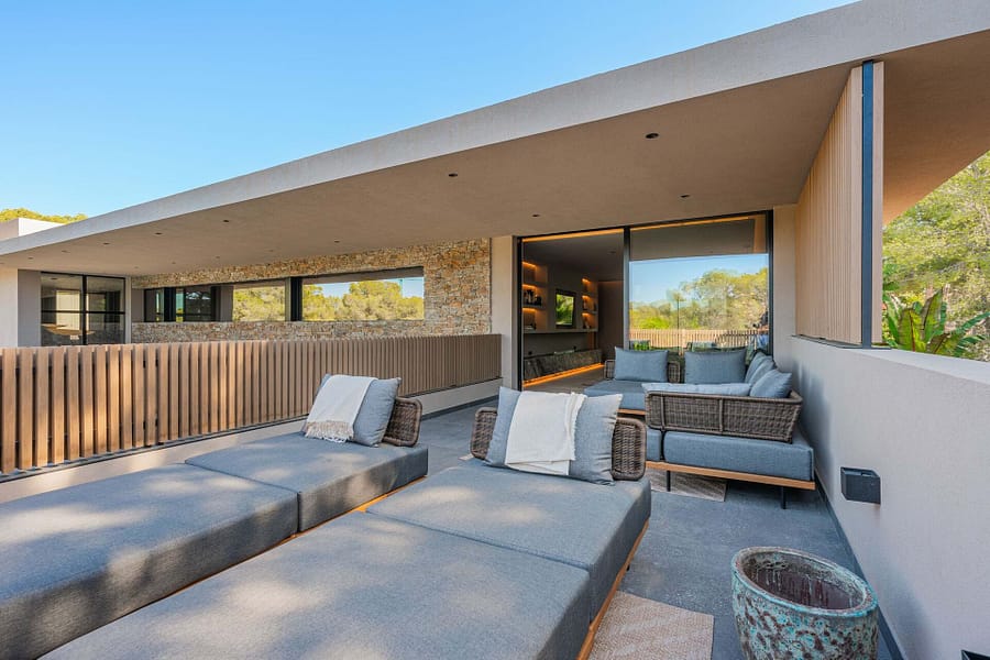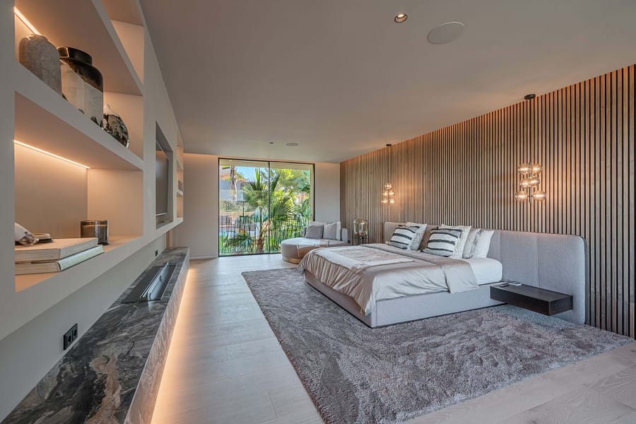 Welcome to this luxurious contemporary estate, offering an exquisite blend of modern elegance and tranquil living. Set on a beautifully landscaped 1,460m² plot, this exceptional property boasts a total living area of 510m². Designed to the highest standards, the estate features 5 spacious bedrooms, each with an en-suite bathroom, ensuring privacy and comfort for family and guests. The thoughtful layout includes a utility room, a double garage, several terraces, and an outdoor BBQ area with a fireplace, TV, and bar, perfect for entertaining. A dedicated sauna and jacuzzi area complete the picture of ultimate relaxation. Equipped with state-of-the-art heating and cooling, the home includes air conditioning and underfloor heating throughout, powered by a highly efficient heat pump system connected to advanced smart home automation. The Poliform® designer kitchen, featuring a marble worktop, stainless steel undermount sink, and premium Gaggenau Series 400 appliances, also incorporates an osmosis drinking water treatment system. The living area and master bedroom are complemented by bioethanol fireplaces from Planika, creating a cozy ambiance, while a 23 kW photovoltaic system with 16 kW battery storage ensures sustainable energy efficiency. Embracing the latest smart home technology, the estate is equipped with a GIRA® KNX control unit, offering full control over air conditioning, lighting, shading, and security via tablet or smartphone. Security is paramount, with a Paradox alarm system, HIKVISION camera monitoring, and a keyless access system using GIRA fingerprint technology for peace of mind and convenience. The interior of the home features premium CORVISION® COR windows from CORTIZO, with CLIMALIT solar control glazing and Bandalux® interior shading with blackout capabilities. The cutting-edge electrics and lighting systems include GIRA® and MDT technologies® glass push-buttons and sockets, programmable LED lighting, and Delta light spots, providing the perfect ambiance throughout. High-speed fiber optic internet, Samsung Q-LED TVs in every room, a Synology® data storage system, and Sonos® speakers offer an unparalleled multimedia experience. Further luxurious details include Inbani bathroom furniture, natural stone surfaces, Iconico fittings, freestanding bathtubs, and Geberit wall-mounted WCs, enhancing the homes refined aesthetic. High-quality ceramic tiles flow throughout the indoor and outdoor areas, complemented by MAFI real wood floors in the bedrooms. Custom doors with Buster & Punch handles, Poliform Senzafine wardrobes, and a fully illuminated dressing room add a touch of refined craftsmanship. Outside, the estate offers a saltwater pool with automatic pH/chlorine control and LED lighting, a stylish Tarimatec pool terrace, and a lush Mediterranean/tropical garden with an automatic irrigation system and ambient LED lighting. The double garage provides ample storage space, enhancing the propertys practicality.
