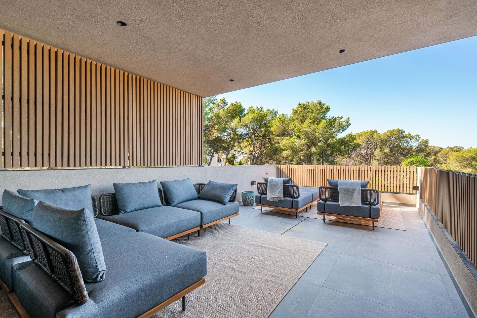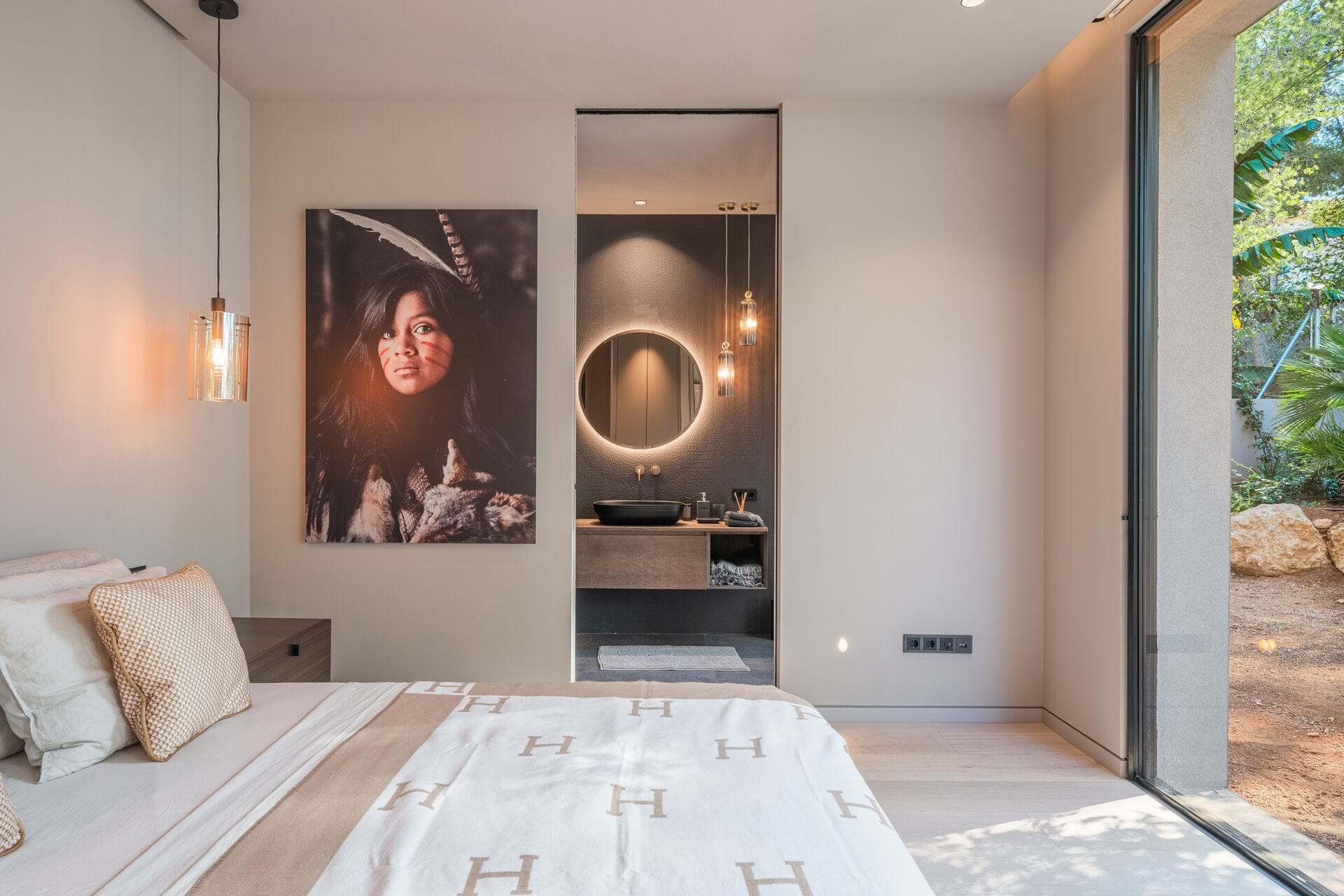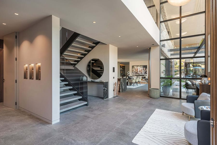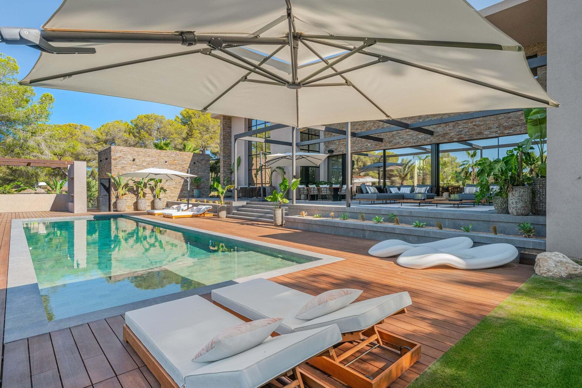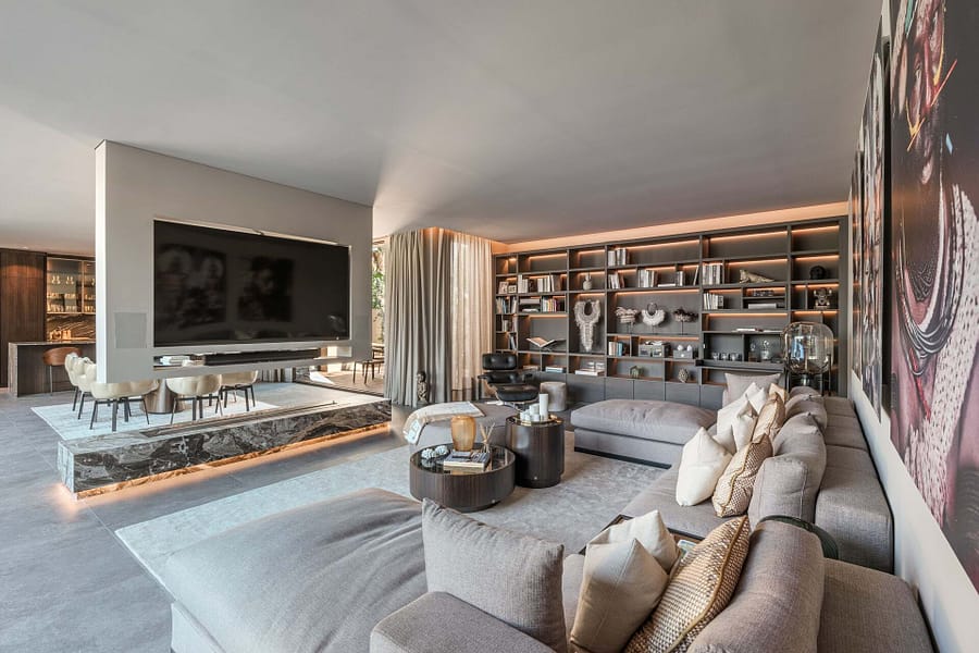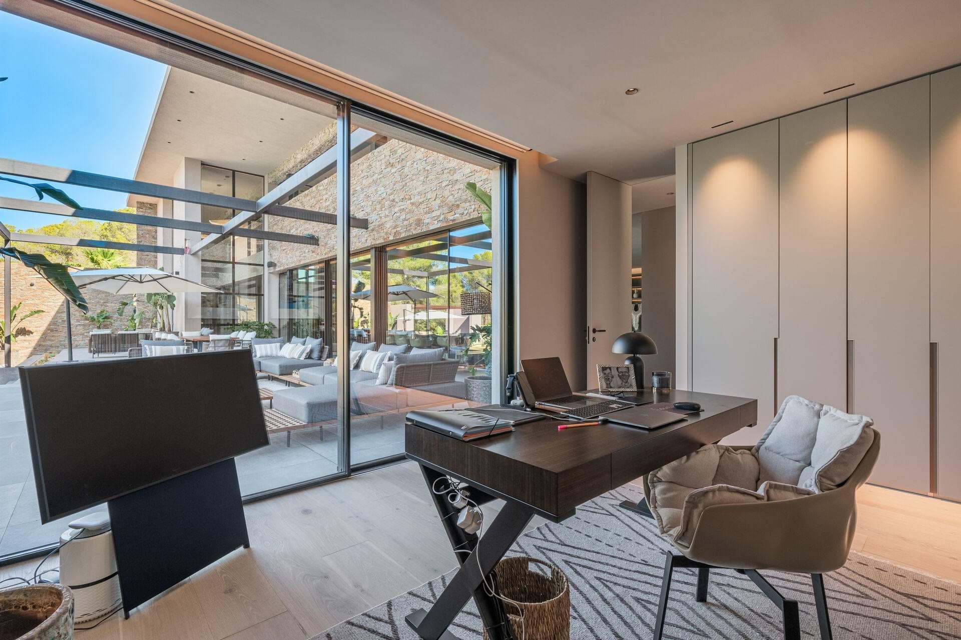 Welcome to this luxurious contemporary estate, offering an exquisite blend of modern elegance and tranquil living. Set on a beautifully landscaped 1,460m² plot, this exceptional property boasts a total living area of 510m². Designed to the highest standards, the estate features 5 spacious bedrooms, each with an en-suite bathroom, ensuring privacy and comfort for family and guests. The thoughtful layout includes a utility room, a double garage, several terraces, and an outdoor BBQ area with a fireplace, TV, and bar, perfect for entertaining. A dedicated sauna and jacuzzi area complete the picture of ultimate relaxation. Equipped with state-of-the-art heating and cooling, the home includes air conditioning and underfloor heating throughout, powered by a highly efficient heat pump system connected to advanced smart home automation. The Poliform® designer kitchen, featuring a marble worktop, stainless steel undermount sink, and premium Gaggenau Series 400 appliances, also incorporates an osmosis drinking water treatment system. The living area and master bedroom are complemented by bioethanol fireplaces from Planika, creating a cozy ambiance, while a 23 kW photovoltaic system with 16 kW battery storage ensures sustainable energy efficiency. Embracing the latest smart home technology, the estate is equipped with a GIRA® KNX control unit, offering full control over air conditioning, lighting, shading, and security via tablet or smartphone. Security is paramount, with a Paradox alarm system, HIKVISION camera monitoring, and a keyless access system using GIRA fingerprint technology for peace of mind and convenience. The interior of the home features premium CORVISION® COR windows from CORTIZO, with CLIMALIT solar control glazing and Bandalux® interior shading with blackout capabilities. The cutting-edge electrics and lighting systems include GIRA® and MDT technologies® glass push-buttons and sockets, programmable LED lighting, and Delta light spots, providing the perfect ambiance throughout. High-speed fiber optic internet, Samsung Q-LED TVs in every room, a Synology® data storage system, and Sonos® speakers offer an unparalleled multimedia experience. Further luxurious details include Inbani bathroom furniture, natural stone surfaces, Iconico fittings, freestanding bathtubs, and Geberit wall-mounted WCs, enhancing the homes refined aesthetic. High-quality ceramic tiles flow throughout the indoor and outdoor areas, complemented by MAFI real wood floors in the bedrooms. Custom doors with Buster & Punch handles, Poliform Senzafine wardrobes, and a fully illuminated dressing room add a touch of refined craftsmanship. Outside, the estate offers a saltwater pool with automatic pH/chlorine control and LED lighting, a stylish Tarimatec pool terrace, and a lush Mediterranean/tropical garden with an automatic irrigation system and ambient LED lighting. The double garage provides ample storage space, enhancing the propertys practicality.