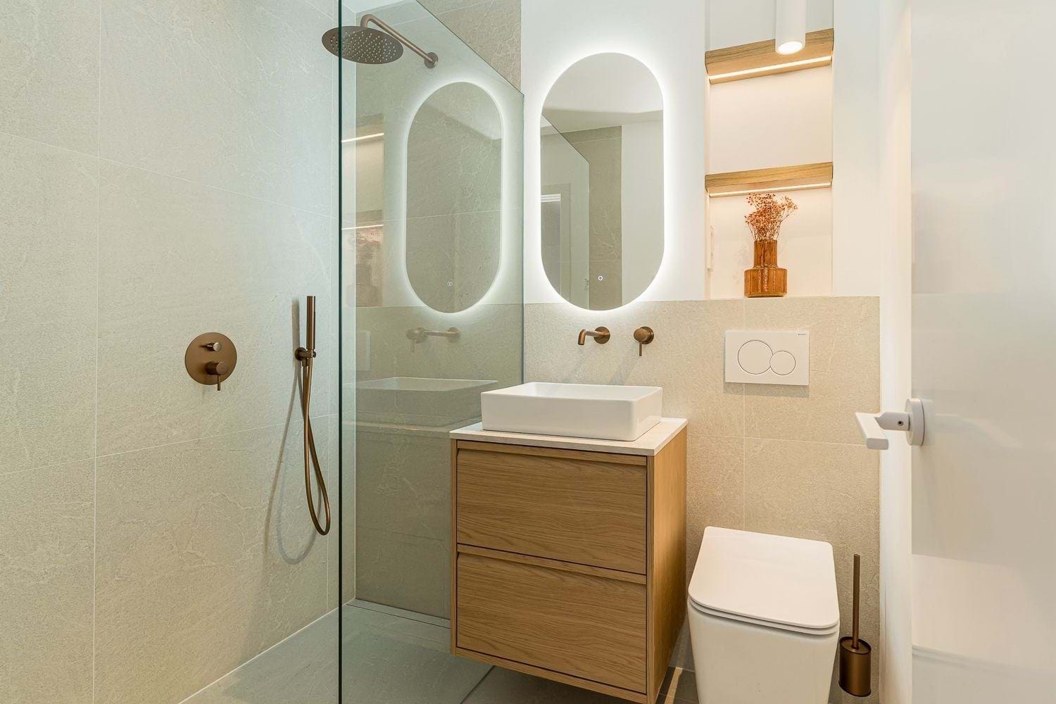 The bright open-plan layout includes a modern kitchen with custom lighting and integrated appliances, connected to a spacious living area with oak flooring. The bathroom has been transformed into a spa-like space, featuring brushed bronze fixtures and premium finishes. The bedroom offers a calm and cozy atmosphere with bespoke joinery and soft lighting.