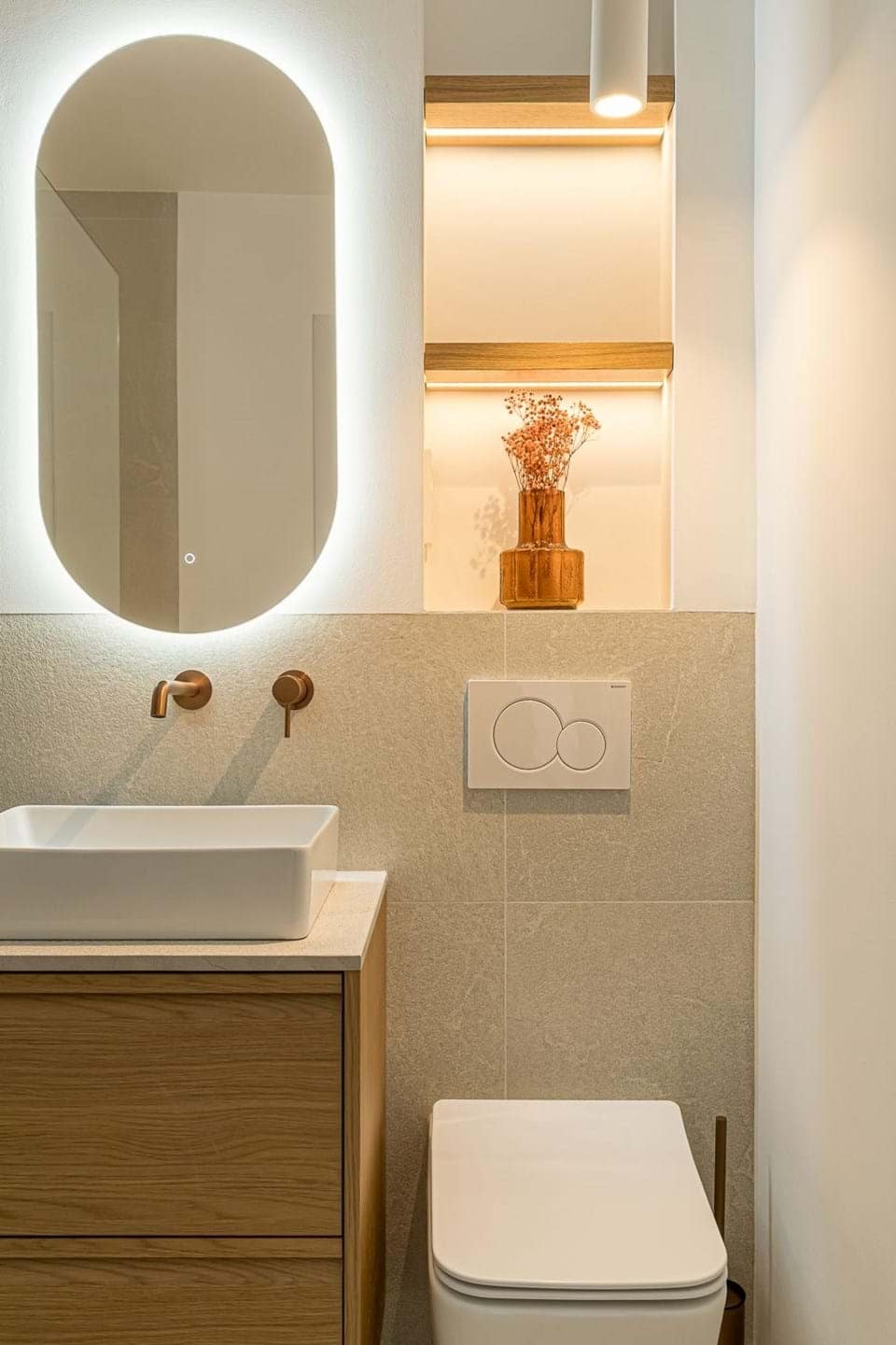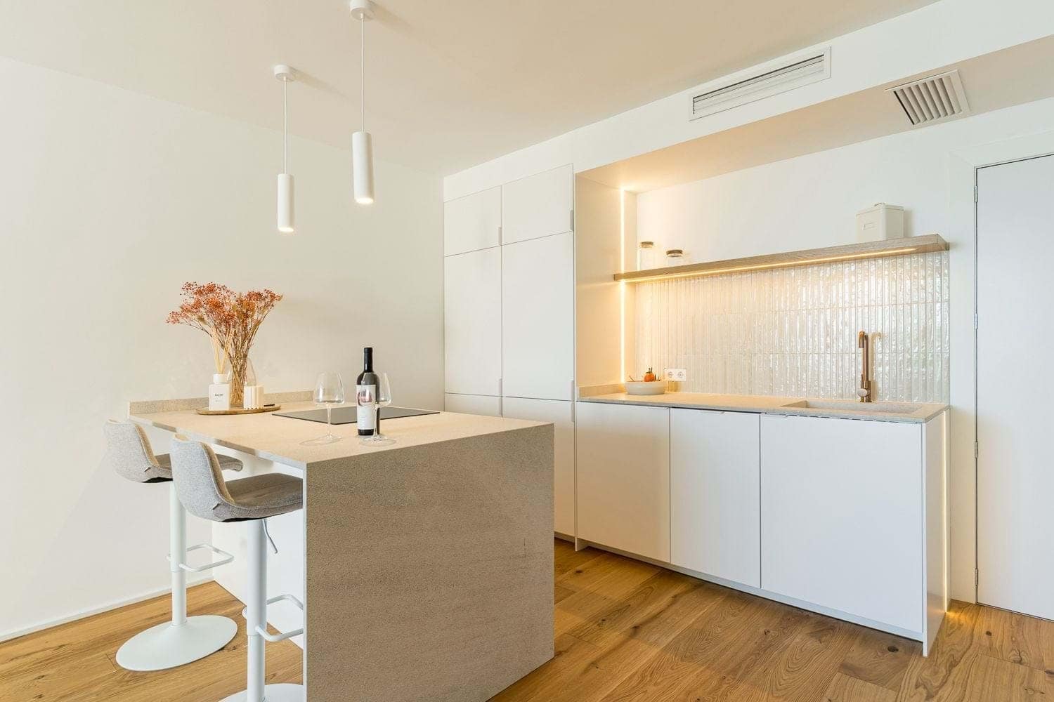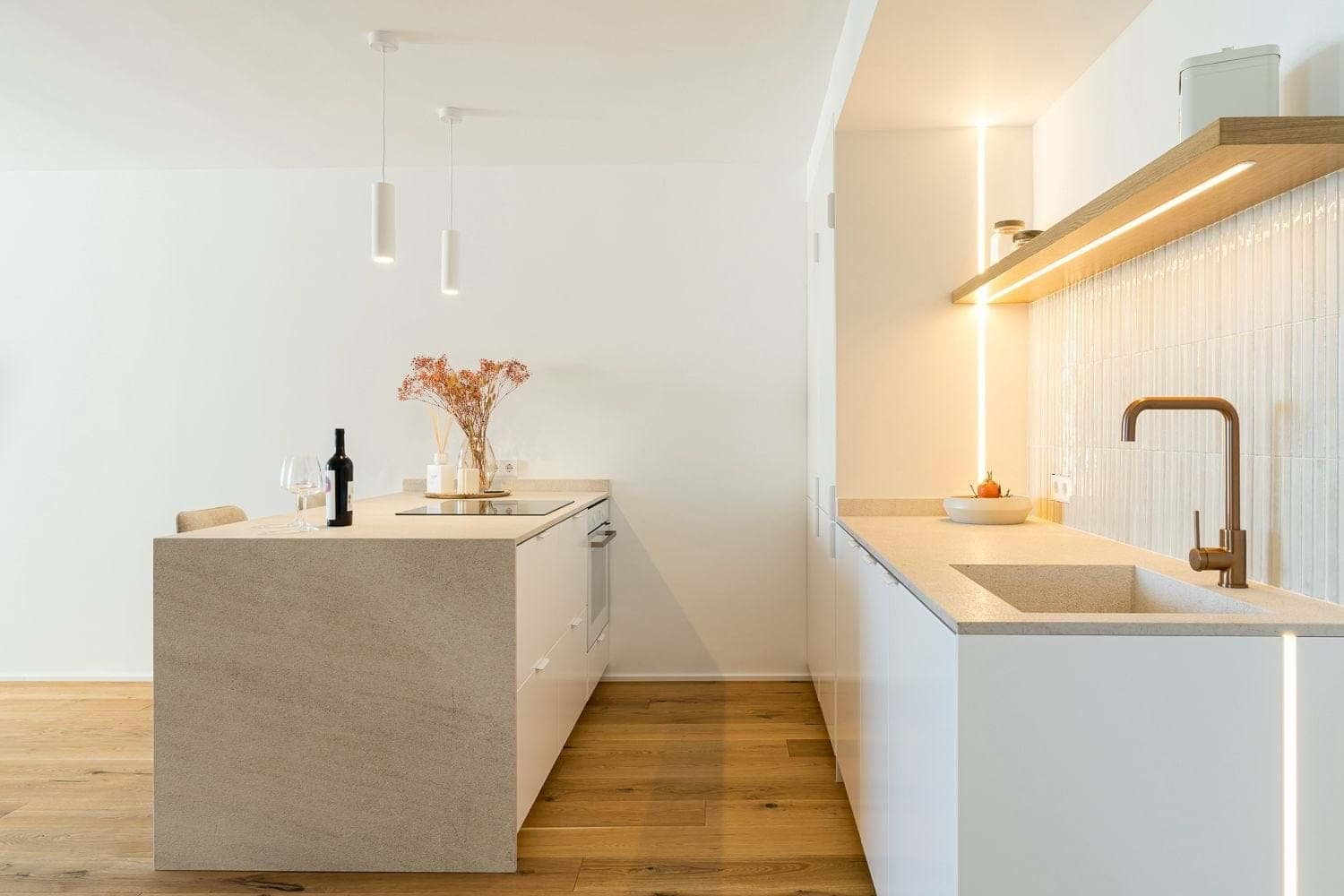 The Bright open-plan layout includes a modern kitchen with custom lighting and integrated appliances, connected to a spacious living area with oak flooring. The bathroom has been transformed into a spa-like space, featuring brushed bronze fixtures and premium finishes. The bedroom offers a calm and cozy atmosphere with bespoke joinery and soft lighting.