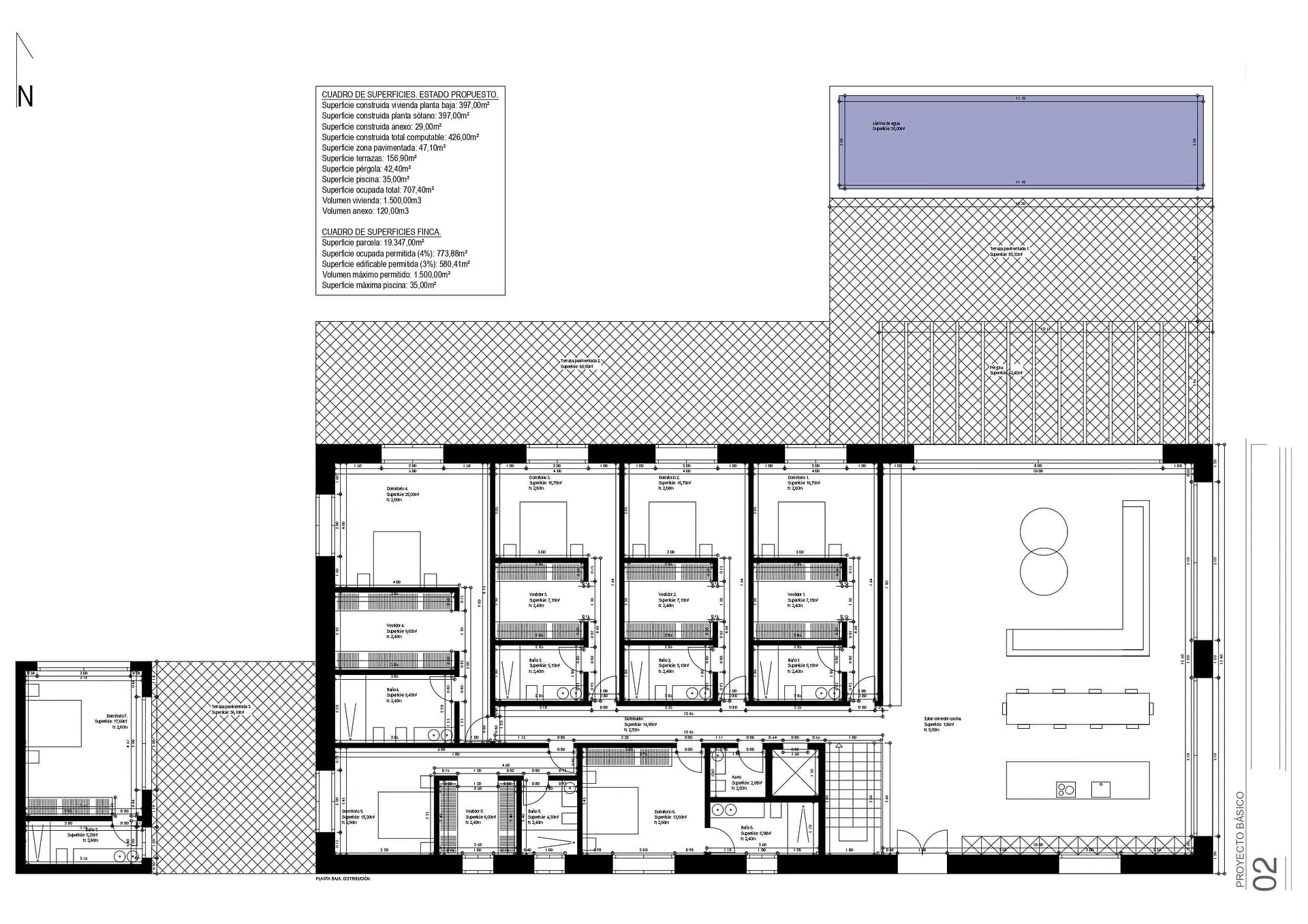 This spacious building plot, complete with a development plan, combines idyllic tranquility in the islands coveted central location with a concept featuring modern Mediterranean design and high quality construction. The planned property is designed as a single story structure and includes a light filled main building with an open concept living and dining area that seamlessly transitions into the outdoor spaces thanks to floor to ceiling windows. A total of six spacious bedrooms are planned, each with stylishly appointed en suite bathrooms, ensuring the highest level of living comfort.