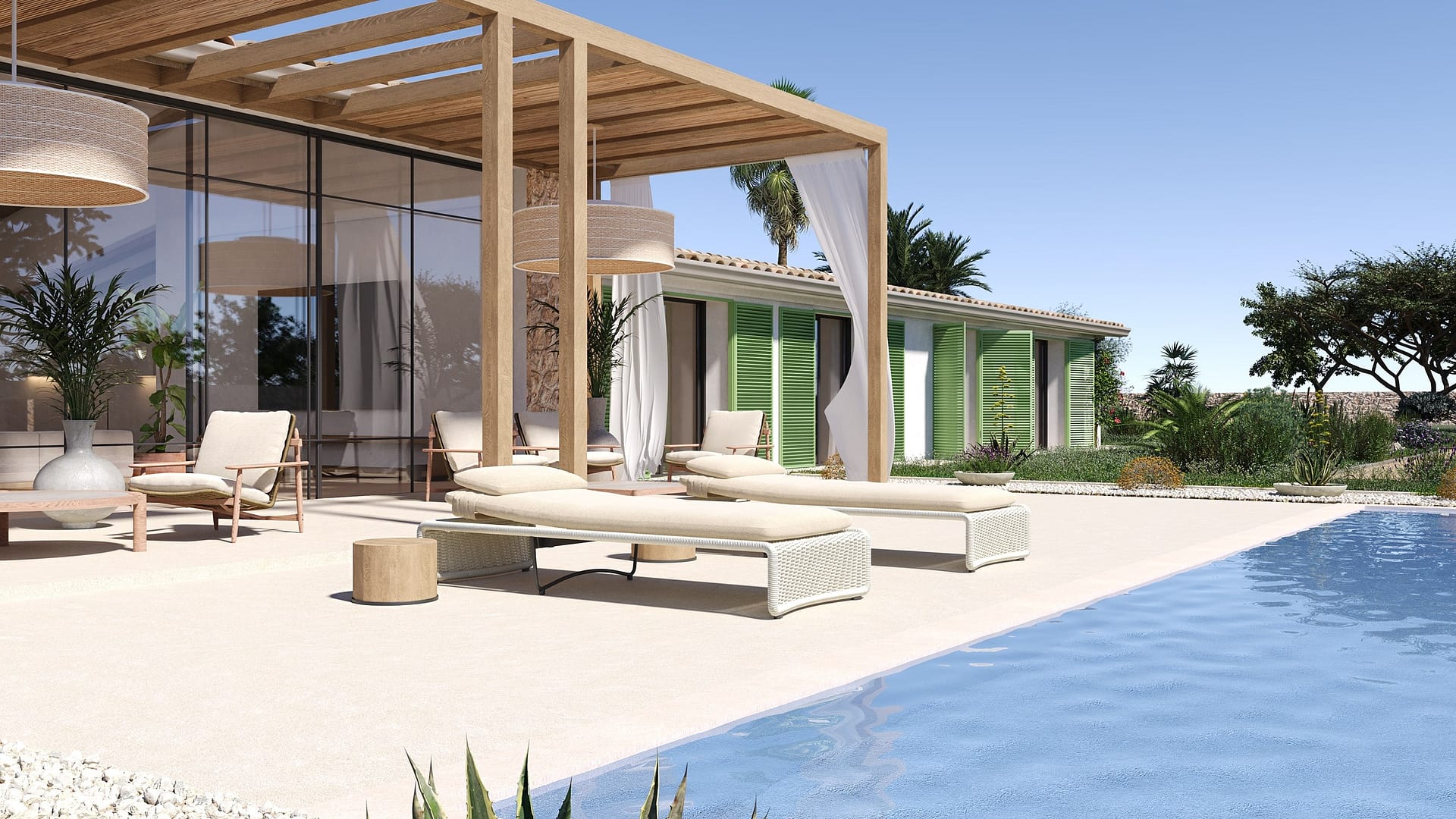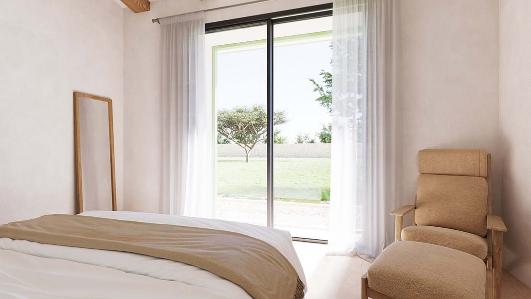 This spacious building plot, complete with a development plan, combines idyllic tranquility in the islands coveted central location with a concept featuring modern Mediterranean design and high quality construction. The planned property is designed as a single story structure and includes a light filled main building with an open concept living and dining area that seamlessly transitions into the outdoor spaces thanks to floor to ceiling windows. A total of six spacious bedrooms are planned, each with stylishly appointed en suite bathrooms, ensuring the highest level of living comfort.