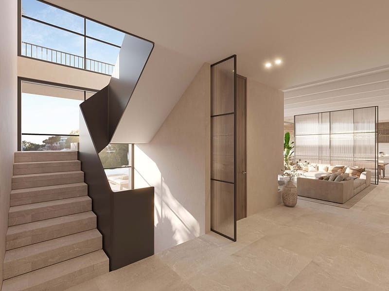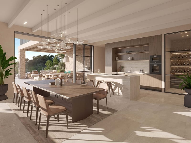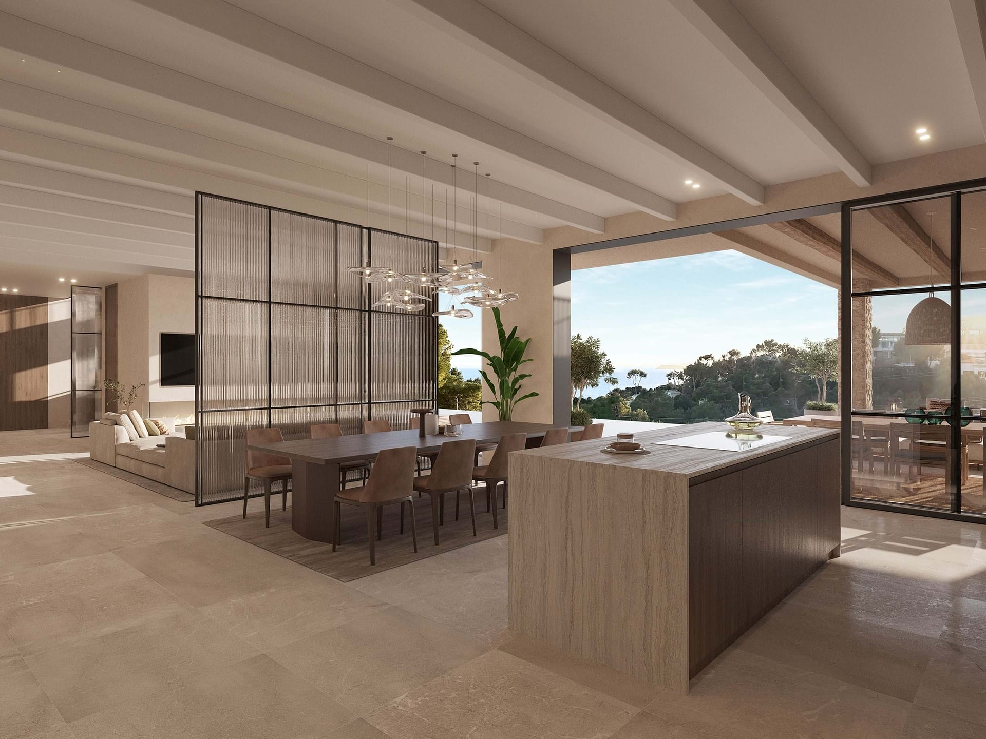 Can Blanc is a contemporary Mediterranean masterpiece nestling in the prestigious neighbourhood of Costa d’en Blanes. With a constructed area of 690 m² on a 1,045 m² plot, this exceptional villa is designs to embrace natural light. And breathtaking southwest-facing sea views. The ground floor is designs for seamless indoor-outdoor living, with Gris Zarzi stone extending from the open-plan living and dining spaces into the covered terrace and infinity pool.