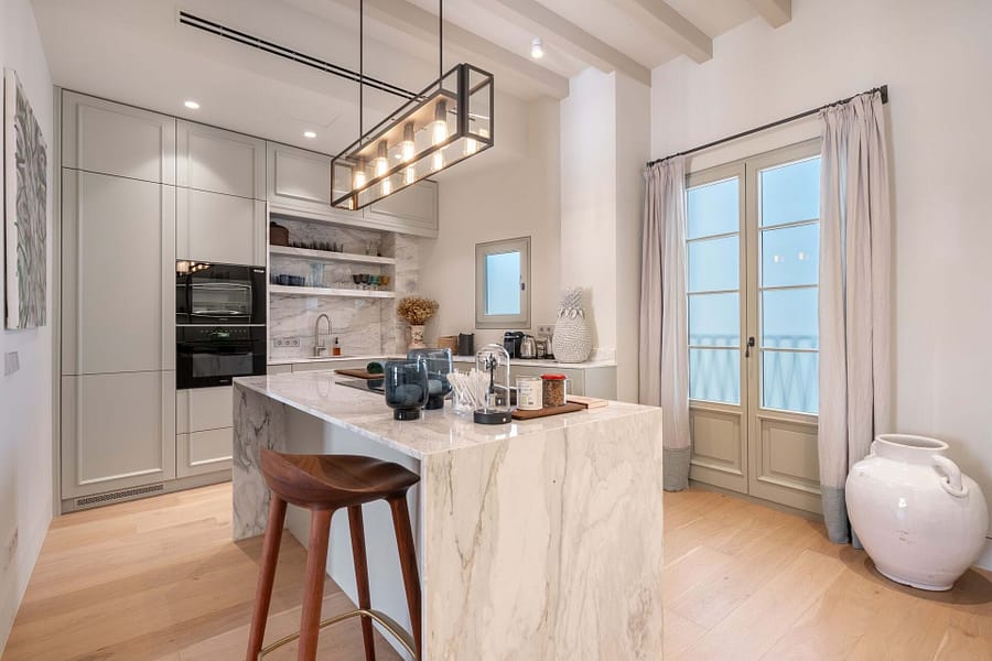 The elevator provides direct access to all floors, ensuring maximum convenience. A highlight of this property is the expansive roof terrace, offering near-360-degree views of Palmas skyline, including the cathedral, mountains, and ocean. Its the perfect spot for al fresco dining, relaxation, or enjoying the city’s vibrant events, such as the New Years Eve fireworks. Inside, the penthouse spans the top two floors, featuring heated oak floors, Calacatta Gold marble finishes, and a custom kitchen designed for both style and functionality.