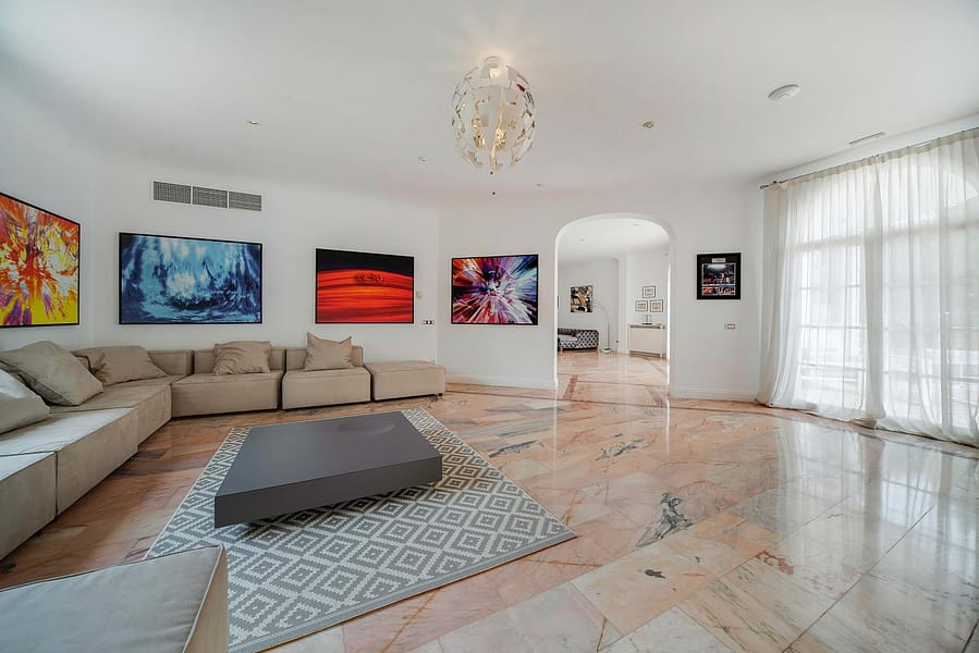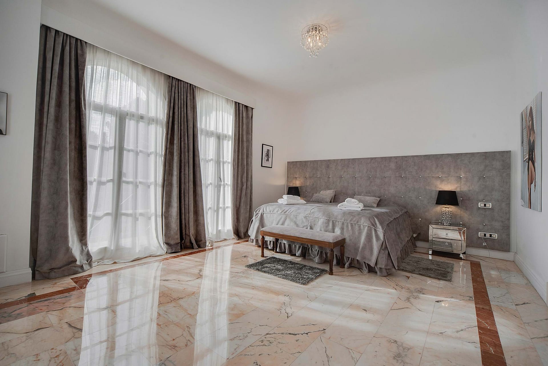 Situated majestically in the hills of Son Vida, this villa exudes classic elegance. A panoramic view stretches across the surrounding landscape to the metropolis of Palma, conveying an unmistakable sense of tranquility paired with an exclusive ambience. The pool is harmoniously embedded in a lovingly designed Mediterranean garden, which creates an idyllic feel-good atmosphere with olive trees, palm trees, and citrus trees. The spacious living and dining area impresses with light-flooded rooms, high-quality marble floors, and stylish interior design. The villa has six bedrooms and six bathrooms, offering maximum comfort and privacy for family and guests. Central heating and air conditioning guarantee pleasant temperatures all year round, while fine materials and precise workmanship ensure a luxurious quality of living. Four to five parking spaces provide ample space for vehicles. This residence combines timeless elegance with modern living comfort and offers an exclusive oasis in one of Mallorca’s most sought-after locations.