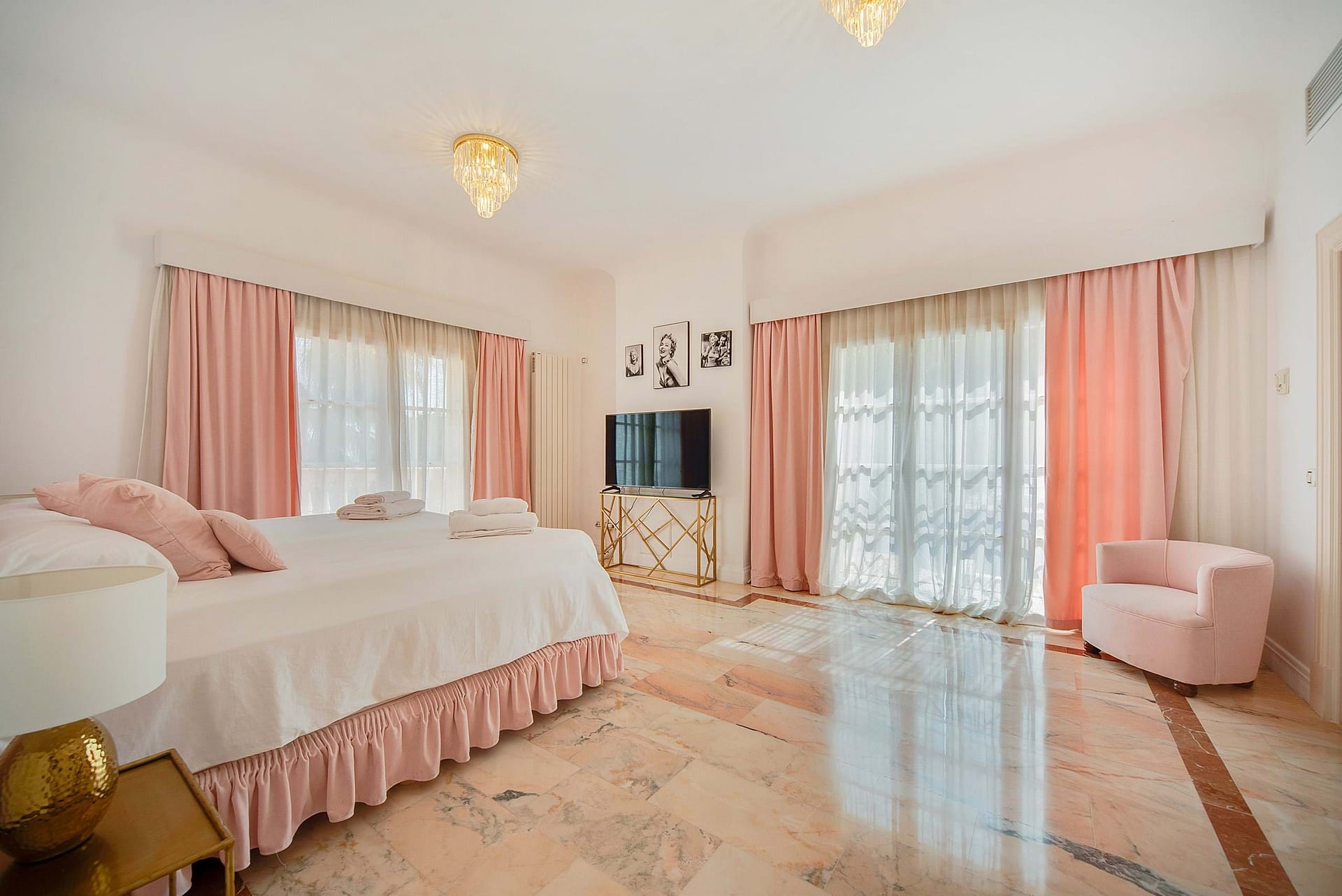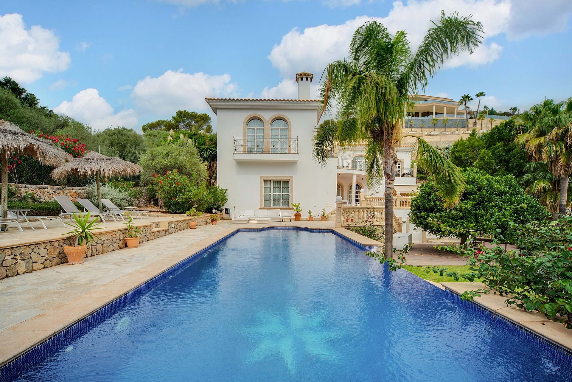 Situated majestically in the hills of Son Vida, this villa exudes classic elegance. A panoramic view stretches across the surrounding landscape to the metropolis of Palma, conveying an unmistakable sense of tranquility paired with an exclusive ambience. The pool is harmoniously embedded in a lovingly designed Mediterranean garden, which creates an idyllic feel-good atmosphere with olive trees, palm trees, and citrus trees. The spacious living and dining area impresses with light-flooded rooms, high-quality marble floors, and stylish interior design. The villa has six bedrooms and six bathrooms, offering maximum comfort and privacy for family and guests. Central heating and air conditioning guarantee pleasant temperatures all year round, while fine materials and precise workmanship ensure a luxurious quality of living. Four to five parking spaces provide ample space for vehicles. This residence combines timeless elegance with modern living comfort and offers an exclusive oasis in one of Mallorca’s most sought-after locations.
