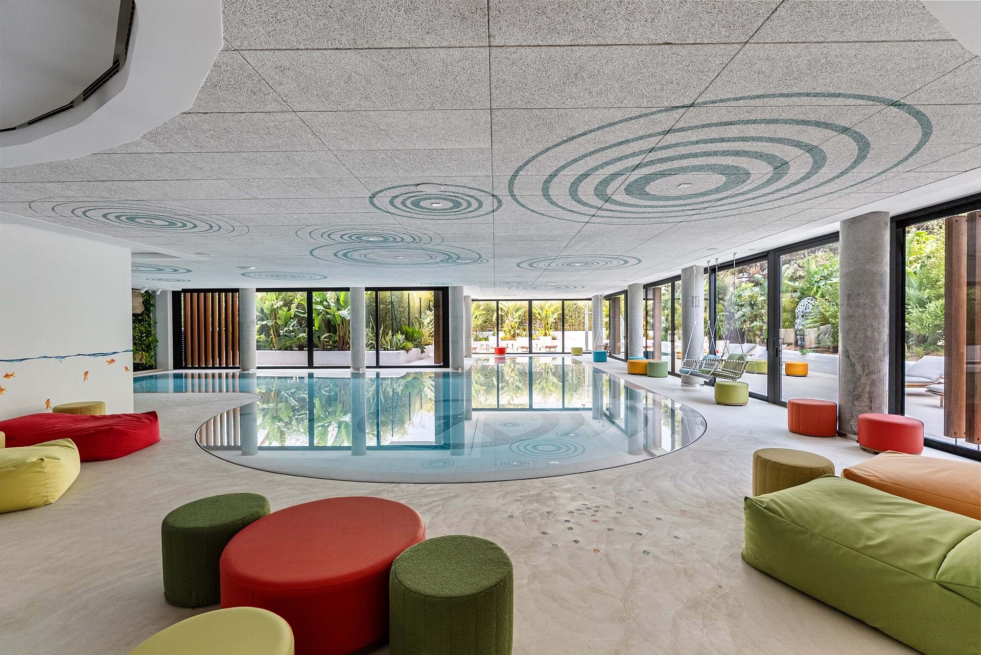 The building stands out with its striking, colorful design, a dramatic 15-meter-high entrance hall, a vertical garden, and elegant communal areas. Residents benefit from a 24-hour concierge service, a glazed indoor swimming pool, steam bath, a garden fitness area, and the beautifully designed “Chillments Garden” featuring sun loungers, an al fresco dining area, and an outdoor kitchen with professional grill and fridge.