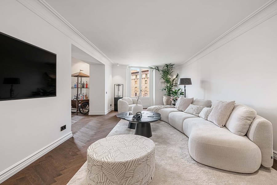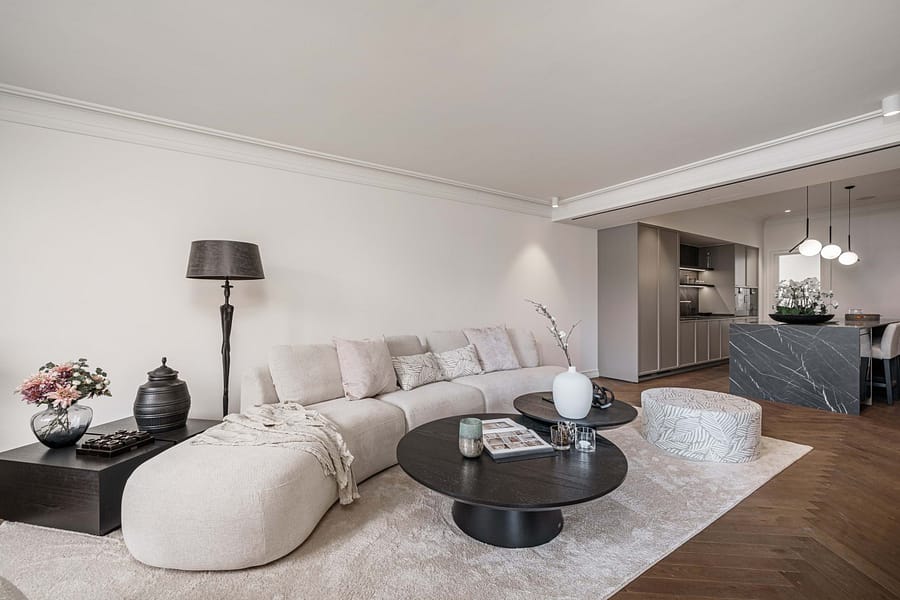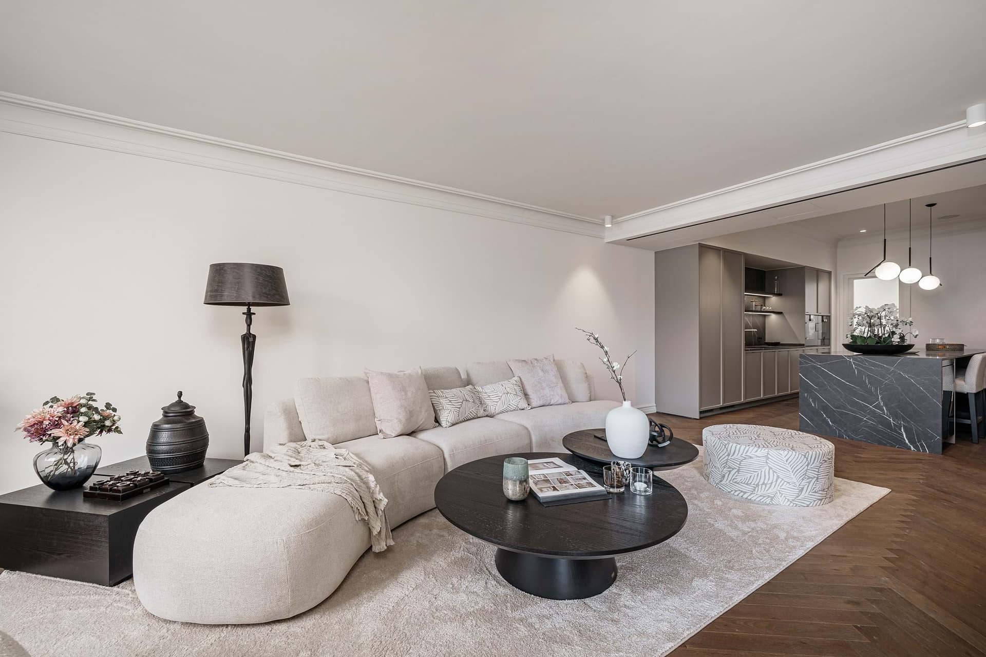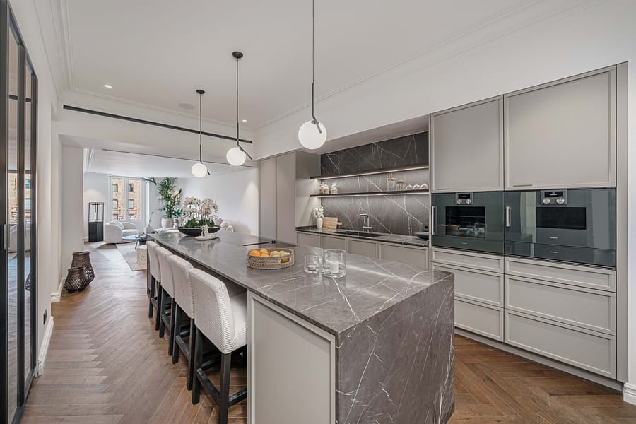 The apartment showcases a chic Scandinavian style with natural wooden flooring laid in a classic herringbone pattern. The sleek Italian kitchen by Espacio Home is perfect for culinary enthusiasts, while high-end FLOS lighting adds a touch of luxury. The bathrooms feature natural stone countertops, enhancing the overall elegance.