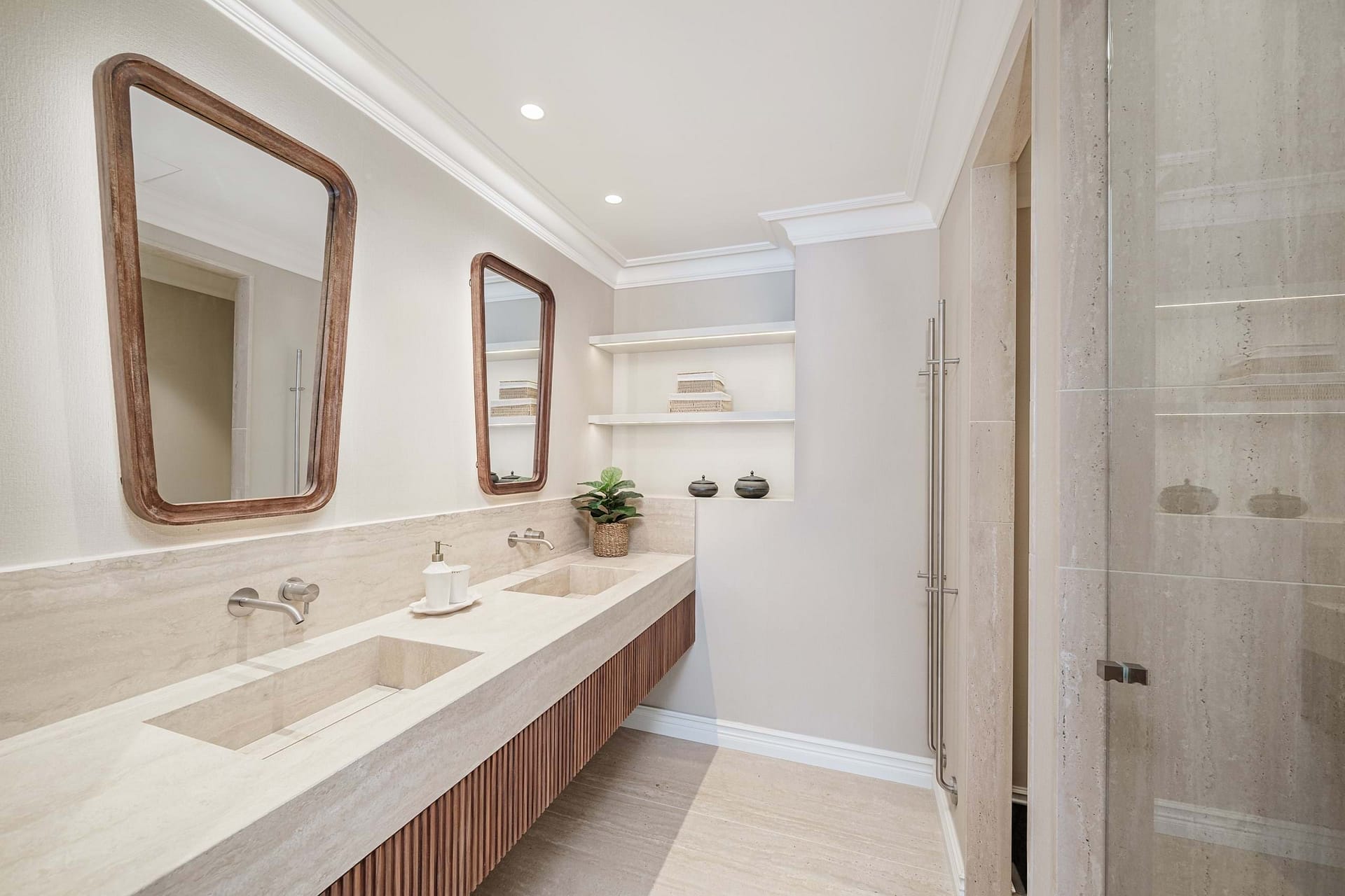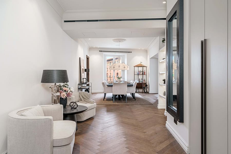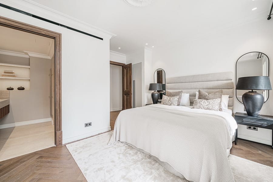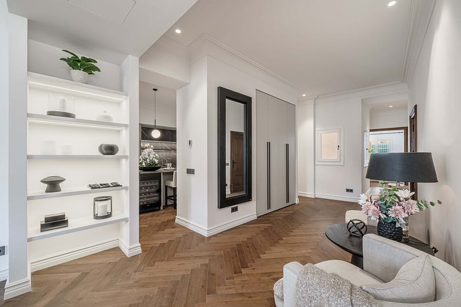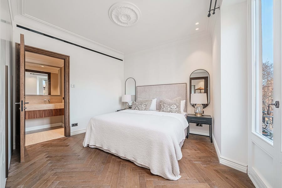 The apartment showcases a chic Scandinavian style with natural wooden flooring laid in a classic herringbone pattern. The sleek Italian kitchen by Espacio Home is perfect for culinary enthusiasts, while high-end FLOS lighting adds a touch of luxury. The bathrooms feature natural stone countertops, enhancing the overall elegance.