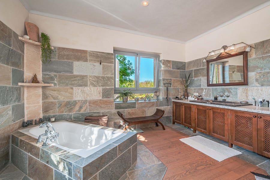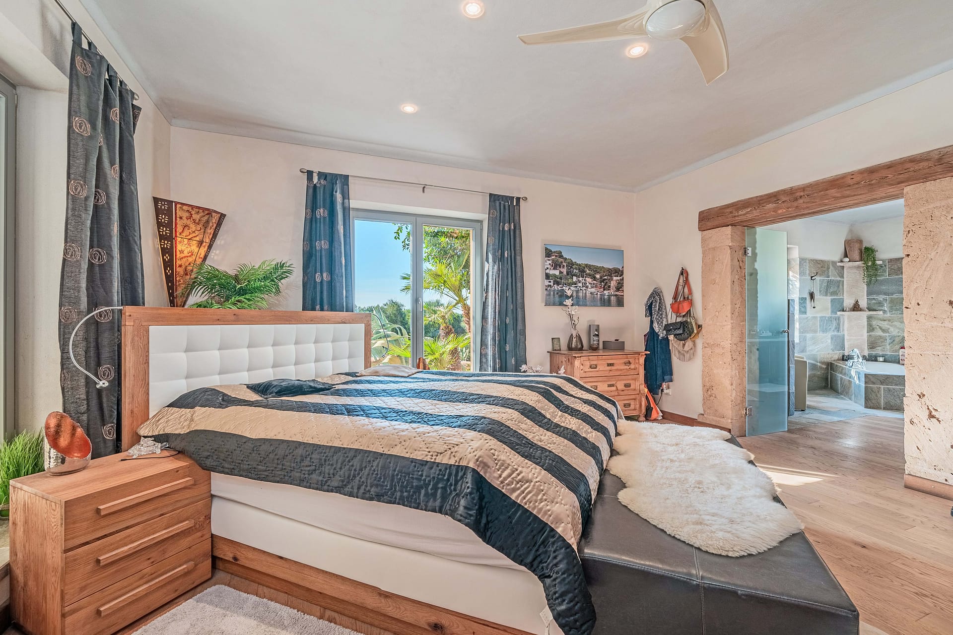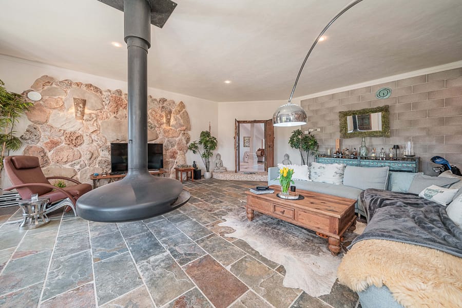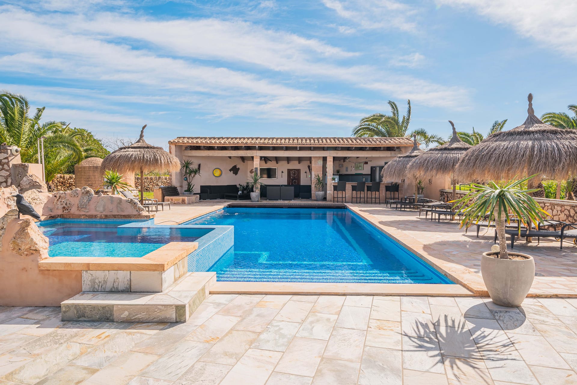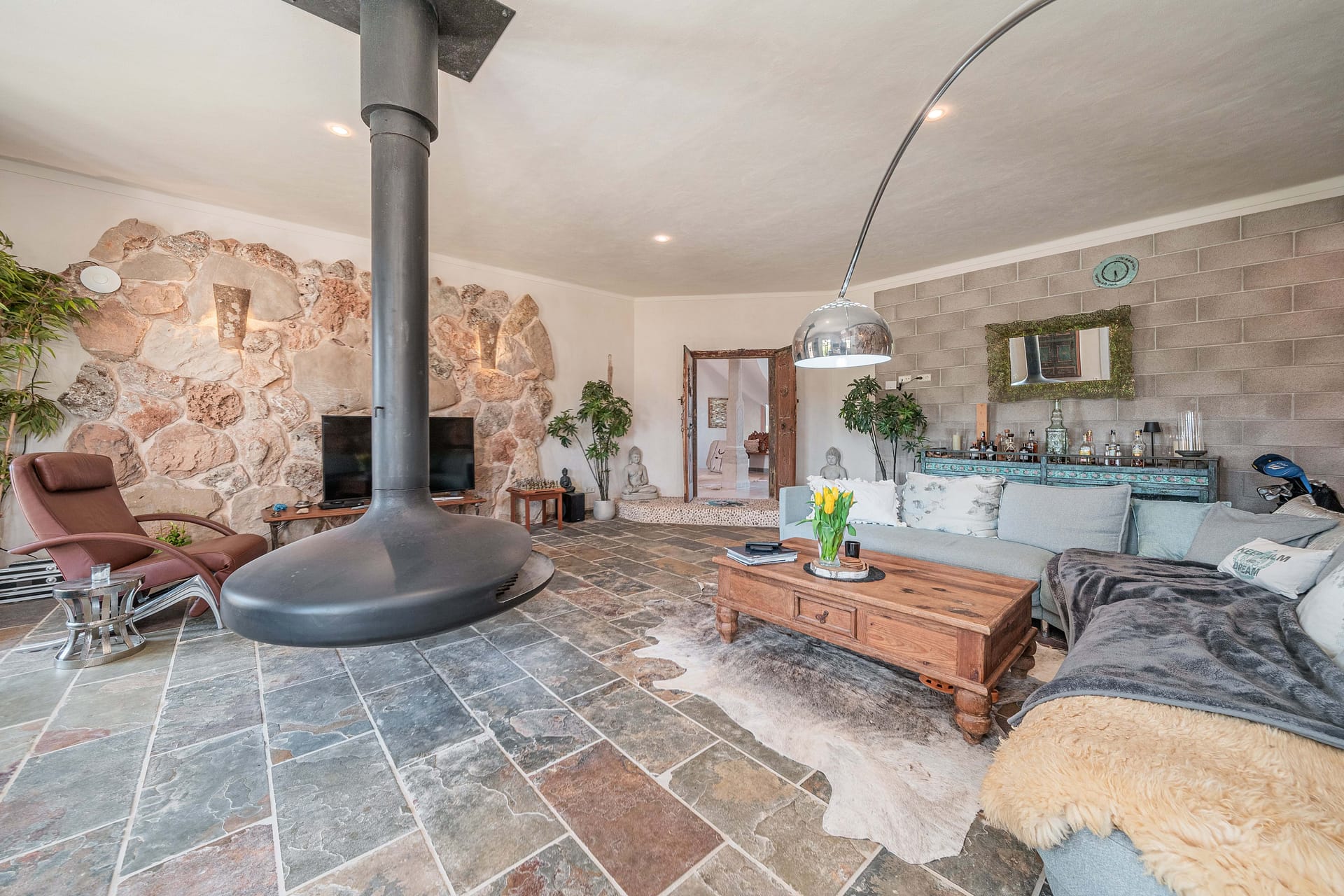 This classic style property with a rental license is unique and the ideal home for country lovers who have a large family or like to entertain guests, as it offers a variety of areas to enjoy throughout the year. The house offers spacious, light-filled rooms, combined with maximum living comfort and traditional details. Just a few minutes from Santanyi you will find this magnificent property with absolute privacy on a plot of approximately 15,900 m2. It impresses with its beautifully landscaped garden as well as the volleyball court and a FIFA football field. Great attention was paid to the selected international materials such as natural stone and wooden elements, which give this finca a very warm and cozy feeling. You enter the finca via a beautiful natural stone path, passing the guest house with kitchen, living area, one bedroom and one bathroom. When you reach and enter the beautiful main house, you will find the living room and a very spacious kitchen, which is connected to the dining room on your right. From both the dining room and the living area you have access to a covered terrace. To your left is the master bedroom with en-suite bathroom. On the second floor there are two more bedrooms with bathrooms, a kitchen and a living area. In the basement area there is another TV/game room with sauna and a bodega. The outdoor area is very spacious and offers a large pool with outdoor kitchen and barbecue area. Other features of this beautiful home include: Short term rental license, air conditioning hot/cold, underfloor heating hot/cold, double glazing, shutters, alarm and security system, guest toilet, guest house, separate laundry room, storage room, well, solar panels, large swimming pool with bar and TV, carport and outdoor parking for several cars, small shelter for bikes, sand volleyball court and a private football field.