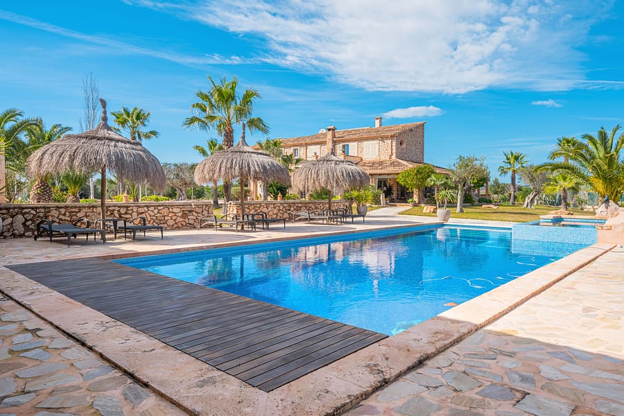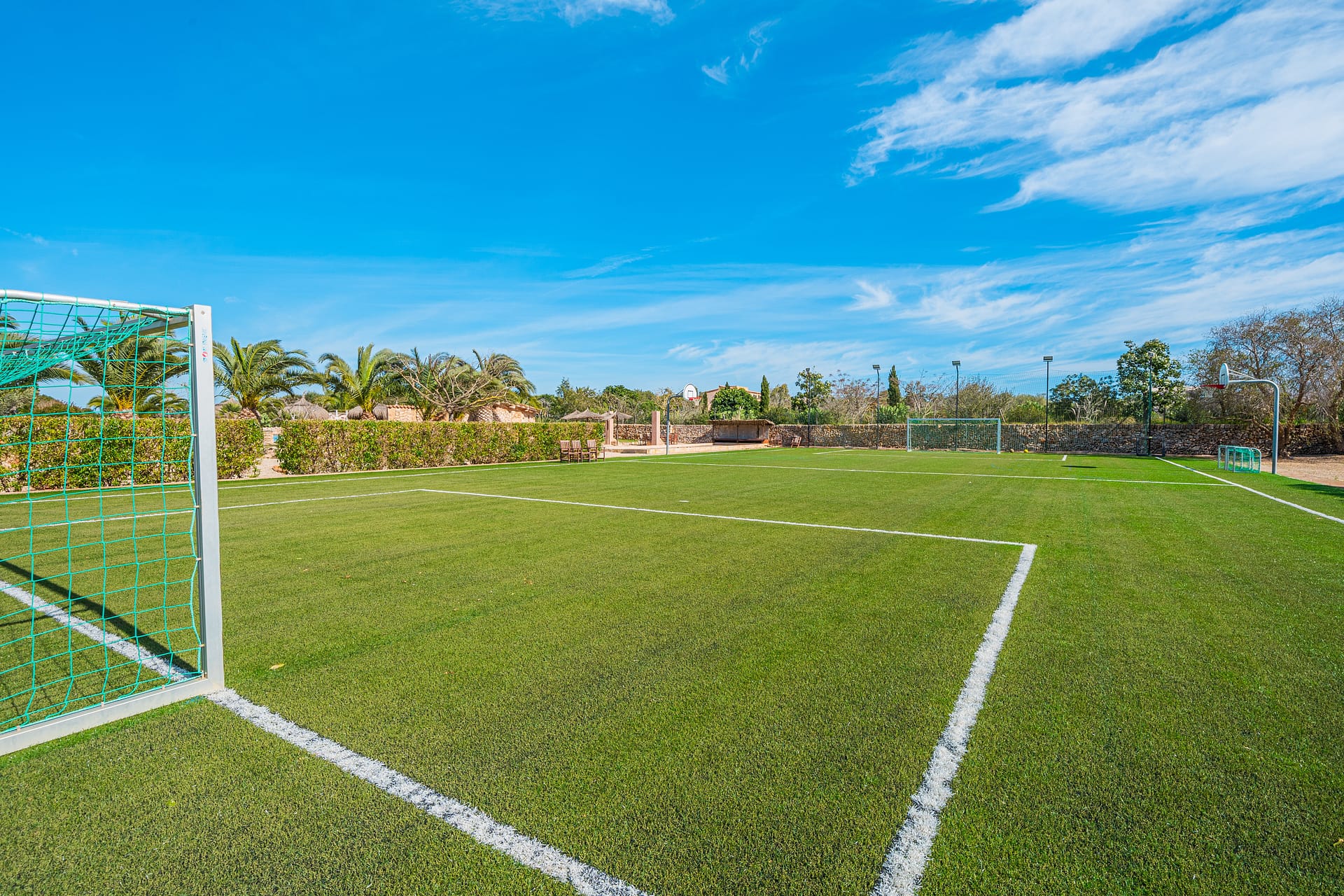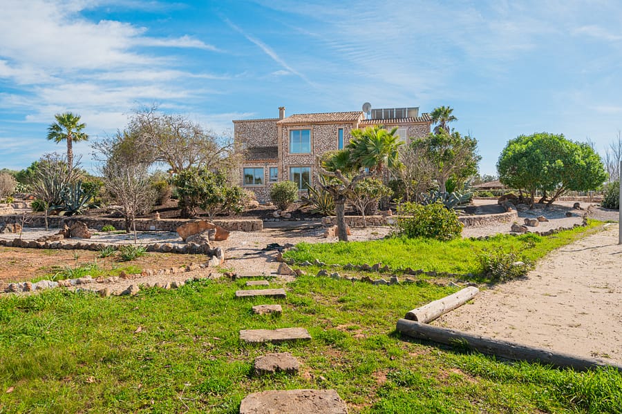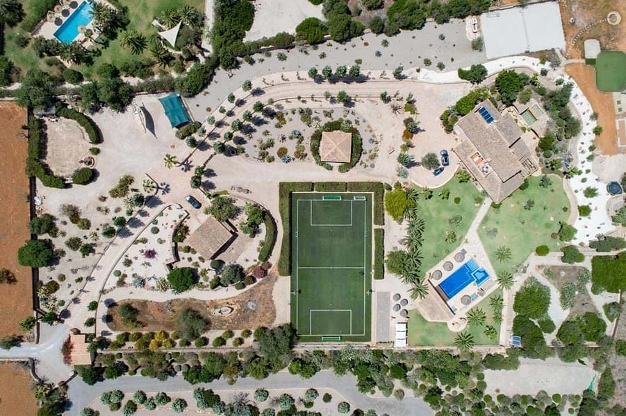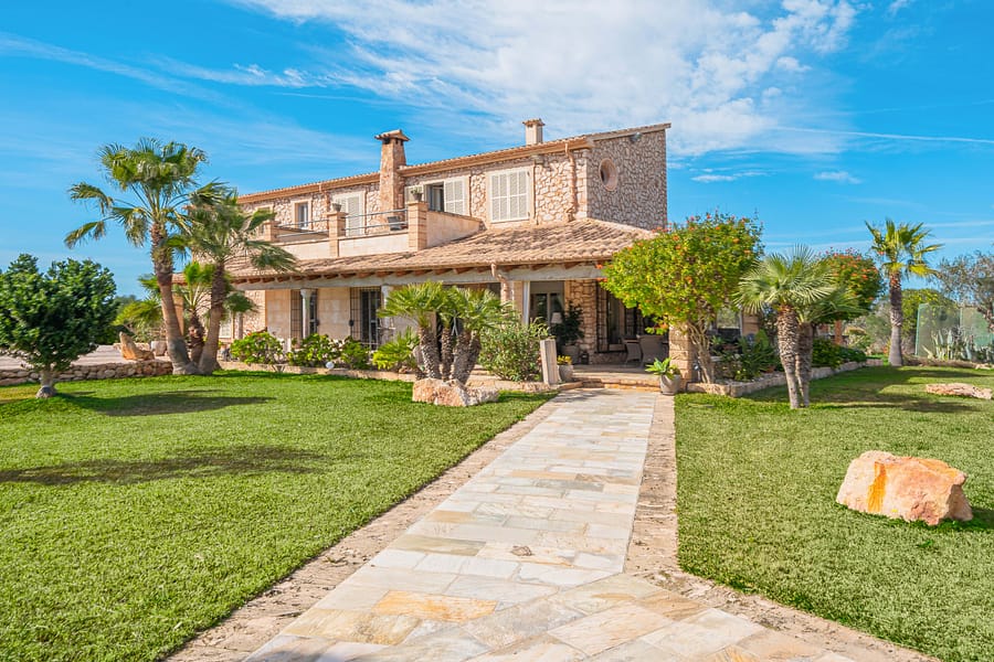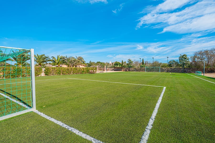 This classic style property with a rental license is unique and the ideal home for country lovers who have a large family or like to entertain guests, as it offers a variety of areas to enjoy throughout the year. The house offers spacious, light-filled rooms, combined with maximum living comfort and traditional details. Just a few minutes from Santanyi you will find this magnificent property with absolute privacy on a plot of approximately 15,900 m2. It impresses with its beautifully landscaped garden as well as the volleyball court and a FIFA football field. Great attention was paid to the selected international materials such as natural stone and wooden elements, which give this finca a very warm and cozy feeling. You enter the finca via a beautiful natural stone path, passing the guest house with kitchen, living area, one bedroom and one bathroom. When you reach and enter the beautiful main house, you will find the living room and a very spacious kitchen, which is connected to the dining room on your right. From both the dining room and the living area you have access to a covered terrace. To your left is the master bedroom with en-suite bathroom. On the second floor there are two more bedrooms with bathrooms, a kitchen and a living area. In the basement area there is another TV/game room with sauna and a bodega. The outdoor area is very spacious and offers a large pool with outdoor kitchen and barbecue area. Other features of this beautiful home include: Short term rental license, air conditioning hot/cold, underfloor heating hot/cold, double glazing, shutters, alarm and security system, guest toilet, guest house, separate laundry room, storage room, well, solar panels, large swimming pool with bar and TV, carport and outdoor parking for several cars, small shelter for bikes, sand volleyball court and a private football field.