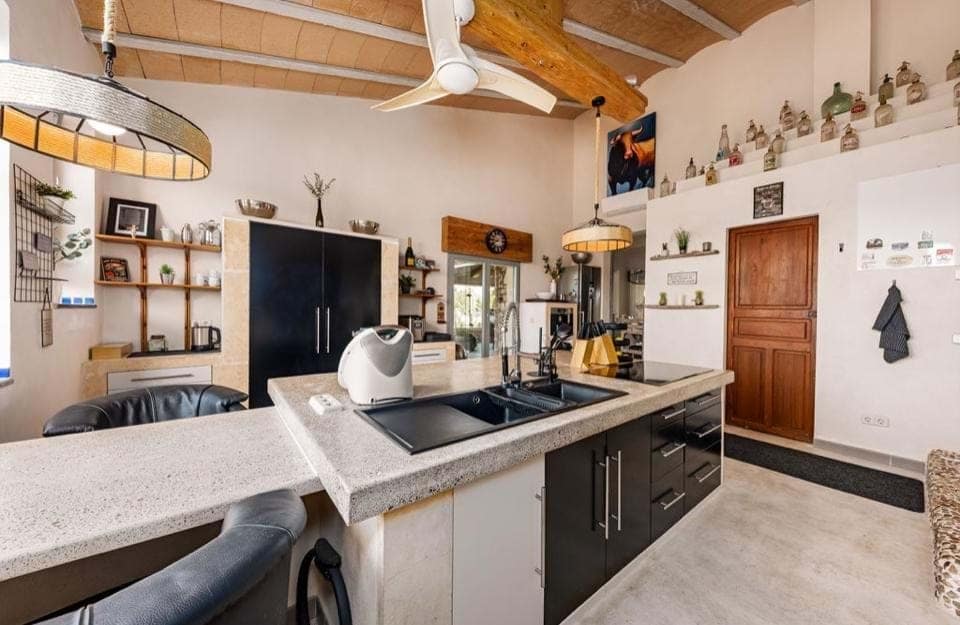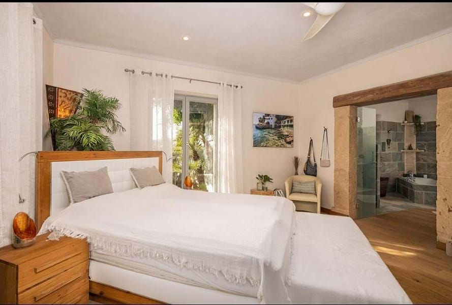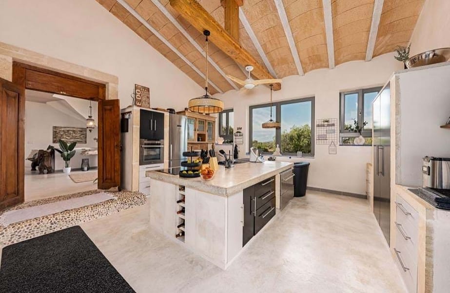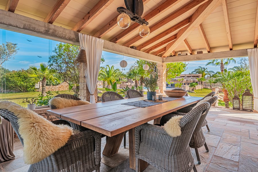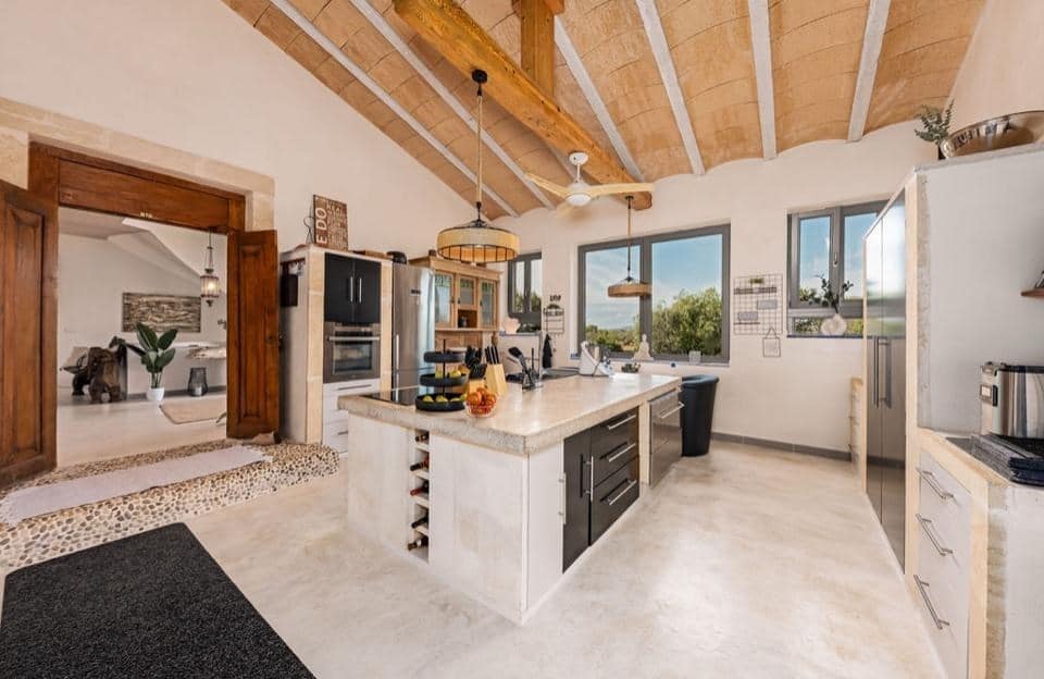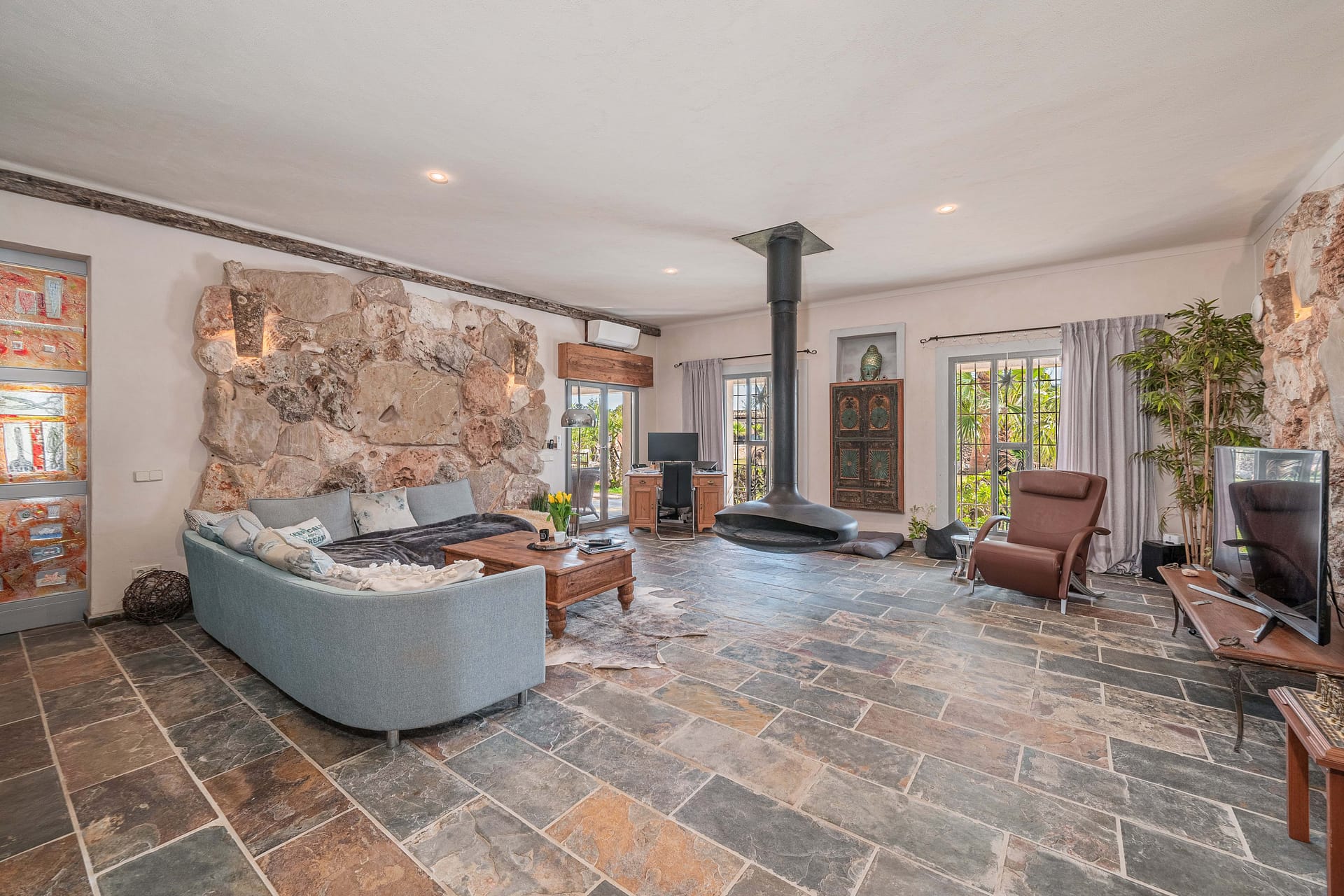 This classic style property with a rental license is unique and the ideal home for country lovers who have a large family or like to entertain guests, as it offers a variety of areas to enjoy throughout the year. The house offers spacious, light-filled rooms, combined with maximum living comfort and traditional details. Just a few minutes from Santanyi you will find this magnificent property with absolute privacy on a plot of approximately 15,900 m2. It impresses with its beautifully landscaped garden as well as the volleyball court and a FIFA football field. Great attention was paid to the selected international materials such as natural stone and wooden elements, which give this finca a very warm and cozy feeling. You enter the finca via a beautiful natural stone path, passing the guest house with kitchen, living area, one bedroom and one bathroom. When you reach and enter the beautiful main house, you will find the living room and a very spacious kitchen, which is connected to the dining room on your right. From both the dining room and the living area you have access to a covered terrace. To your left is the master bedroom with en-suite bathroom. On the second floor there are two more bedrooms with bathrooms, a kitchen and a living area. In the basement area there is another TV/game room with sauna and a bodega. The outdoor area is very spacious and offers a large pool with outdoor kitchen and barbecue area. Other features of this beautiful home include: Short term rental license, air conditioning hot/cold, underfloor heating hot/cold, double glazing, shutters, alarm and security system, guest toilet, guest house, separate laundry room, storage room, well, solar panels, large swimming pool with bar and TV, carport and outdoor parking for several cars, small shelter for bikes, sand volleyball court and a private football field.