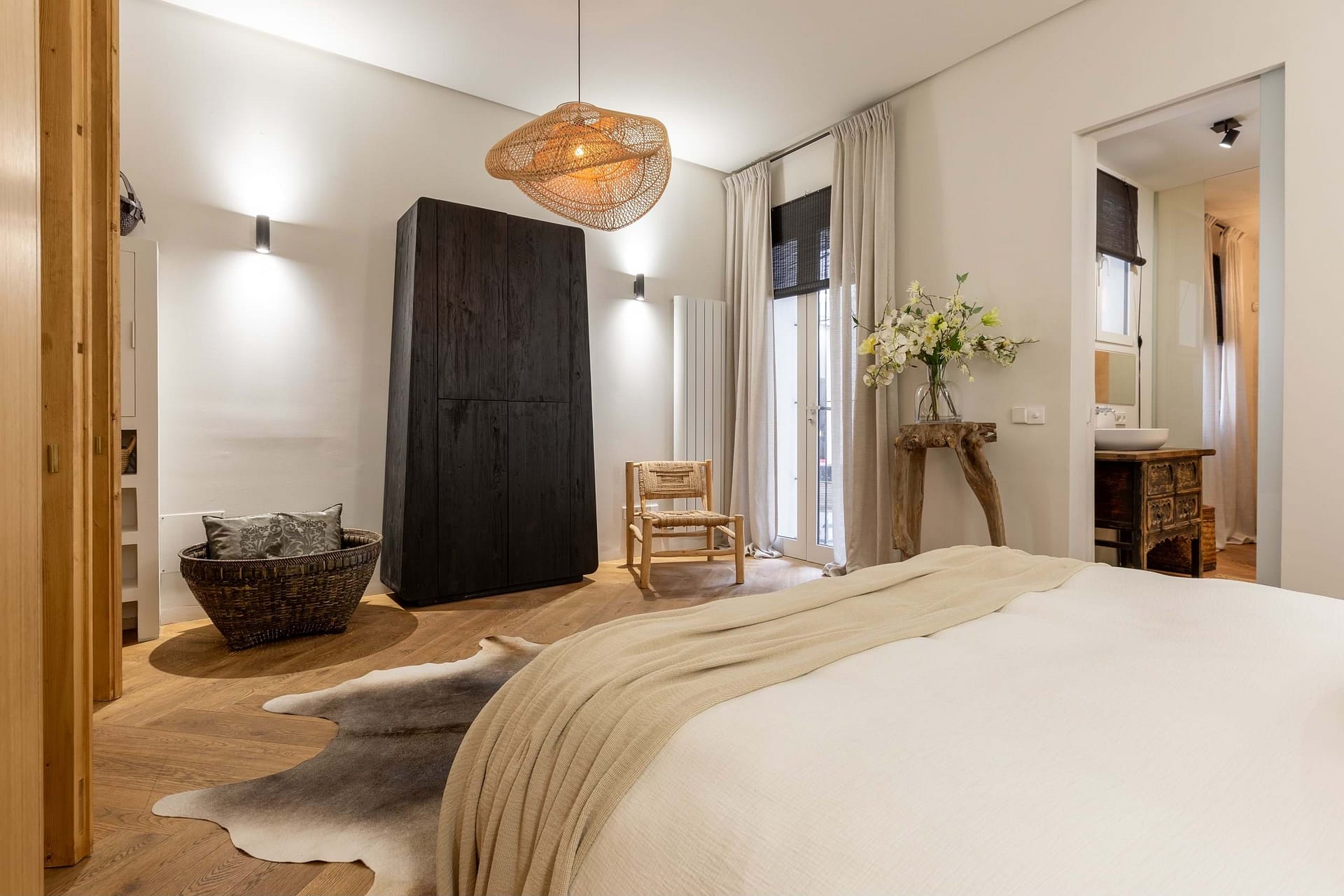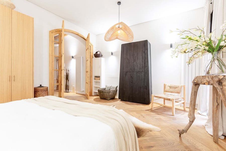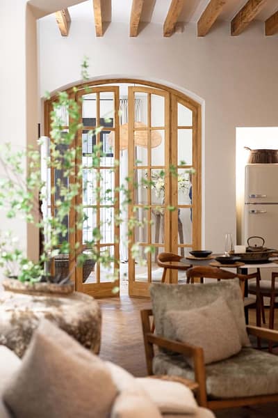 Behind an unassuming door on one of La Missio’s quieter streets, the entire ground floor of a 19th-century building has been transformed into a home that rewards attention. Original timber beams span the full width of the living space. Solid oak herringbone flooring runs throughout. Arched French doors – handmade in natural pine – divide the rooms without closing them off, drawing light from the rear of the building through to the front.