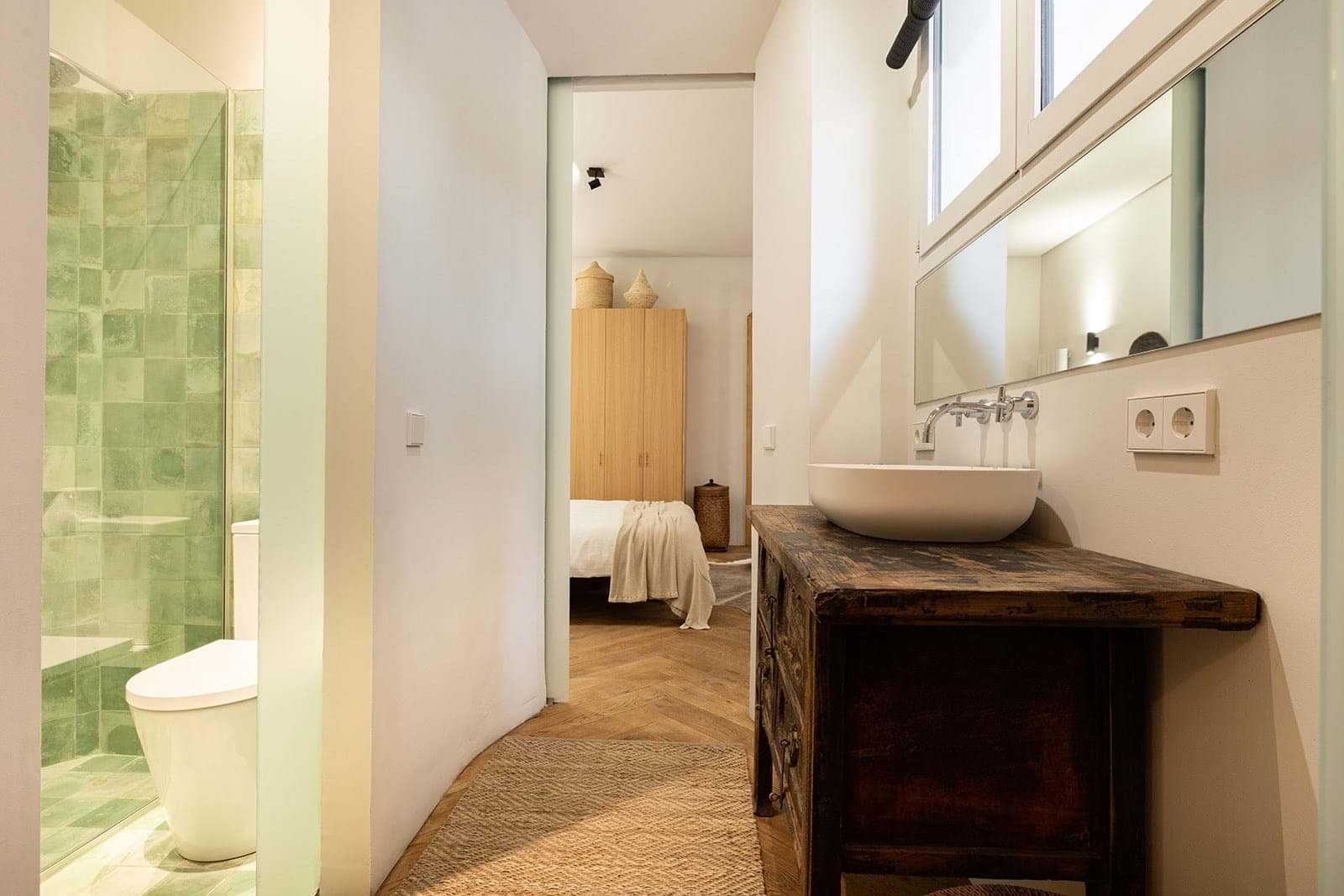 The kitchen is built around stone worktops and flush oak cabinetry – functional and refined in equal measure. The main bedroom is generous and calm, with its own private adjoining room accessible only from within – used currently as a dressing room, equally suited to a home office or reading room. The bathroom is finished in warm tadelakt-style plaster with an antique vanity unit and sage green tiled shower that feels more like a small spa than a utility.