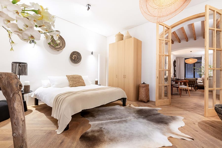 Behind an unassuming door on one of La Missio’s quieter streets, the entire ground floor of a 19th-century building has been transformed into a home that rewards attention. Original timber beams span the full width of the living space. Solid oak herringbone flooring runs throughout. Arched French doors – handmade in natural pine – divide the rooms without closing them off, drawing light from the rear of the building through to the front.