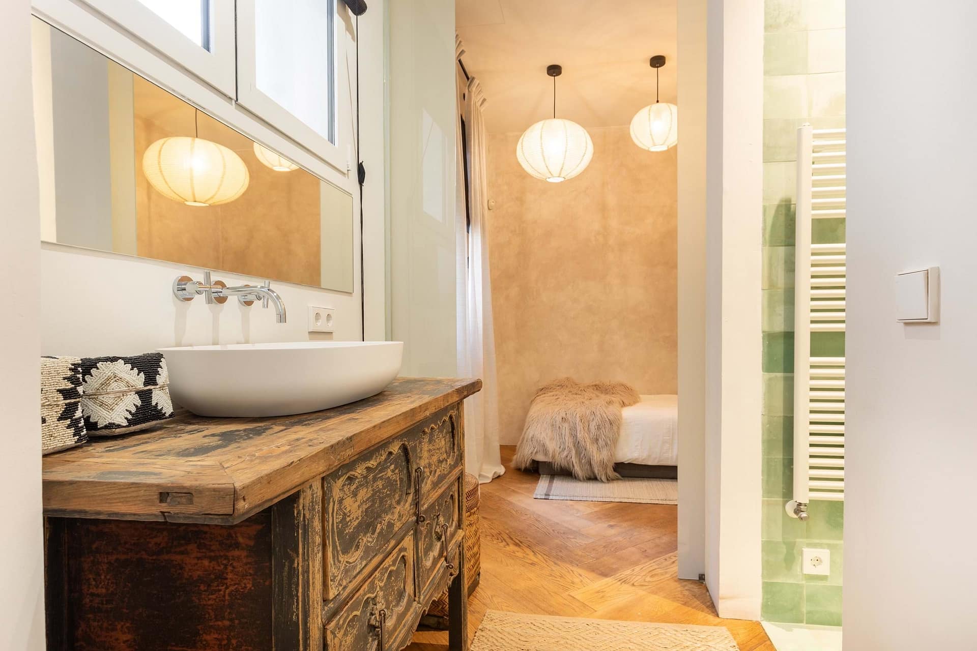 The kitchen is built around stone worktops and flush oak cabinetry – functional and refined in equal measure. The main bedroom is generous and calm, with its own private adjoining room accessible only from within – used currently as a dressing room, equally suited to a home office or reading room. The bathroom is finished in warm tadelakt-style plaster with an antique vanity unit and sage green tiled shower that feels more like a small spa than a utility.