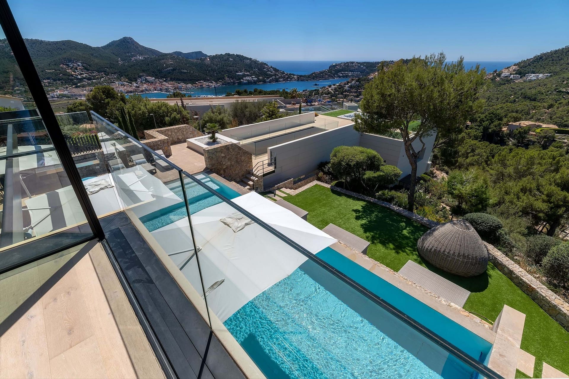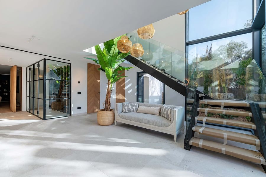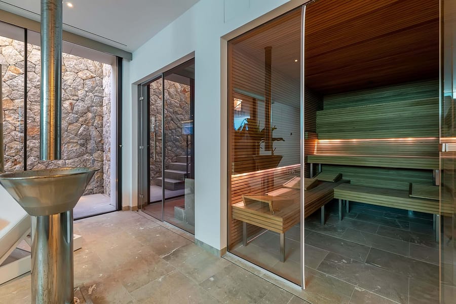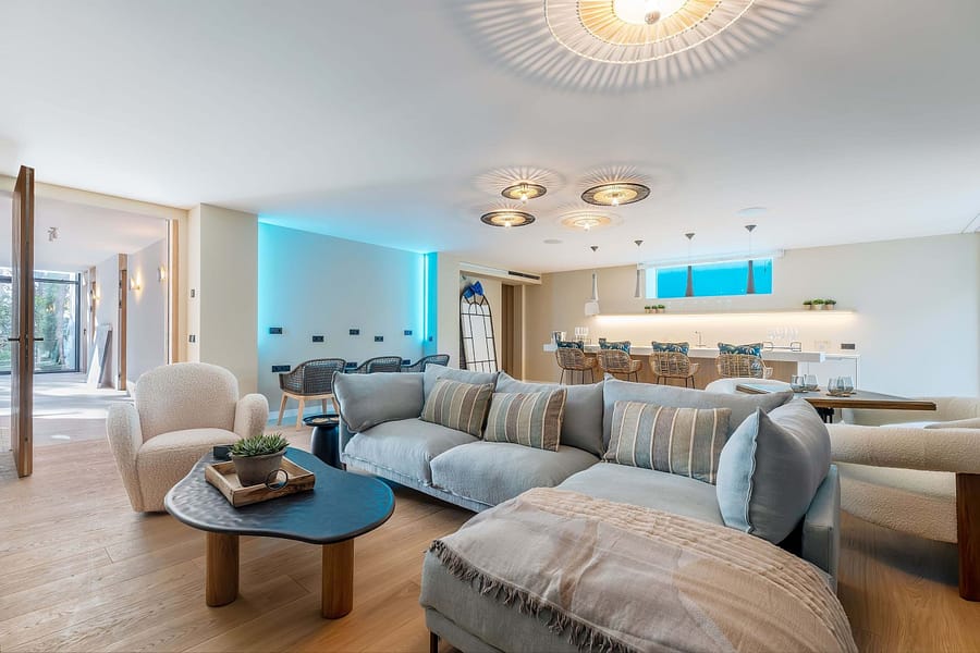 The main residence spans 1,079 sqm and features six elegant bedrooms, an expansive living area with floor-to-ceiling windows, and sweeping views of the harbor, Club de Vela, and the Mediterranean Sea. A dedicated spa and wellness area, complete with a sauna, steam room, and an ice chute illuminated by natural light from the swimming pool, provides the ultimate retreat. The home also includes a cinema, a garage with a turntable, electric car charging points, and exquisite finishes throughout.