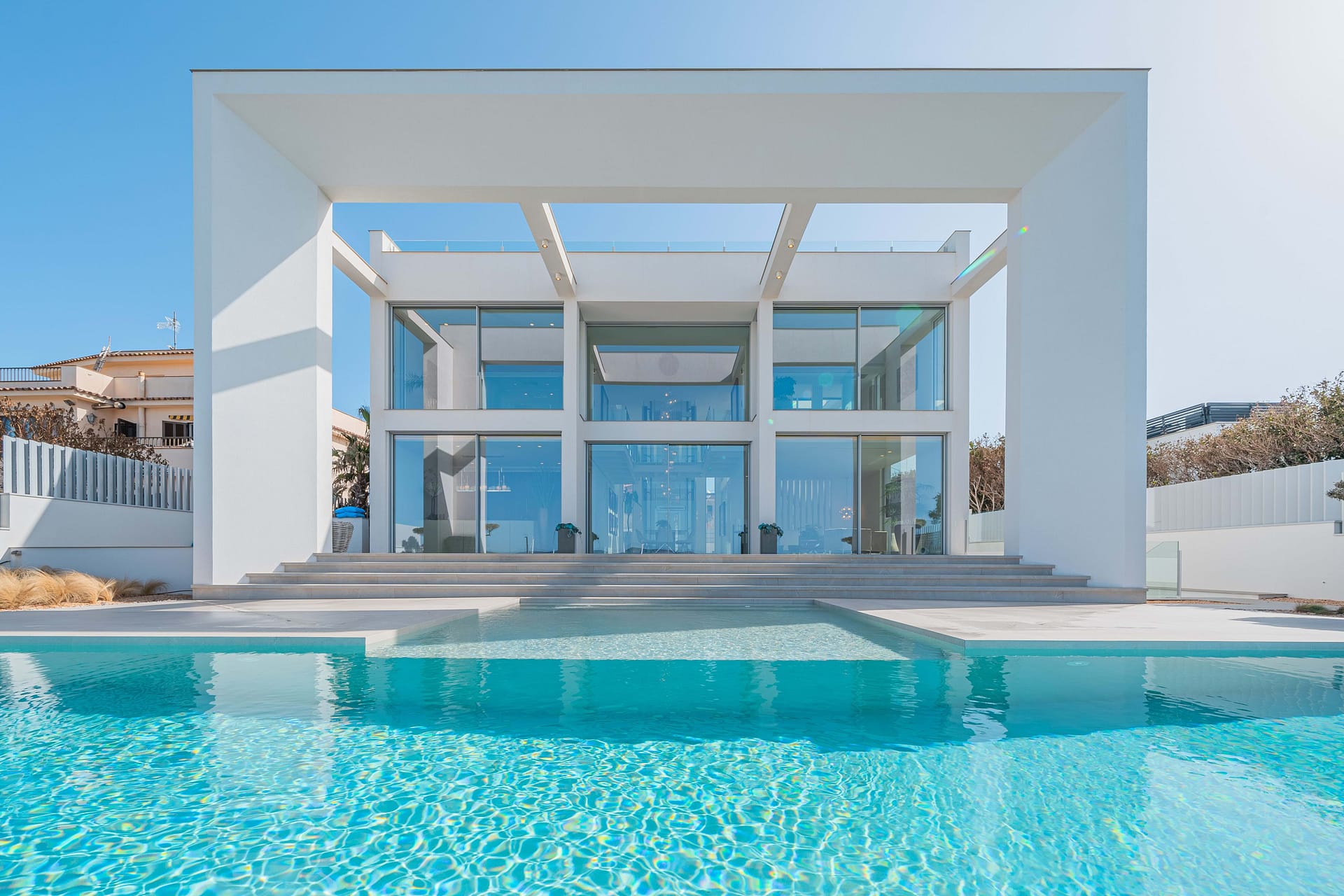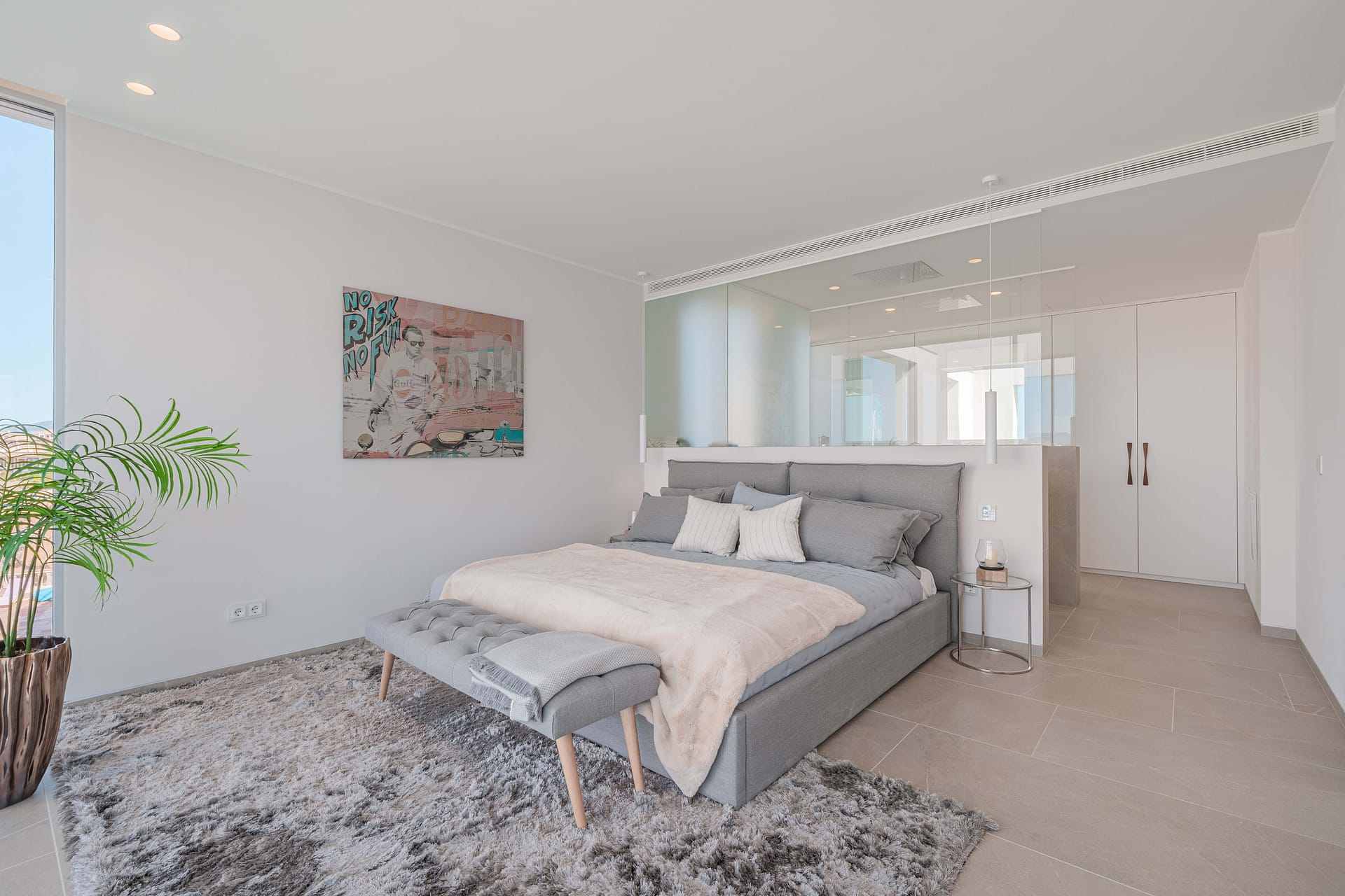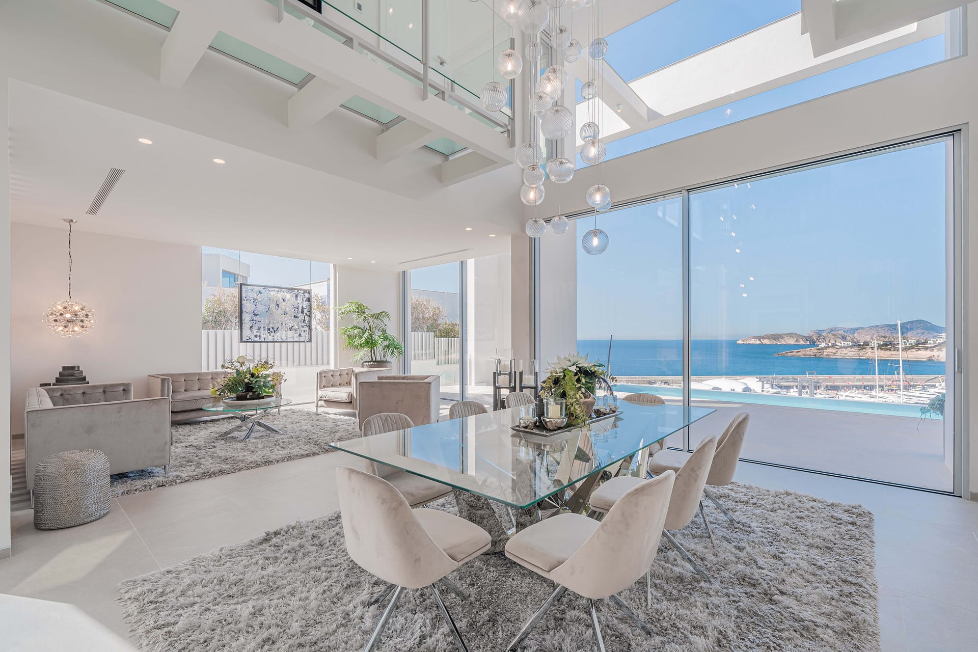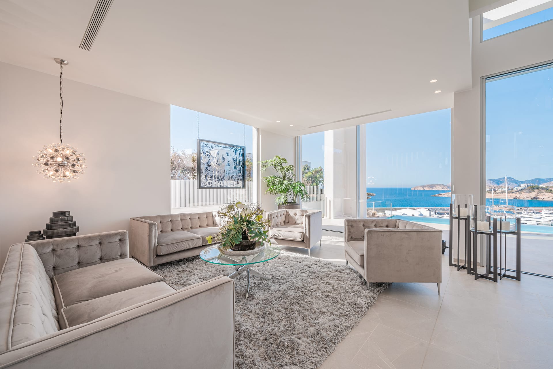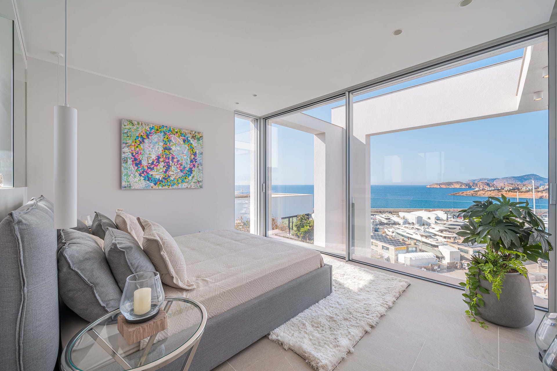 This unique, designer villa takes your breath away with its panoramic sea views as you enter the villa. Frontline and steps away to the luxurious harbour of Port Adriano. Overlooking the majestic super yachts and trendy restaurants where there is a lively and exclusive atmosphere in the summer season with live music and various food markets. Built in a spectacular, modern design, with plenty of floor to ceiling glass windows letting plenty of natural light gleam through the property. There are four spacious bedrooms, all with en-suite bathrooms, all enjoying the breathtaking sea views. Built with high quality furnishings, the offer offers an open living and kitchen area and a private elevator that takes you to all floors from the basement and double garage up to a spacious roof terrace that provides all-day-long sunshine. The unique villa also offers a wine cellar, private gym as well as a cinema room amongst many other features such as underfloor heating with heat pump, domotic BUS system, fully-equipped, high quality kitchen and fireplace. Port Adriano offers all kinds of amenities, from restaurants, cafes, supermarkets and within a 20 minute drive from the centre of Palma and the International Airport.