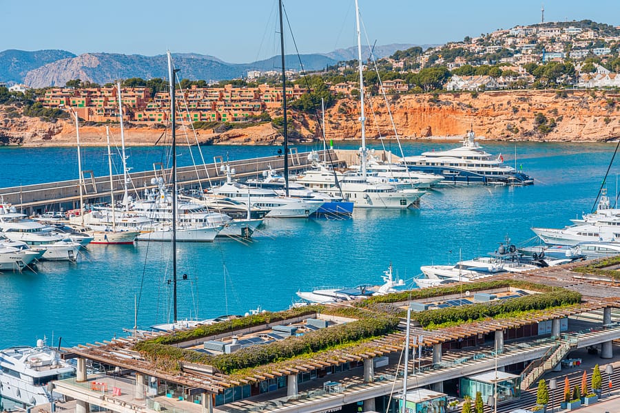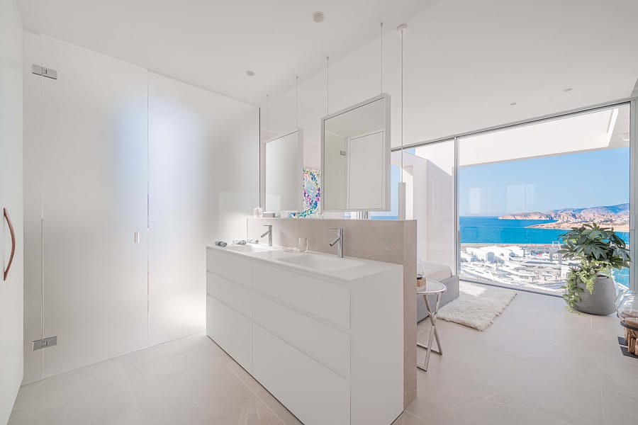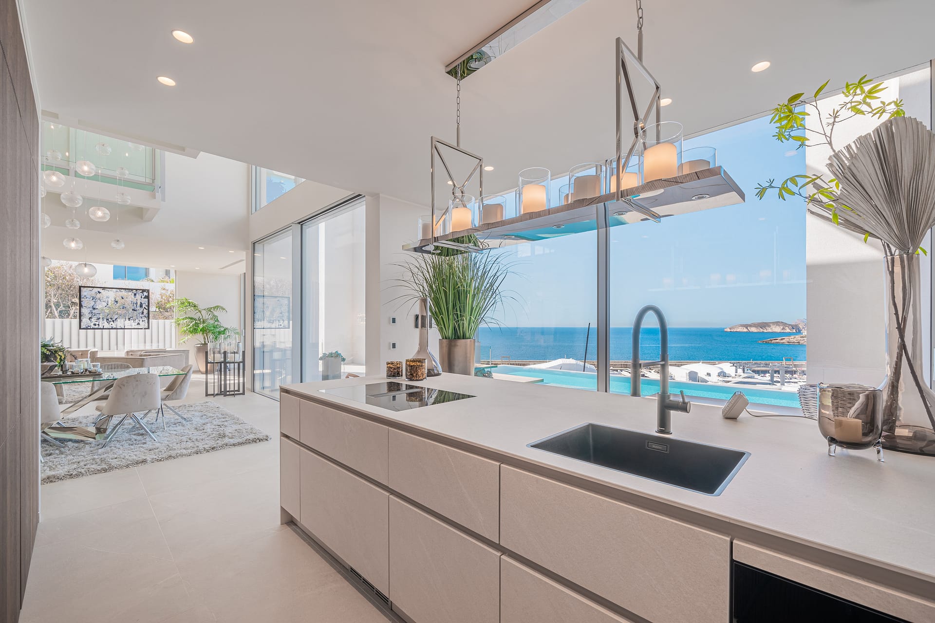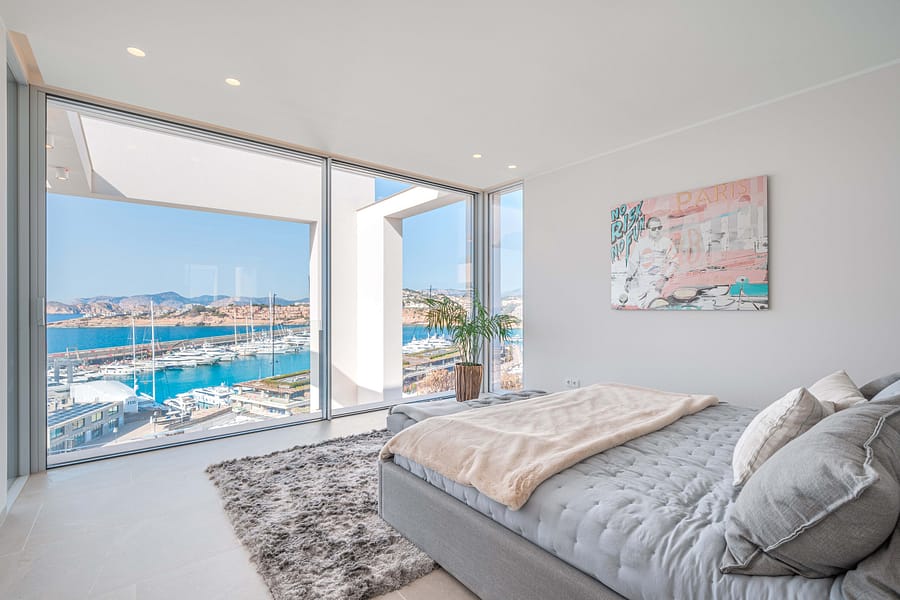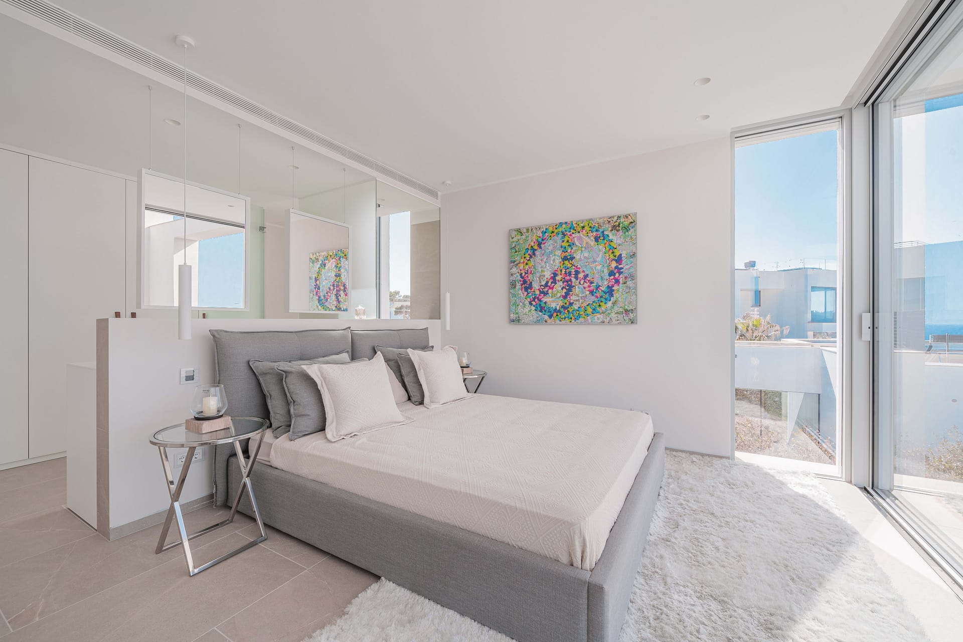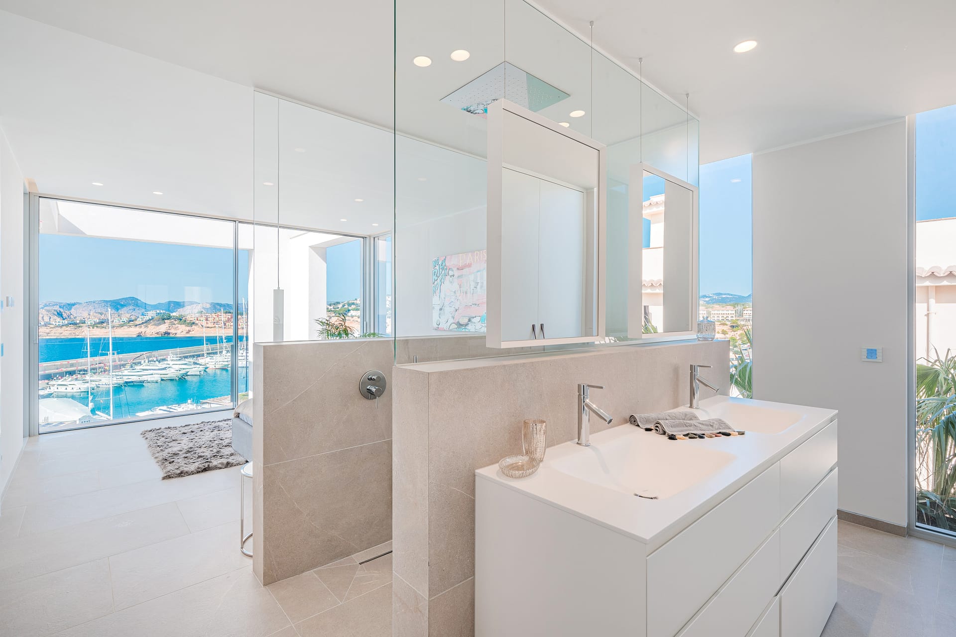This unique, designer villa takes your breath away with its panoramic sea views as you enter the villa. Frontline and steps away to the luxurious harbour of Port Adriano. Overlooking the majestic super yachts and trendy restaurants where there is a lively and exclusive atmosphere in the summer season with live music and various food markets. Built in a spectacular, modern design, with plenty of floor to ceiling glass windows letting plenty of natural light gleam through the property. There are four spacious bedrooms, all with en-suite bathrooms, all enjoying the breathtaking sea views. Built with high quality furnishings, the offer offers an open living and kitchen area and a private elevator that takes you to all floors from the basement and double garage up to a spacious roof terrace that provides all-day-long sunshine. The unique villa also offers a wine cellar, private gym as well as a cinema room amongst many other features such as underfloor heating with heat pump, domotic BUS system, fully-equipped, high quality kitchen and fireplace. Port Adriano offers all kinds of amenities, from restaurants, cafes, supermarkets and within a 20 minute drive from the centre of Palma and the International Airport.