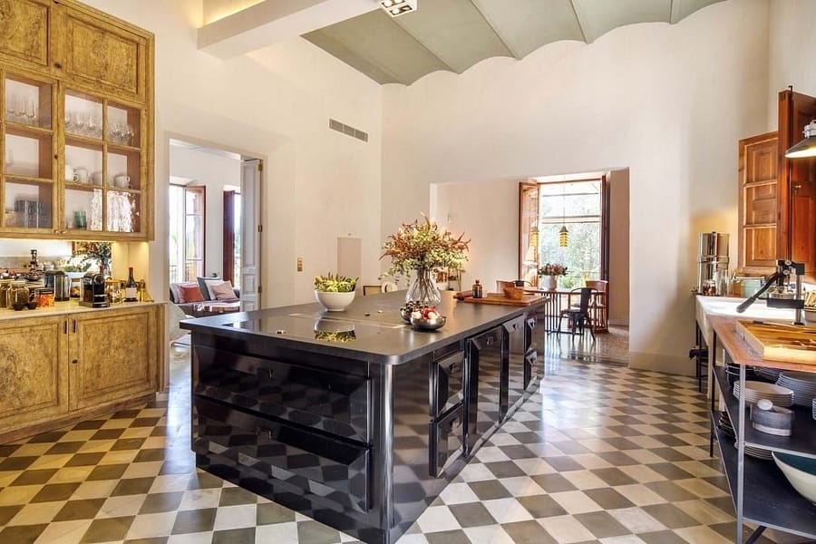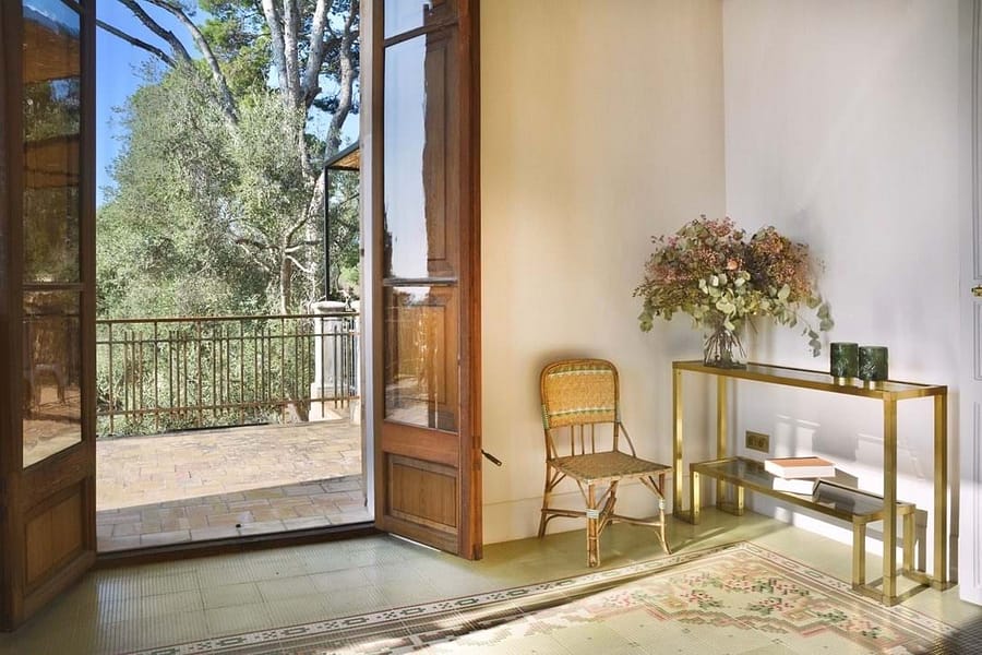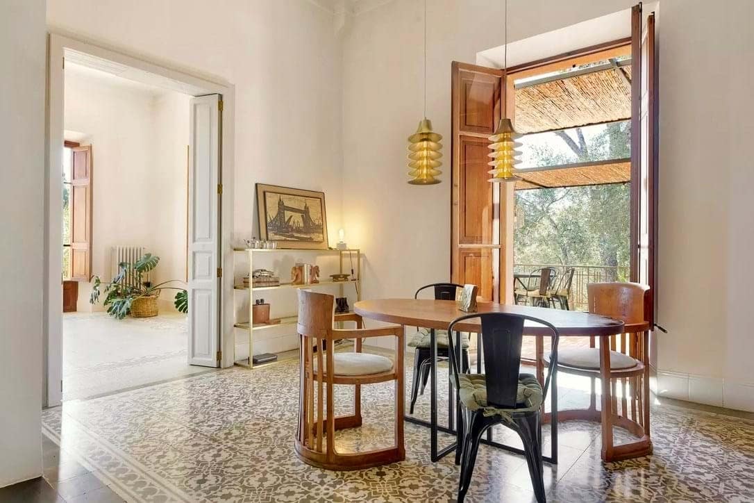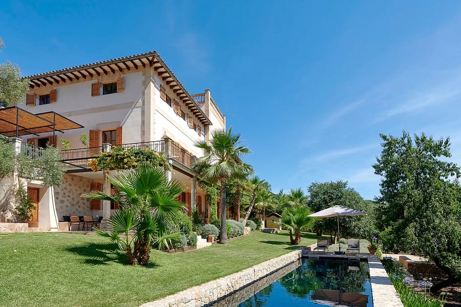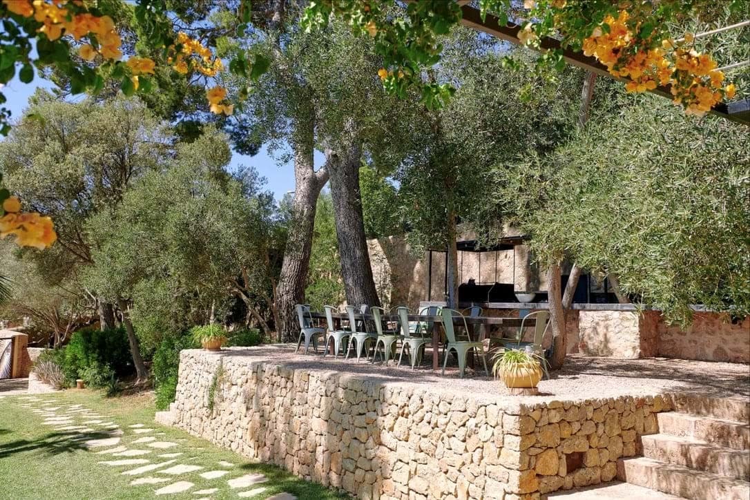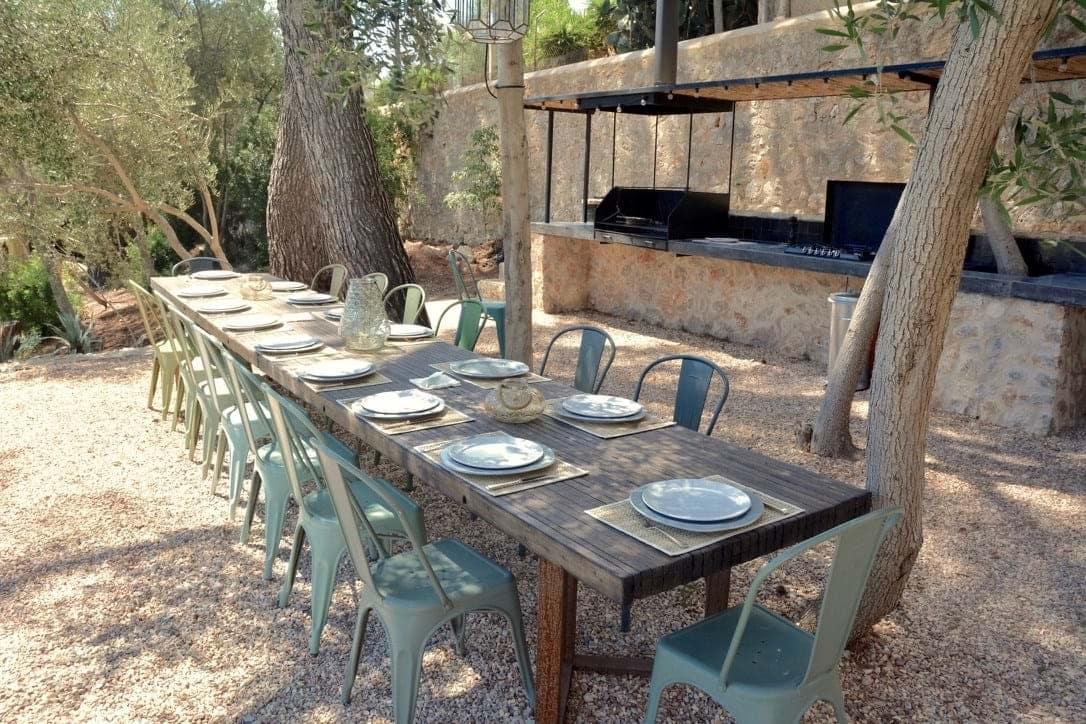 The main kitchen blends 1920s character with state-of-the-art appliances and flows into spacious living areas designed for social gatherings. Outdoors, landscaped gardens invite relaxation, while a heated pool with underwater music offers the ultimate in luxury leisure. Shaded terraces, an outdoor kitchen, and a charcoal grill create the perfect setting for evenings under the Mallorcan sky. Surrounded by olive and pine trees, the estate provides a serene retreat and an ideal backdrop for unforgettable holidays.