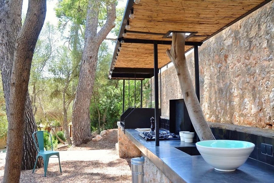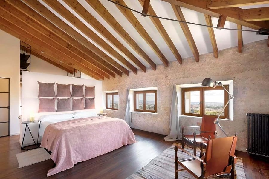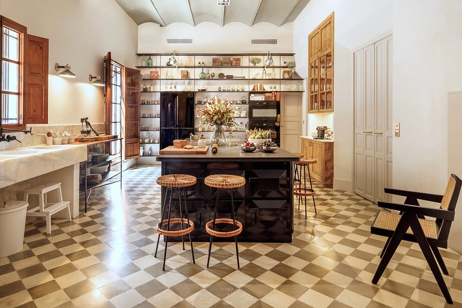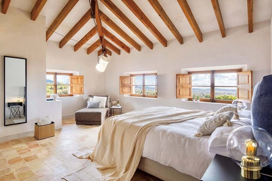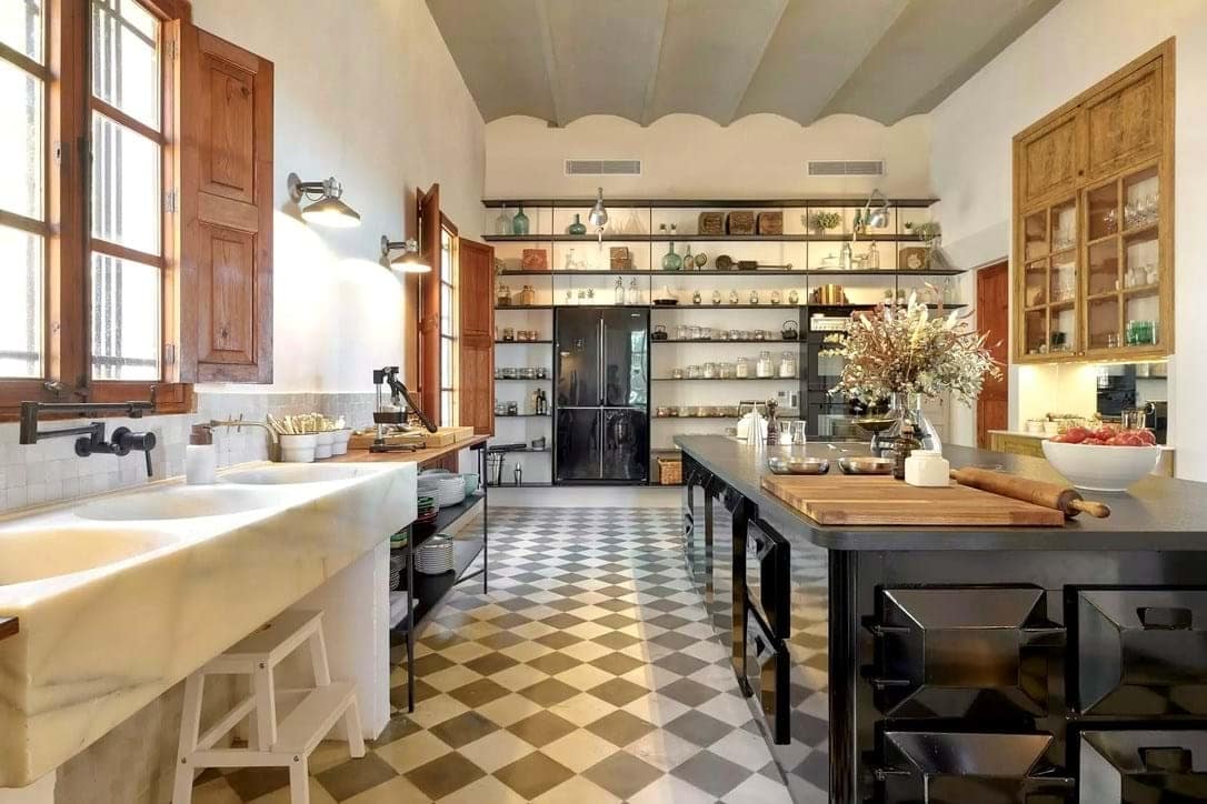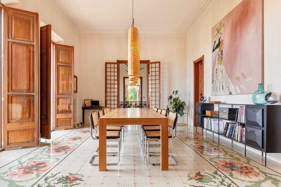 The main kitchen blends 1920s character with state-of-the-art appliances and flows into spacious living areas designed for social gatherings. Outdoors, landscaped gardens invite relaxation, while a heated pool with underwater music offers the ultimate in luxury leisure. Shaded terraces, an outdoor kitchen, and a charcoal grill create the perfect setting for evenings under the Mallorcan sky. Surrounded by olive and pine trees, the estate provides a serene retreat and an ideal backdrop for unforgettable holidays.