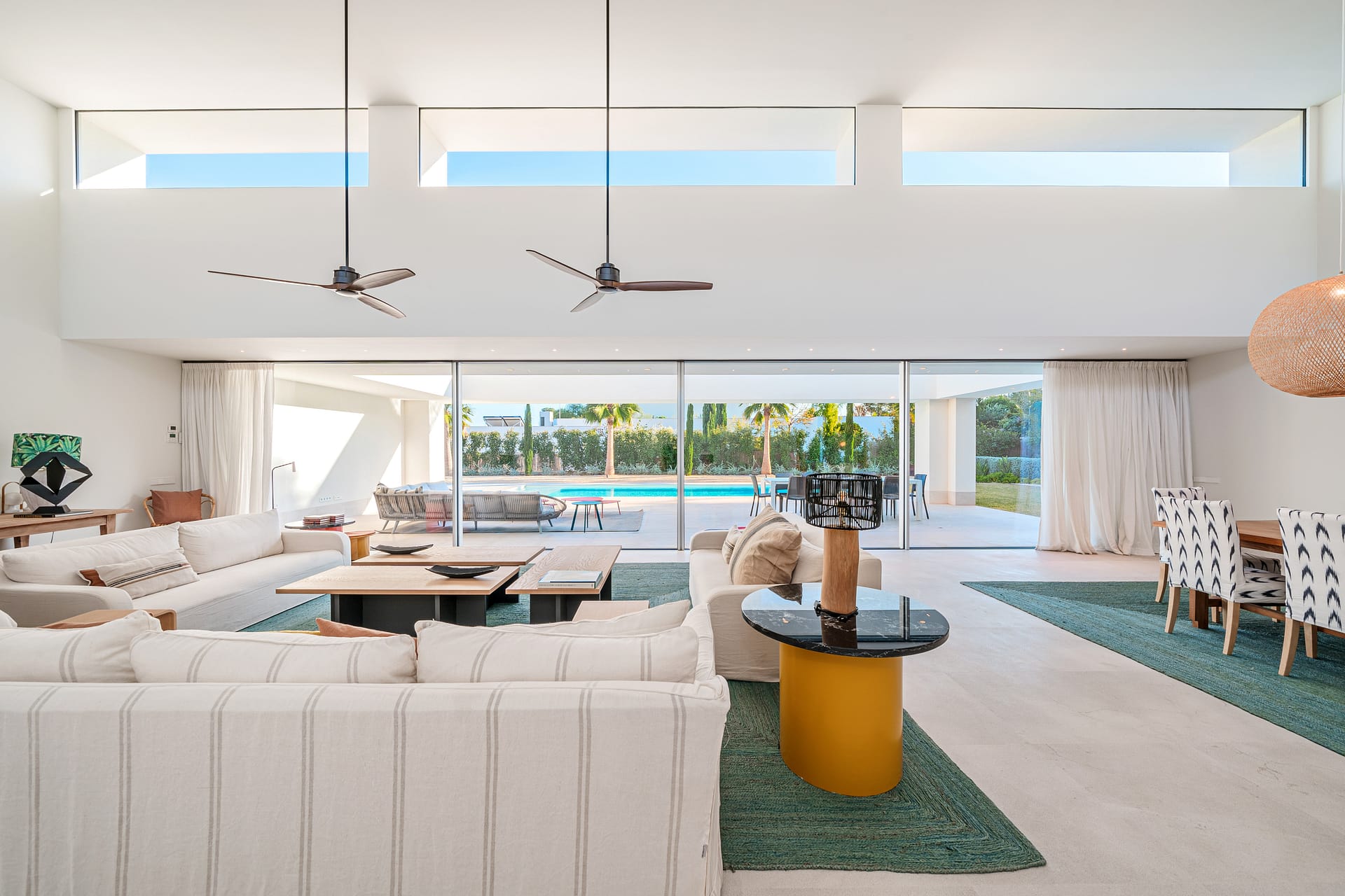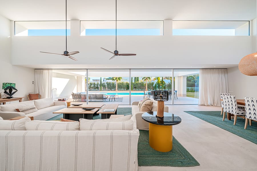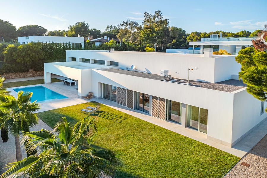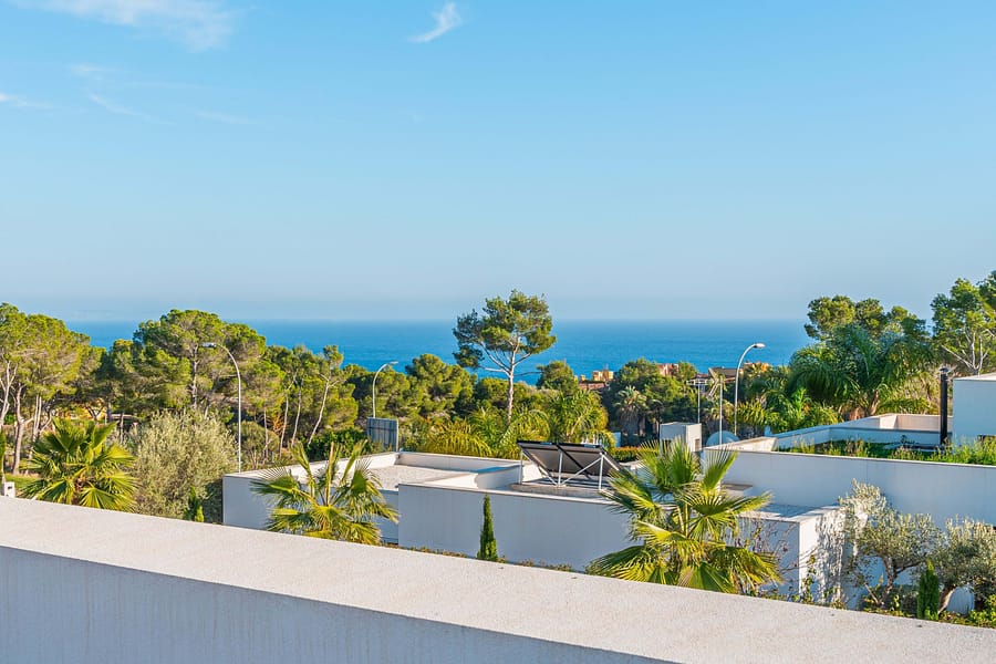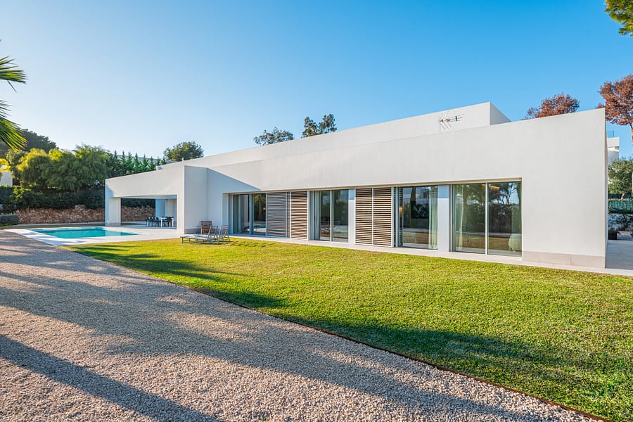 Nestled in the serene Sol de Mallorca urbanization, just a 20-minute drive from the vibrant heart of Palma, lies a masterpiece of modern living – a standalone villa that redefines elegance with its sleek, linear design. This haven of tranquility boasts a sparkling private pool, set amidst the backdrop of double-height ceilings, expansive floor-to-ceiling windows, and seamless sliding doors. These architectural marvels lead to enchanting private terraces and inviting chill-out zones, crafting the perfect ambiance for alfresco dining and leisure under the Mallorcan sun. Spanning a generous 400m all on one convenient level, this home is the epitome of practical luxury. It features five sumptuous bedrooms, each with its own ensuite bathroom, bespoke built-in wardrobes, and direct access to the sprawling terraces and lush, flat garden. The master suite, a sanctuary of comfort, includes a spacious walk-in wardrobe. Two additional bedrooms are perfectly suited for guests or family, with a fourth offering the grandeur of a secondary master suite. A fifth bedroom, ideally situated near the kitchen and laundry areas, provides privacy and independence, making it perfect for staff or as an additional guest room. The heart of the home is the expansive living and dining area, opening out onto covered terraces and the garden, with its private oasis-like pool. The state-of-the-art kitchen, featuring a cooking island and built-in appliances, is thoughtfully designed for both formal and informal gatherings. Adjacent to the kitchen is a cozy space with a sofa and TV area, which can be integrated into the main living space through double sliding doors for larger celebrations. Luxury is in every detail, from underfloor heating and air conditioning for year-round comfort, to solar panels and high-grade Schco sliding windows for energy efficiency and aesthetic appeal. Stone flooring, a sophisticated alarm system, and a two-car garage are just the beginning. The garden is a playground for all ages, and the rooftop terrace offers endless possibilities for relaxation and entertainment, with potential for a chill-out lounge, outdoor kitchen, or jacuzzi, all overlooking the mesmerizing south-facing sea vistas. Located minutes away from pristine sandy beaches, elite golf courses, shopping, and international schools, and within easy reach of the exclusive marinas of Puerto Portals and Port Adriano, Sol de Mallorca offers a distinguished lifestyle away from the bustle yet within the heart of Mallorca’s sought-after southwest. This villa is more than a home; it’s a lifestyle choice for those seeking sophistication, convenience, and a touch of luxury in one of the island’s most coveted locales.
