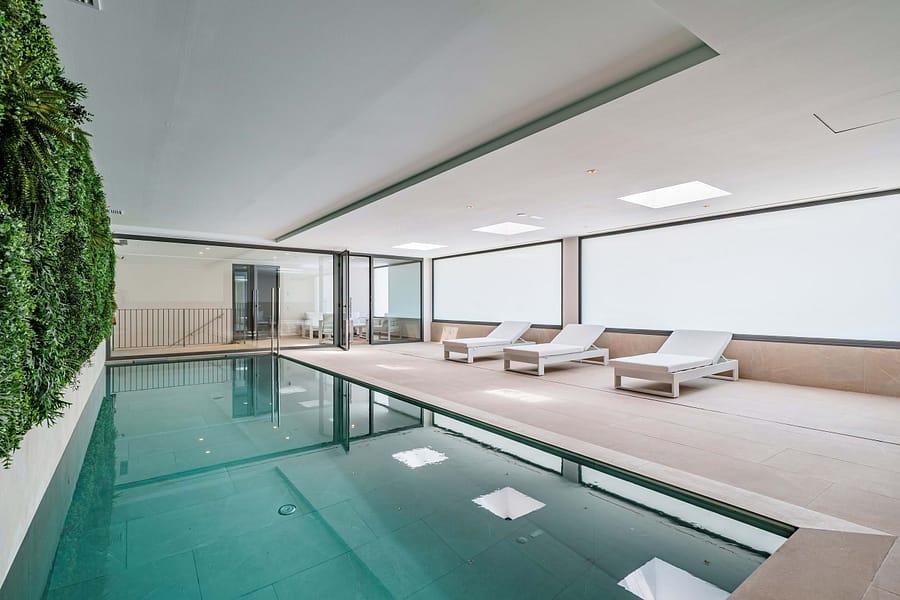 This exclusive residential complex offers a variety of amenities, including a spacious outdoor pool with a sun terrace, a modern wellness area with a gym, sauna, and heated indoor pool, as well as a three-level underground garage with generous parking spaces, e-charging stations, and private storage rooms. Comfort and peace-of-mind is further prioritized with elevators and high-quality security equipment.