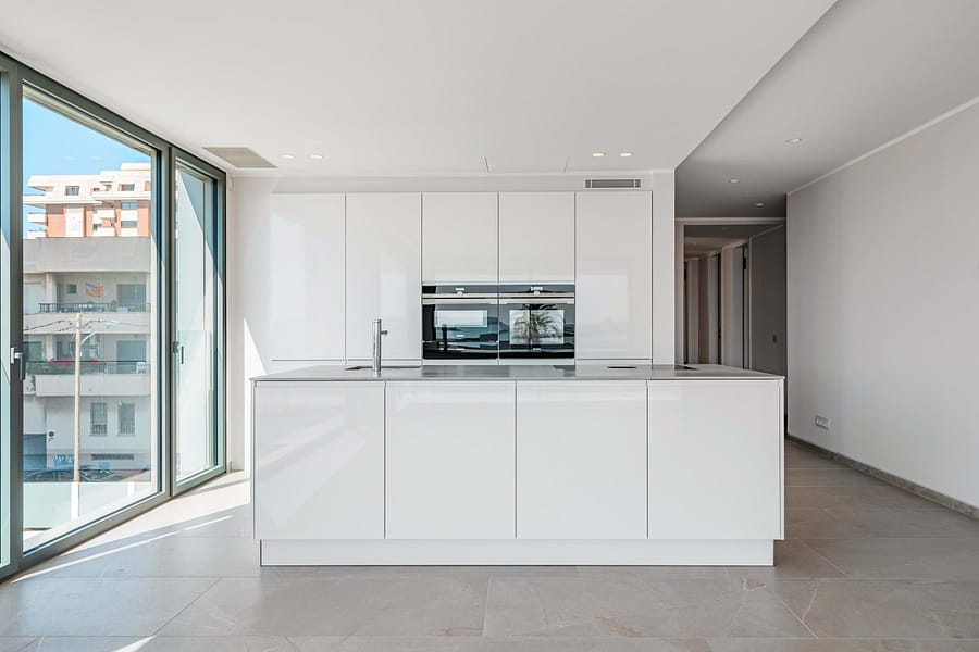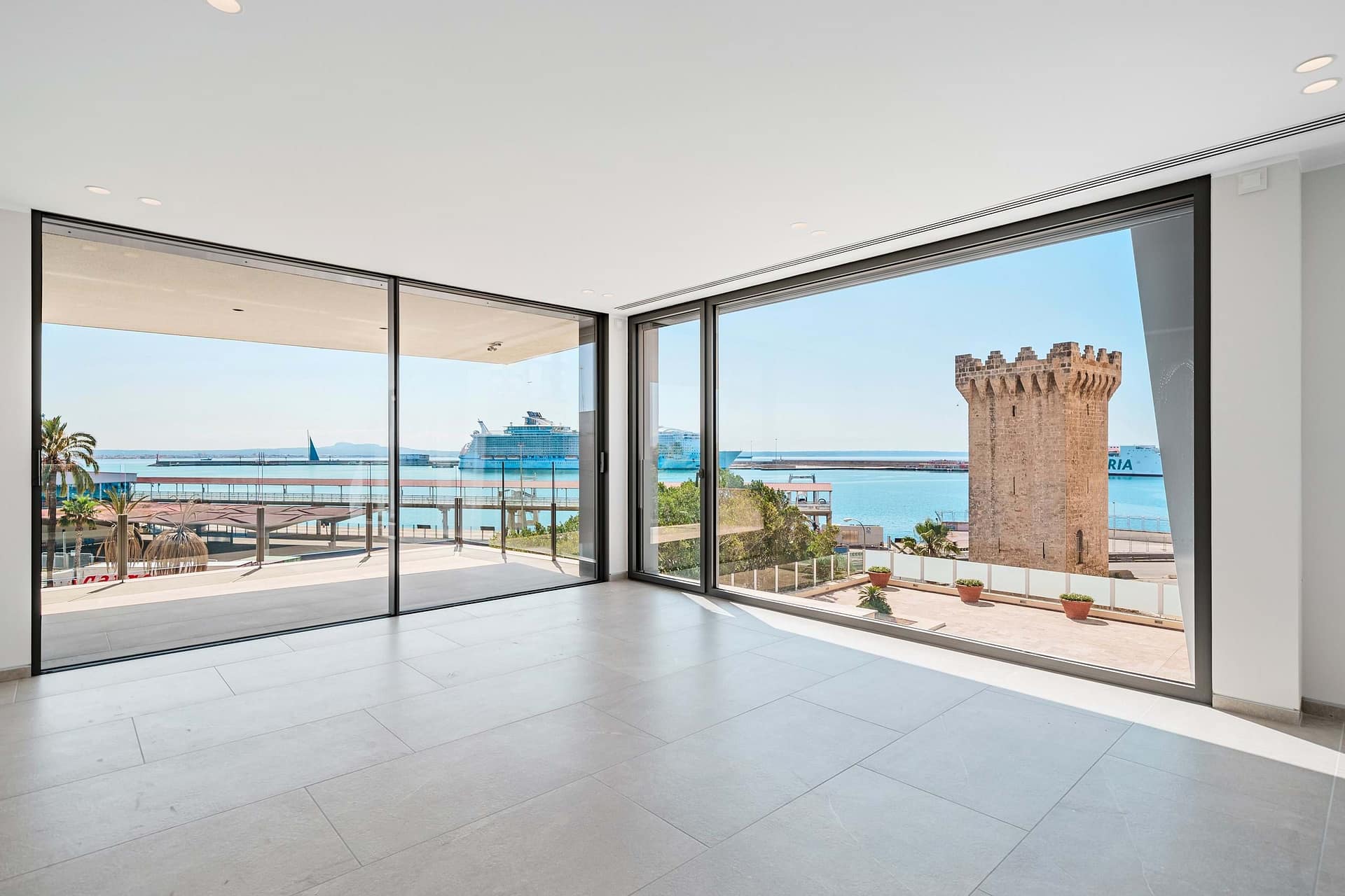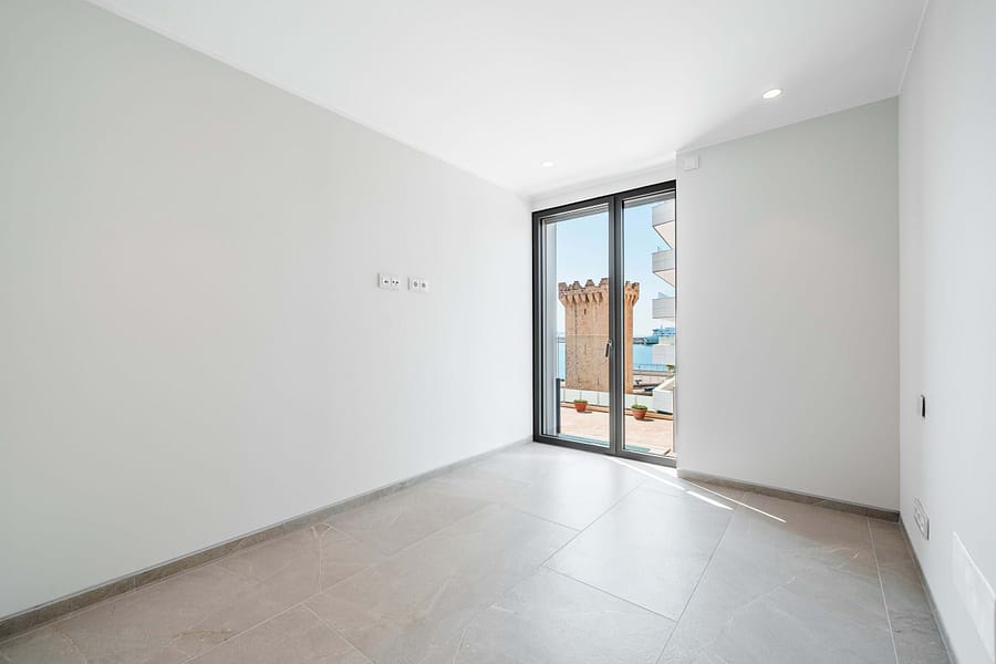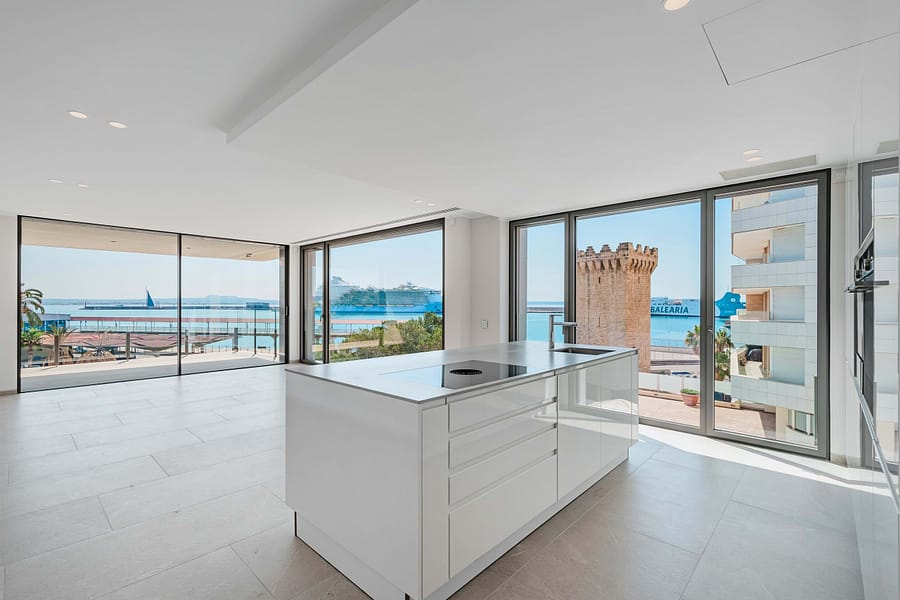 This luxurious new build apartment is situated front-row to the Sea, on Palma’s sought-after Paseo Marítimo and offers spectacular views of the harbor, the open sea, and the impressive superyachts of the adjacent Club de Mar. This modern residential complex with only 15 units has just been complete and combines contemporary architecture with the highest level of living comfort. Generous glass facades, elegant natural stone cladding, and a well-thought-out design give the building its striking, high-quality appearance.