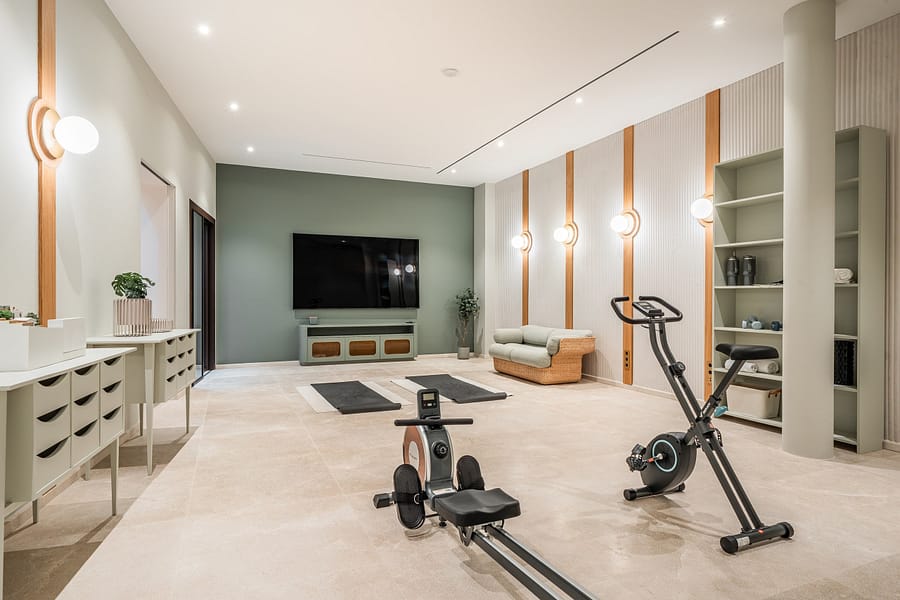 The wellness and leisure area also leaves nothing to be desired: a designer sauna, a spacious fitness room. And a spacious home cinema create space for relaxation and entertainment at the highest level. A special highlight is the temperature controlled bodega in a traditional vaulted cellar made of Mares stone, which will delight wine lovers.