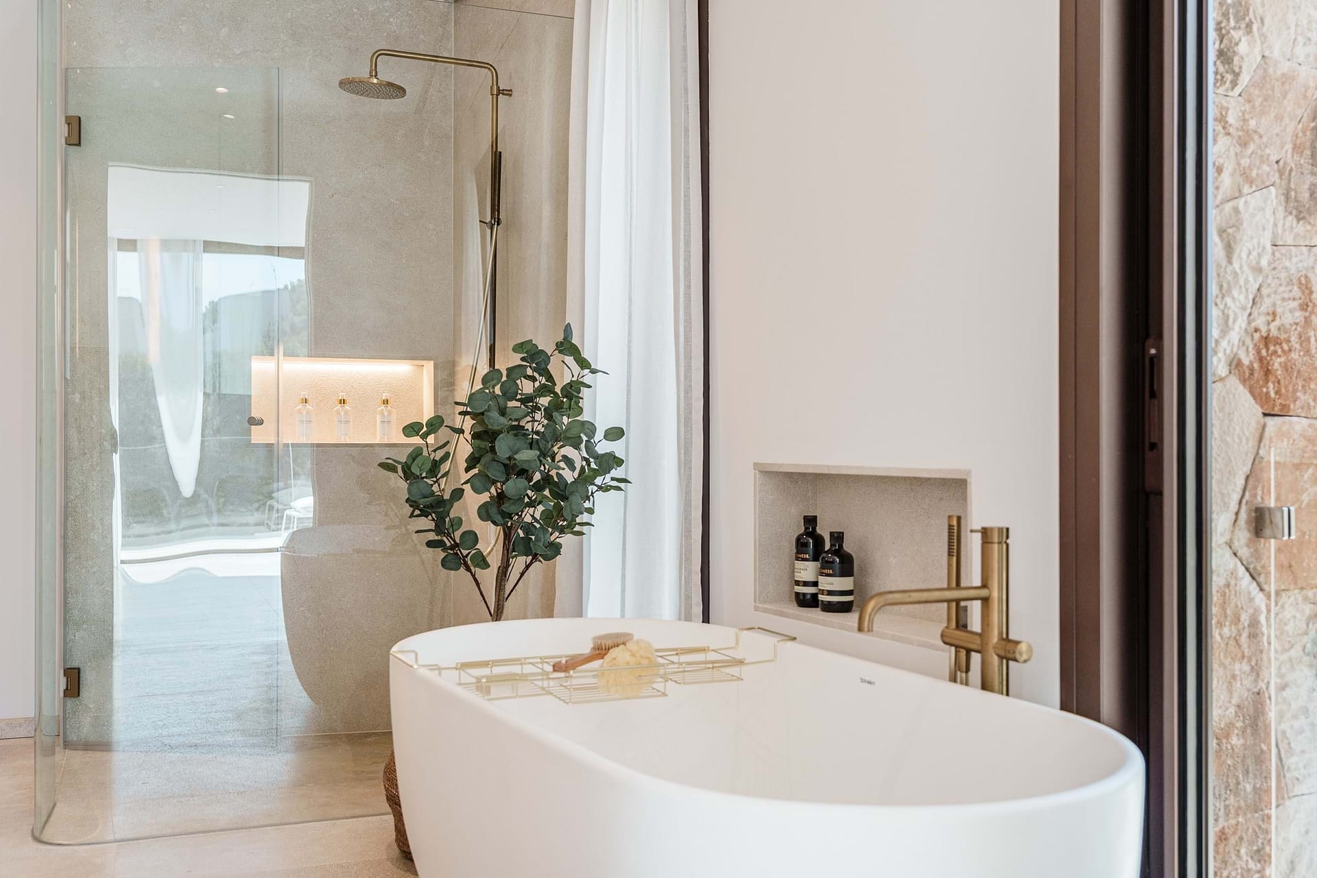 The open plan living and dining area forms the heart of the villa. The elegant oak kitchen with fine Aquabella natural stone worktops and high quality Miele appliances meets the highest standards and offers direct access to the spacious pool terrace. Here, indoor and outdoor living merge in a special way, creating a Mediterranean lifestyle.