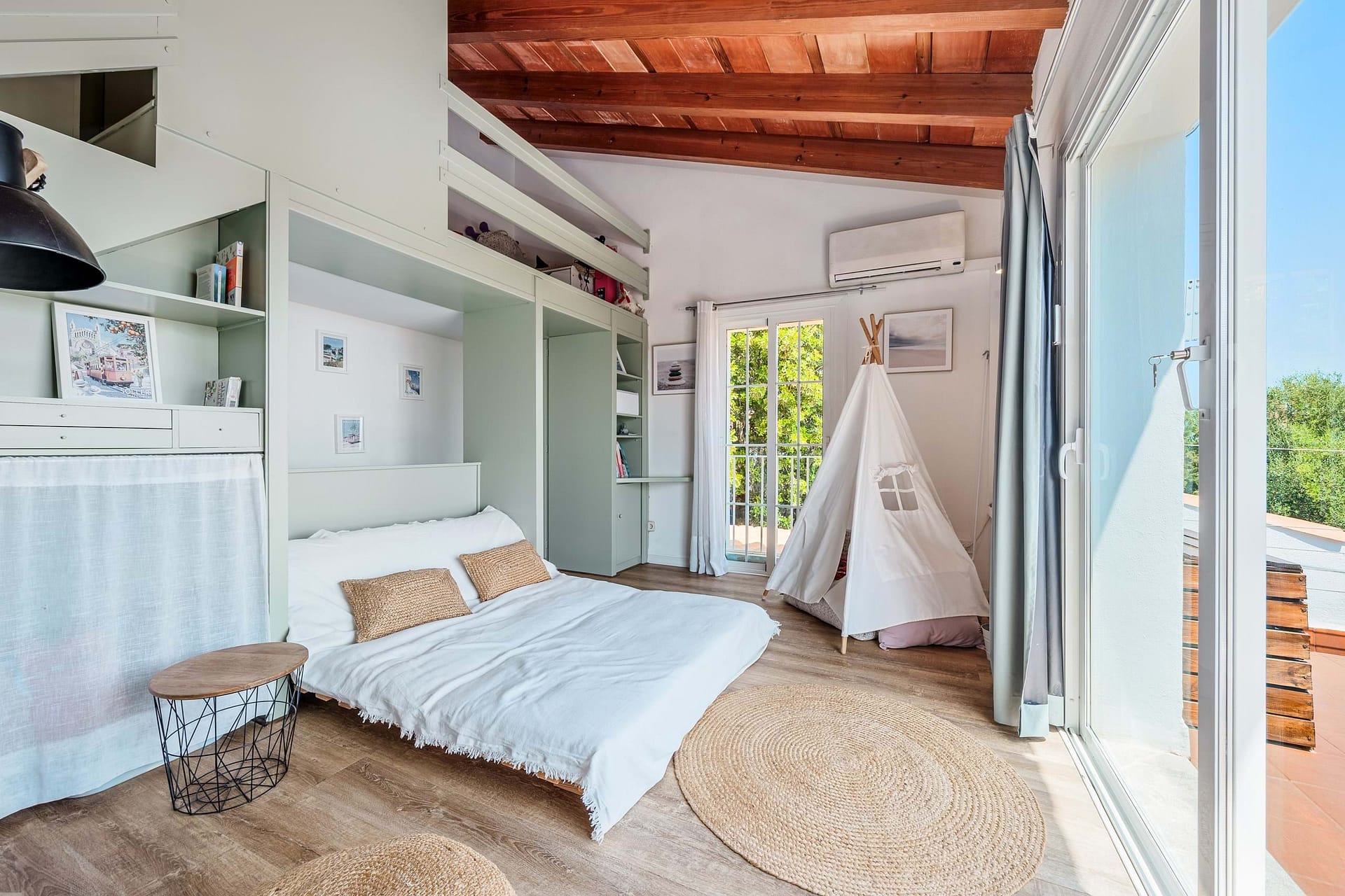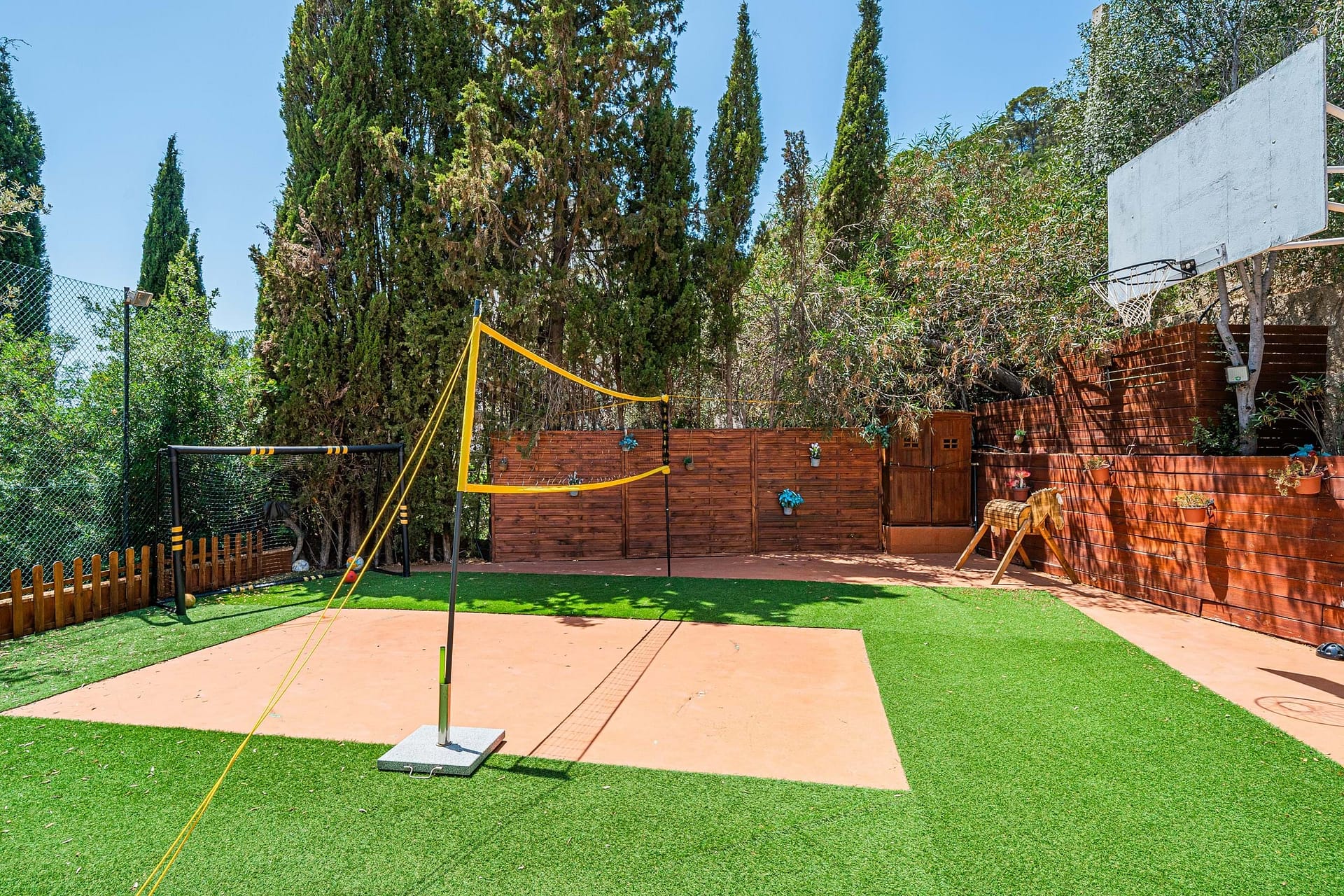 Outside, the villa impresses with a generous wooden deck surrounding the pool, a beautifully landscaped garden dotted with mature olive trees, several quiet seating areas, and a designated play area for children.