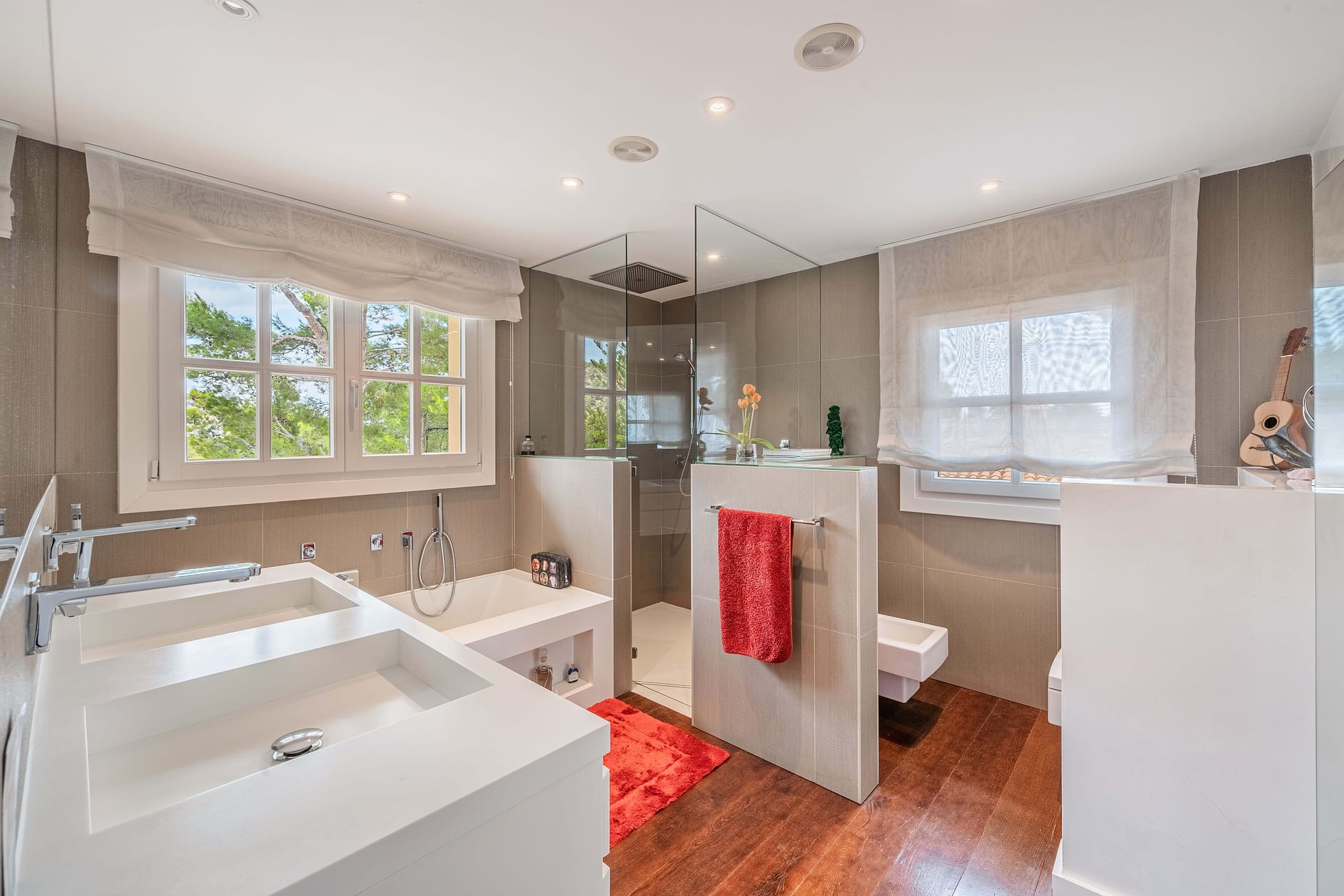 Nestled atop of Costa d’en Blanes, this exquisite villa boasts a captivating sea view and is situated on a serene cul-de-sac street. Just a brief 3-minute drive away lies the renowned Puerto Portals, while the vibrant city of Palma is a mere 8-minute journey. Moreover, this location provides easy access to a variety of esteemed international schools. Immersed in sunlight from dawn till dusk, the property offers a panorama that extends all the way to Ibiza on clear days. Graced with a level lawn garden, it presents dual views of Palma Bay and Palmanova Bay, rendering it ideal for both year-round family living and those in pursuit of a second home. The villa’s layout offers an expansive entrance hall guides you to a cozy living room featuring a fireplace, seamlessly transitioning into an open-plan kitchen and dining area. Additionally, a guest bedroom suite and guest powder room are found on this level. Flowing from the kitchen and dining space is a covered porch with a summer kitchen and grill, leading to the manicured lawn garden and a pool area styled with Balinese influences. As you ascend up the stairs in the entrance hall, you’ll reach a spacious primary bedroom suite with an adjoining lounge area and a private terrace that bestows breathtaking sea views. A second suite, complete with a sitting space, as well as an additional guest bedroom suite with a generously proportioned terrace overlooking the sea and mountains. Designed to ensure comfort throughout the entire year, the property is adorned with elegant wooden flooring, underfloor heating, and air conditioning. A well-appointed Birgit Mueller kitchen, a separate laundry room, an irrigation system, and a garage further enhance the amenities of this home.