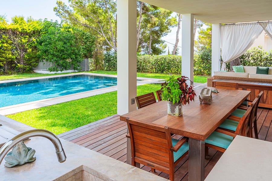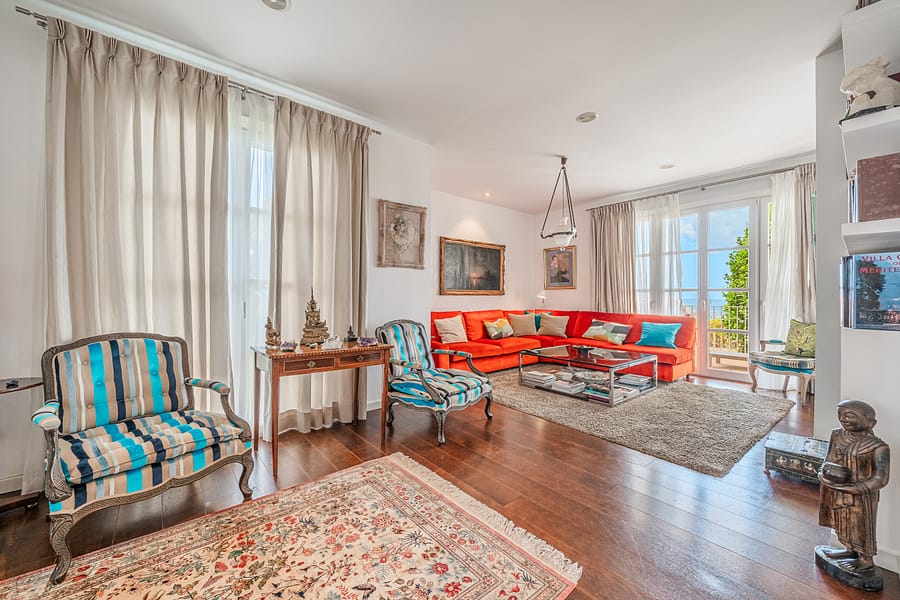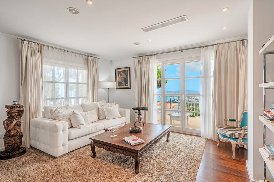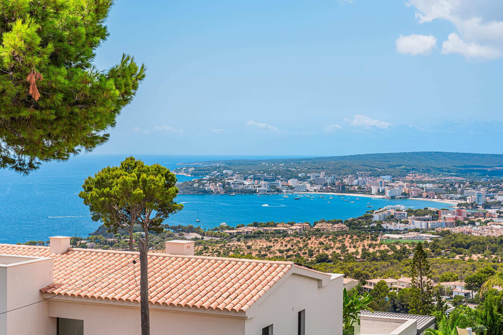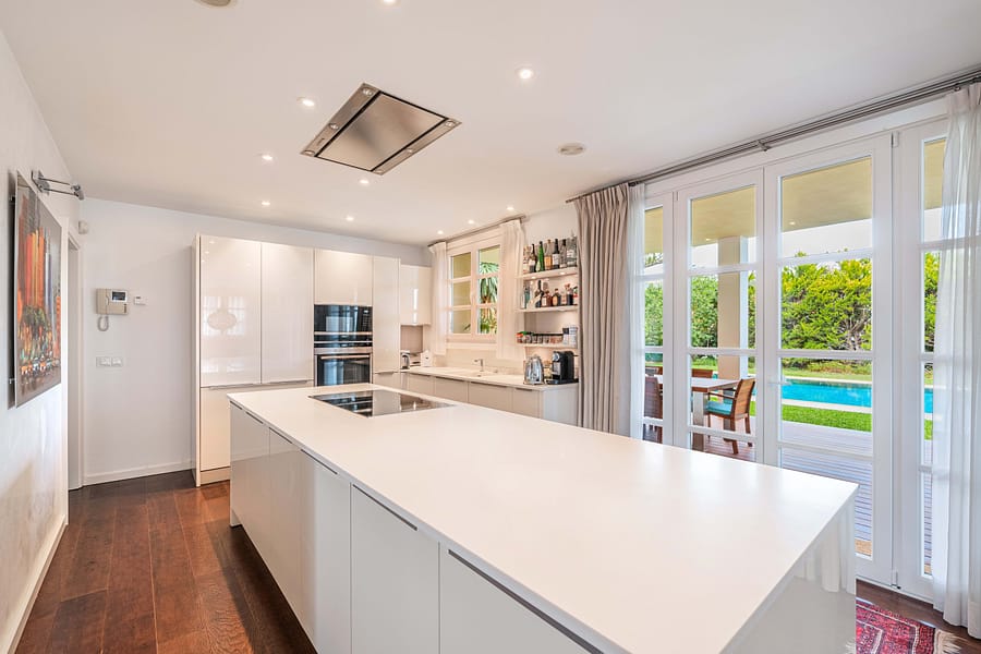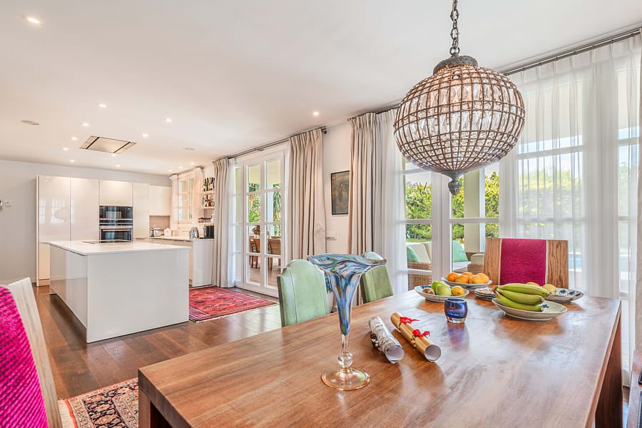 Nestled atop of Costa d’en Blanes, this exquisite villa boasts a captivating sea view and is situated on a serene cul-de-sac street. Just a brief 3-minute drive away lies the renowned Puerto Portals, while the vibrant city of Palma is a mere 8-minute journey. Moreover, this location provides easy access to a variety of esteemed international schools. Immersed in sunlight from dawn till dusk, the property offers a panorama that extends all the way to Ibiza on clear days. Graced with a level lawn garden, it presents dual views of Palma Bay and Palmanova Bay, rendering it ideal for both year-round family living and those in pursuit of a second home. The villa’s layout offers an expansive entrance hall guides you to a cozy living room featuring a fireplace, seamlessly transitioning into an open-plan kitchen and dining area. Additionally, a guest bedroom suite and guest powder room are found on this level. Flowing from the kitchen and dining space is a covered porch with a summer kitchen and grill, leading to the manicured lawn garden and a pool area styled with Balinese influences. As you ascend up the stairs in the entrance hall, you’ll reach a spacious primary bedroom suite with an adjoining lounge area and a private terrace that bestows breathtaking sea views. A second suite, complete with a sitting space, as well as an additional guest bedroom suite with a generously proportioned terrace overlooking the sea and mountains. Designed to ensure comfort throughout the entire year, the property is adorned with elegant wooden flooring, underfloor heating, and air conditioning. A well-appointed Birgit Mueller kitchen, a separate laundry room, an irrigation system, and a garage further enhance the amenities of this home.