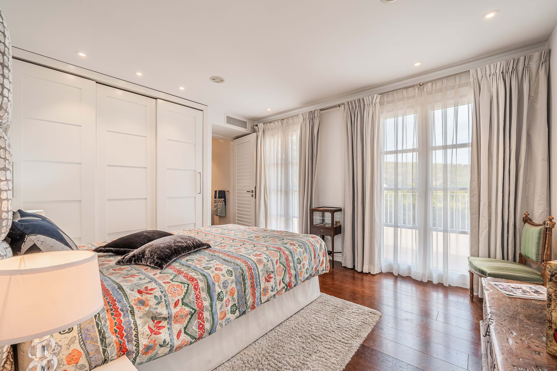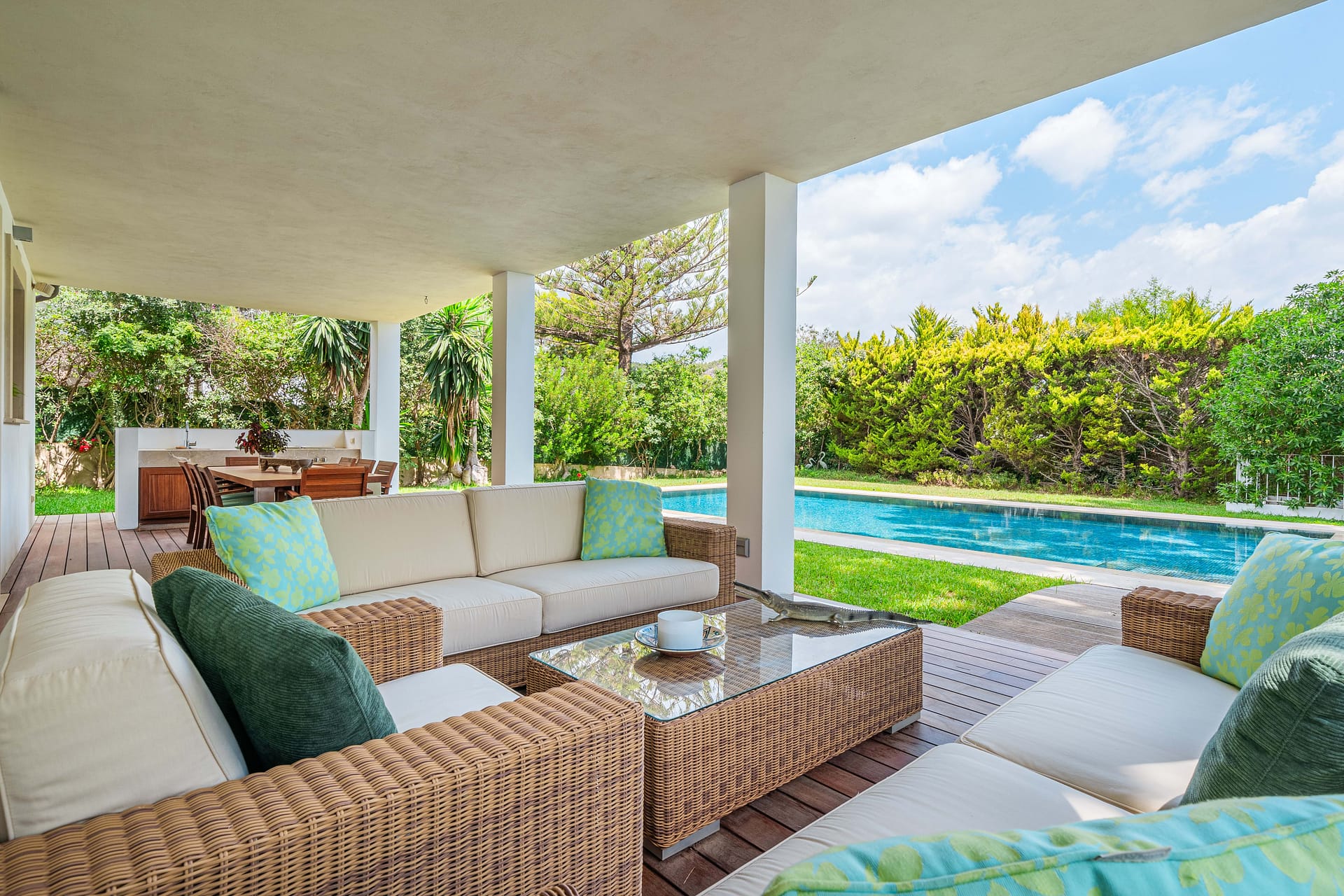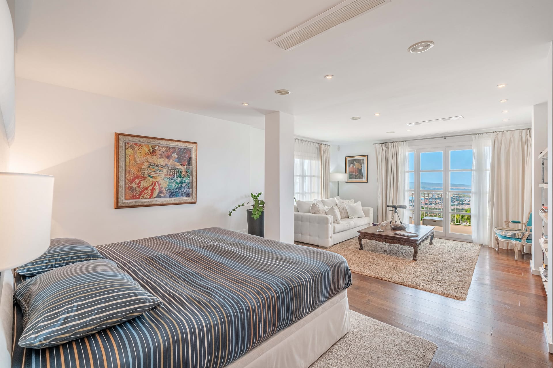 Nestled atop of Costa d’en Blanes, this exquisite villa boasts a captivating sea view and is situated on a serene cul-de-sac street. Just a brief 3-minute drive away lies the renowned Puerto Portals, while the vibrant city of Palma is a mere 8-minute journey. Moreover, this location provides easy access to a variety of esteemed international schools. Immersed in sunlight from dawn till dusk, the property offers a panorama that extends all the way to Ibiza on clear days. Graced with a level lawn garden, it presents dual views of Palma Bay and Palmanova Bay, rendering it ideal for both year-round family living and those in pursuit of a second home. The villa’s layout offers an expansive entrance hall guides you to a cozy living room featuring a fireplace, seamlessly transitioning into an open-plan kitchen and dining area. Additionally, a guest bedroom suite and guest powder room are found on this level. Flowing from the kitchen and dining space is a covered porch with a summer kitchen and grill, leading to the manicured lawn garden and a pool area styled with Balinese influences. As you ascend up the stairs in the entrance hall, you’ll reach a spacious primary bedroom suite with an adjoining lounge area and a private terrace that bestows breathtaking sea views. A second suite, complete with a sitting space, as well as an additional guest bedroom suite with a generously proportioned terrace overlooking the sea and mountains. Designed to ensure comfort throughout the entire year, the property is adorned with elegant wooden flooring, underfloor heating, and air conditioning. A well-appointed Birgit Mueller kitchen, a separate laundry room, an irrigation system, and a garage further enhance the amenities of this home.